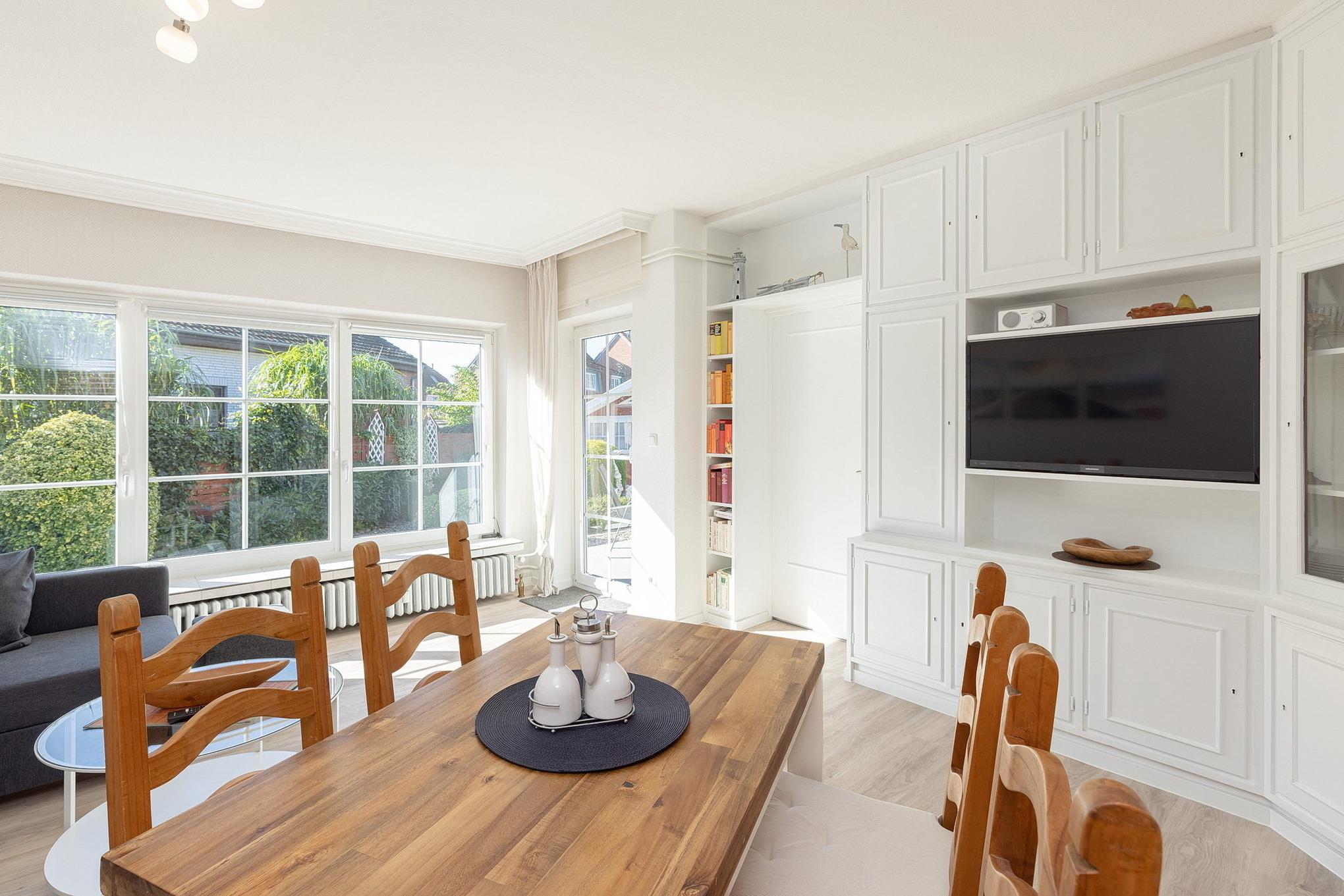 Lichtdurchfluteter Wohnbereich mit direktem Zugang zur Terrasse und zum Garten. Das Wohnzimmer ist ausgestattet mit einer 3er- Eckcouch mit Schlaffunktion und einem gemütlichen Sessel sowie einem Essbereich, der Platz für 4 Personen bietet. Zur Unterhaltung steht ein Flachbildfernseher zur Verfügung. Der Raum ist mit hochwertigem Designvinylboden ausgelegt und die Fenster lassen sich durch Innenrollos verdunkeln.