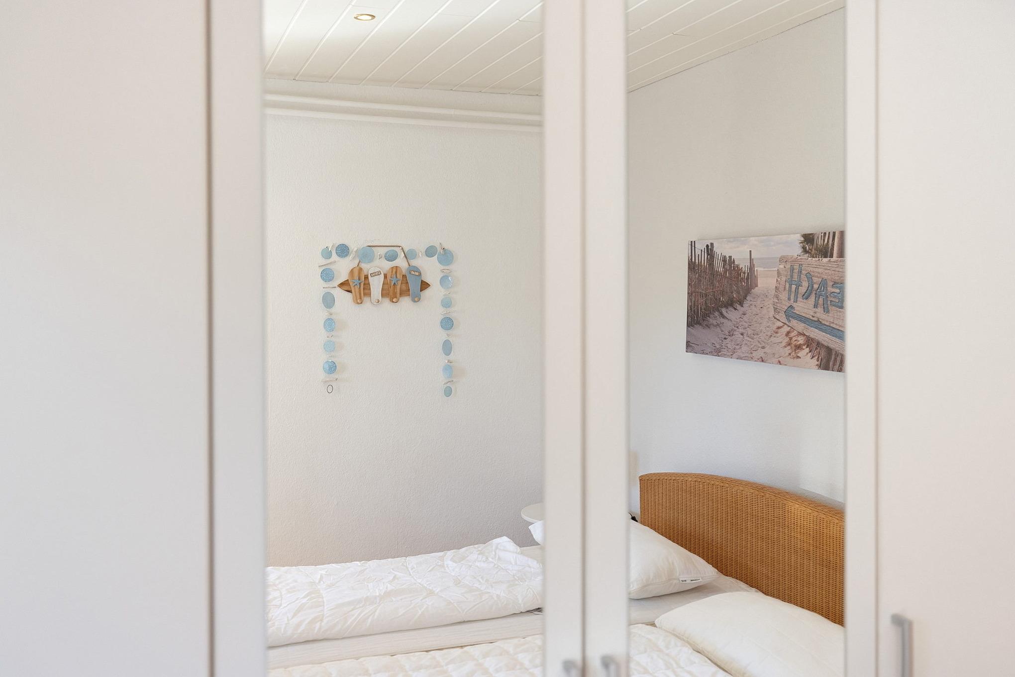 Das Schlafzimmer verfügt über einen 4-türigen Kleiderschrank und ein Doppelbett (2x90x200cm) mit einer wendbaren Matratze (Mittelfest und Fest), welche es ermöglicht den Härtegrad individuell anzupassen. Das Zimmer ist mit hochwertigem Designvinylboden ausgelegt, das Fenster lässt sich durch ein Innenrollo blickdicht verdunkeln.