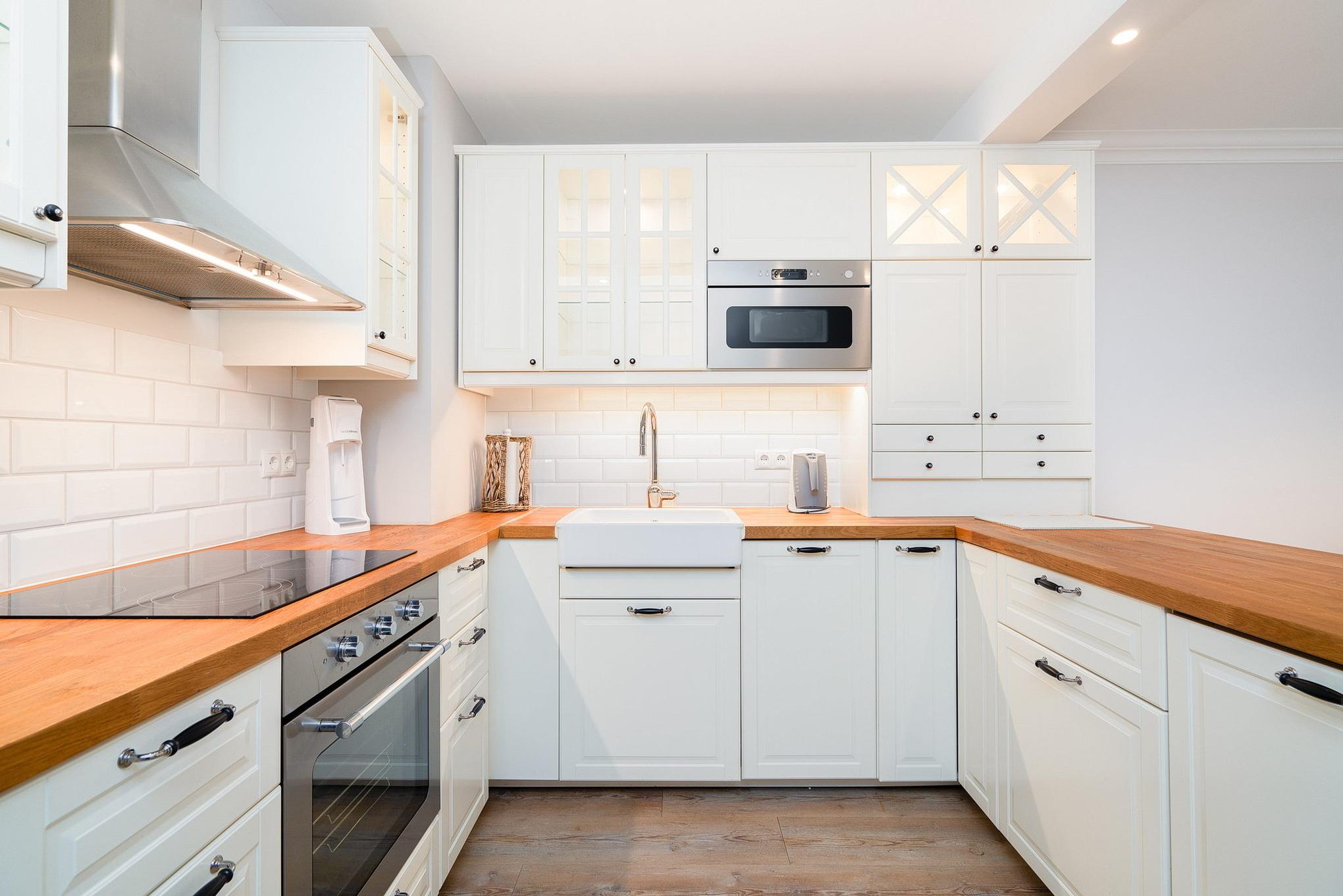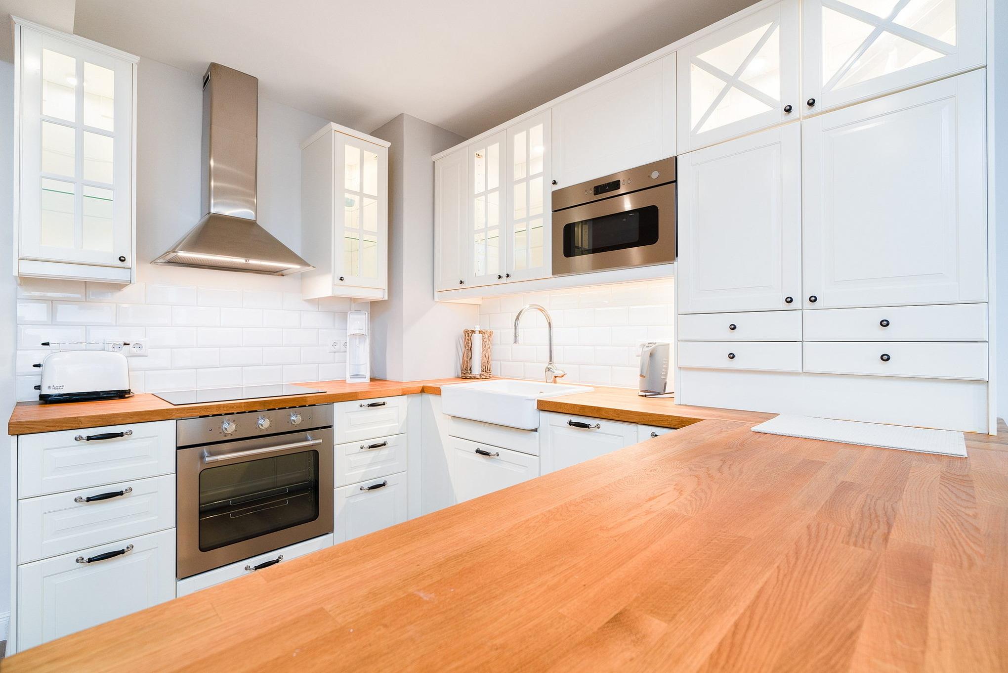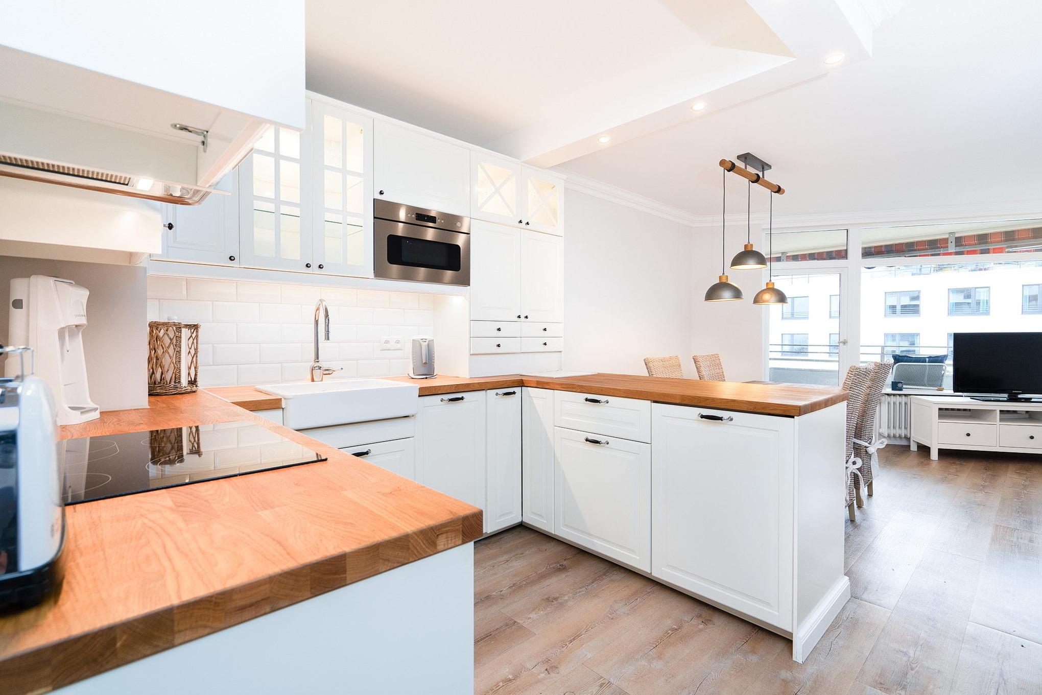 Moderne, zum Wohn- und Esszimmer offene, komplett eingerichtete Küche mit 4 Platten Cerankochfeld, Backofen, Spülmaschine, Kühlschrank, Mikrowelle, Toaster, Wasserkocher und Kaffeemaschine.