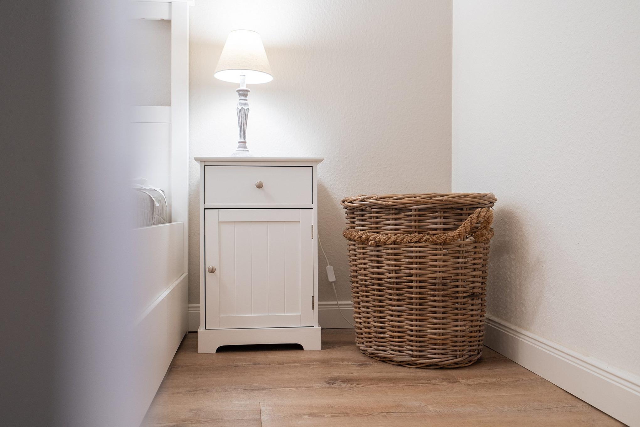 In dem Kinderzimmer befindet sich ein ausziehbares Bett und ebenfalls ein Kleiderschrank. Das Zimmer lässt sich durch einen Vorhang etwas verdunkeln.