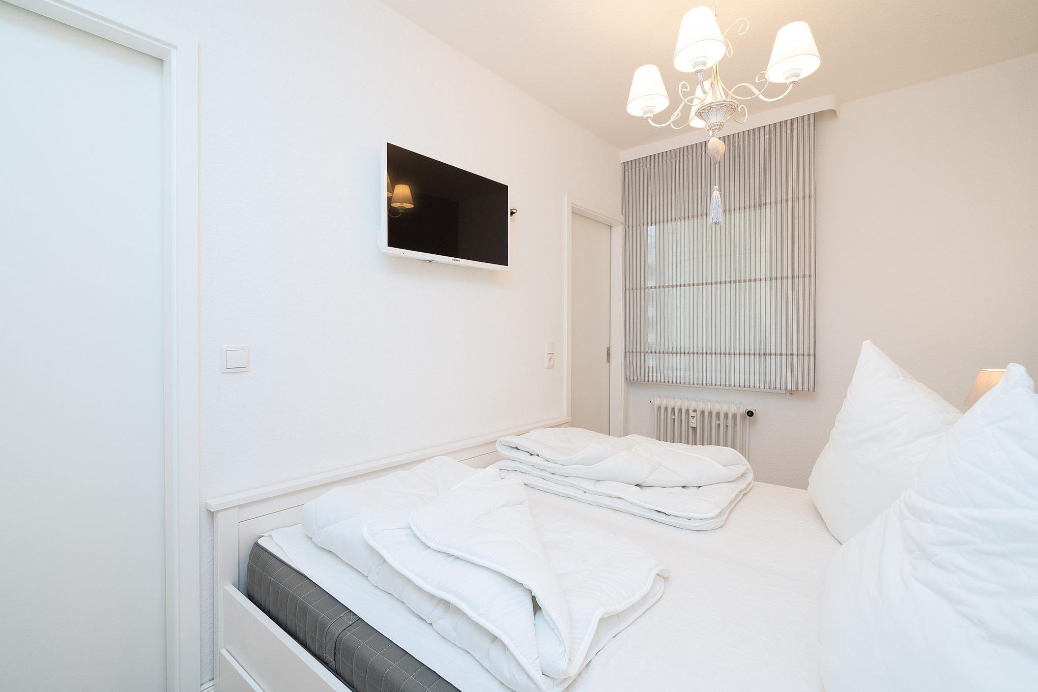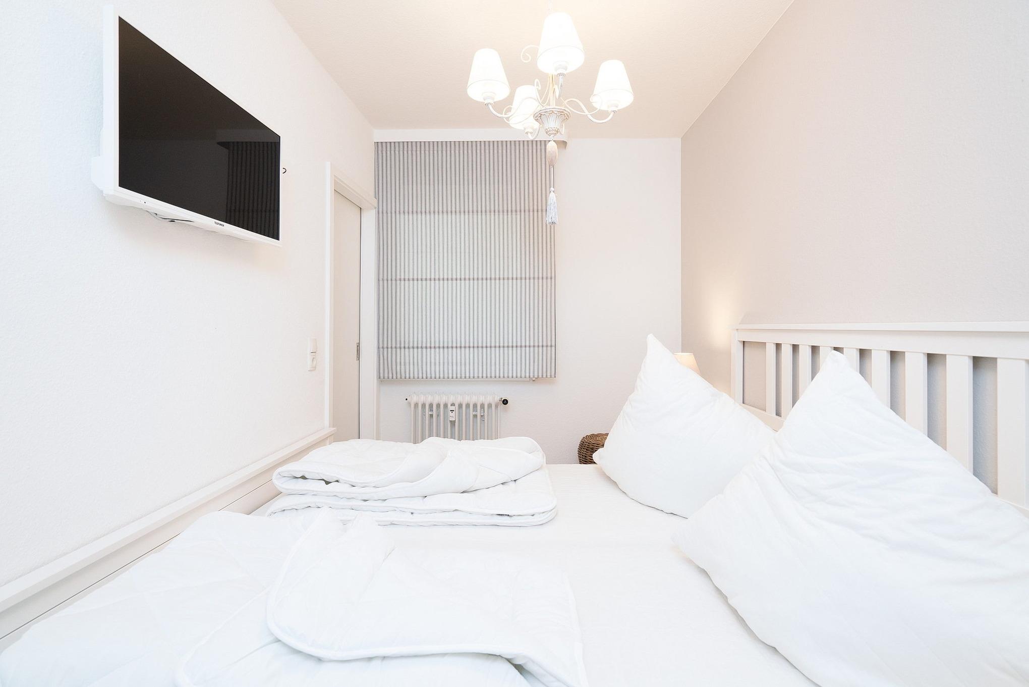 Freundliches, helles Schlafzimmer mit TV, einem Doppelbett und 2 Nachttischen und einem Kleiderschrank. Das Fenster lässt sich durch einen Vorhang etwas verdunkeln.