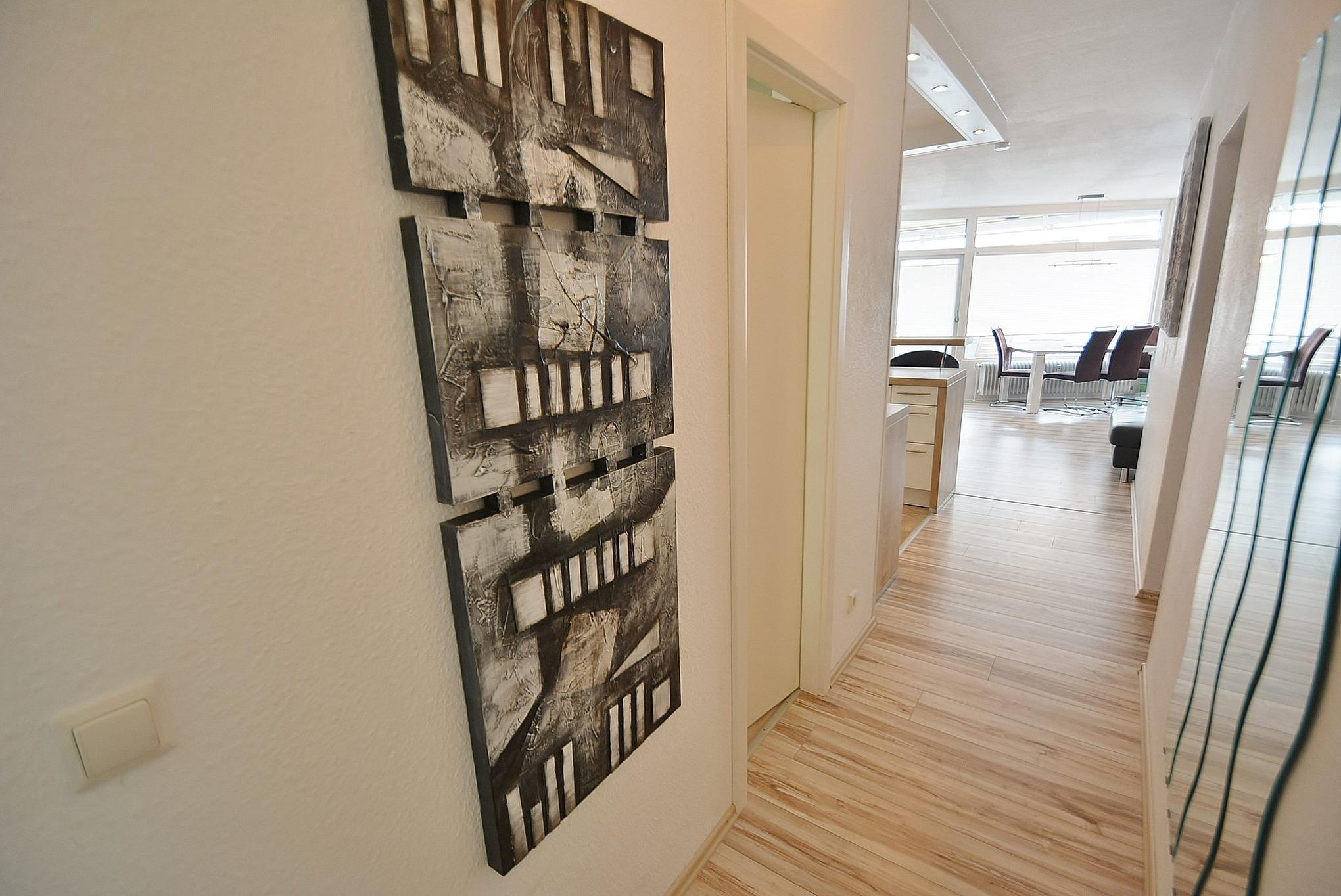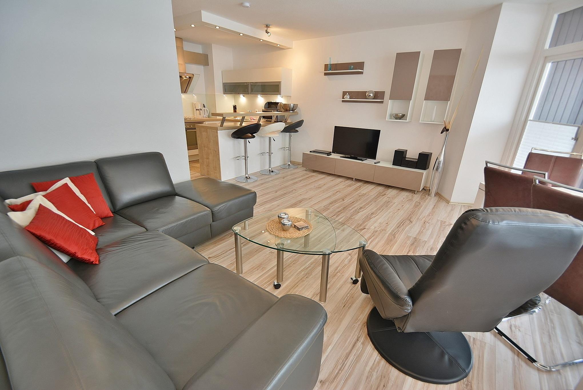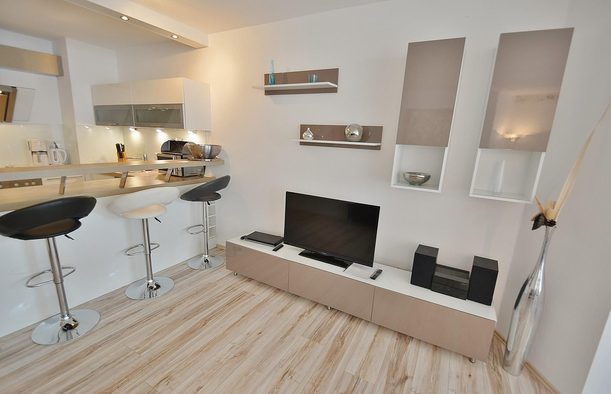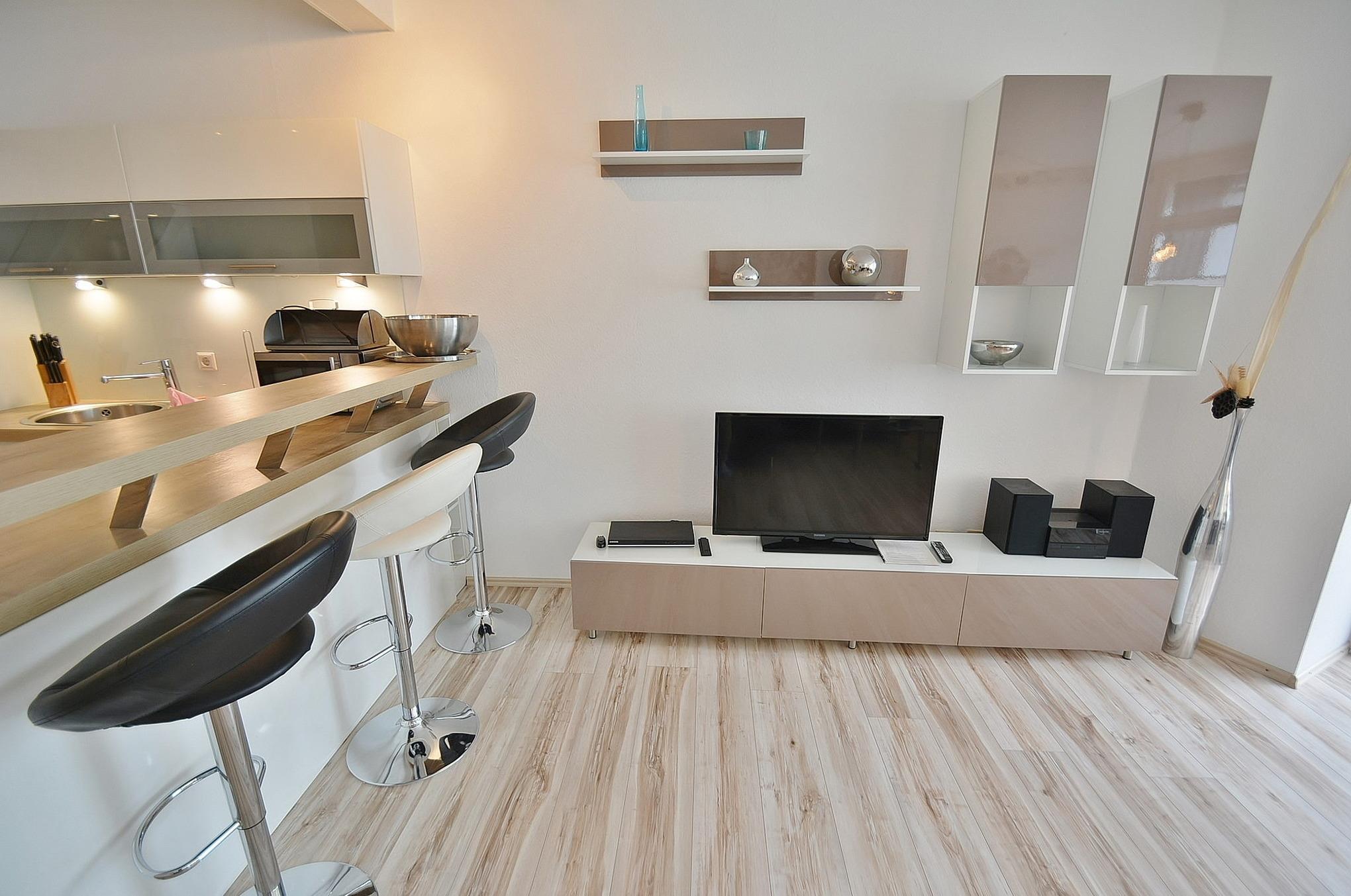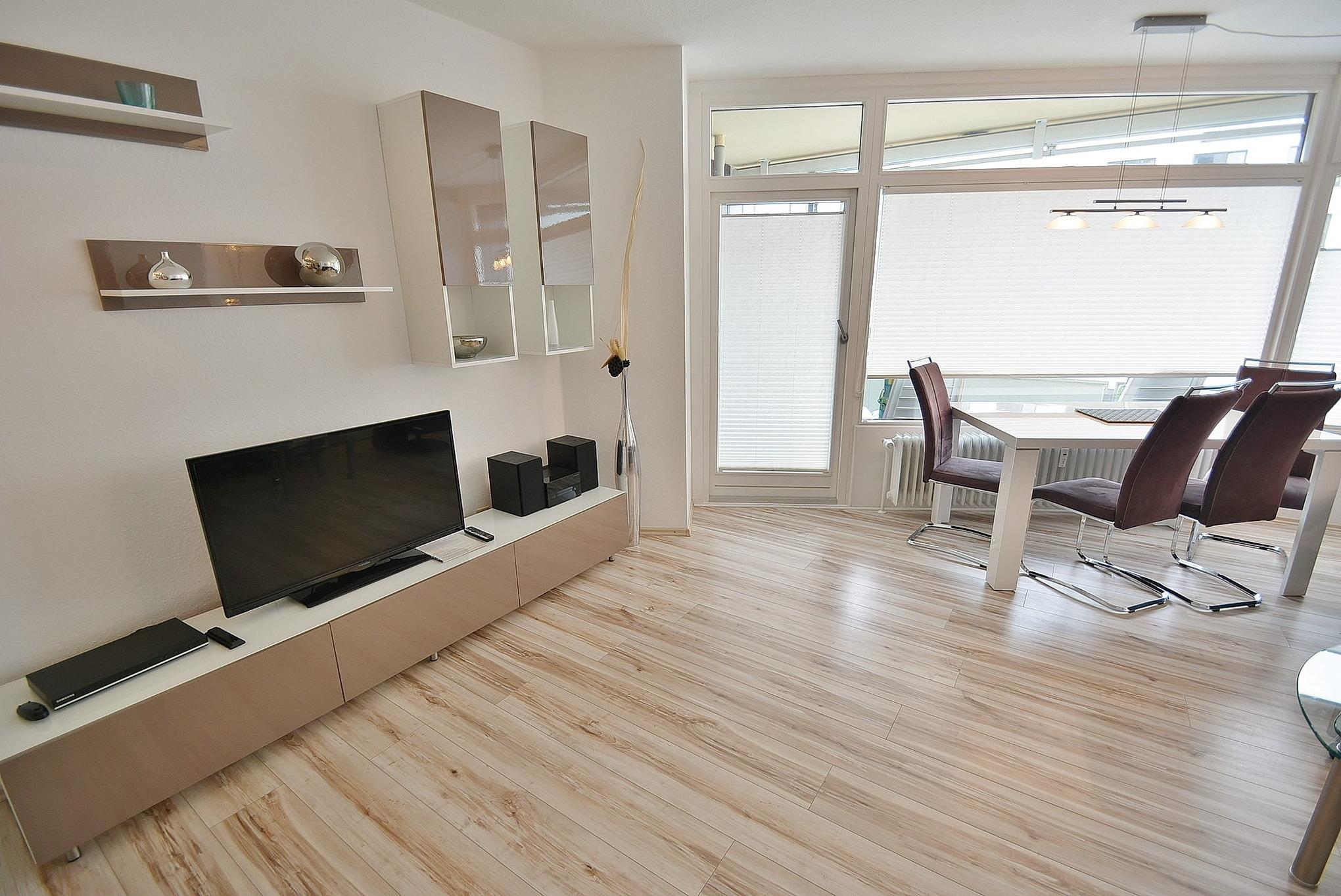 Helles, freundliches, modernes und hochwertig ausgestattetes Wohn- und Esszimmer mit direktem Zugang zum sonnigen Balkon. Das Wohn- und Esszimmer ist mit einem Essplatz für 4 Personen, einer Eckledercouch und einem bequemen Ledersessel, einem Couchtisch und einem Wohnzimmerschrank ausgestattet. Zur Unterhaltung stehen ein Flachbildfernseher und eine Mini-Stereoanlage[nbsp] zur Verfügung. Das Wohn- und Esszimmer ist mit Laminatboden ausgelegt.