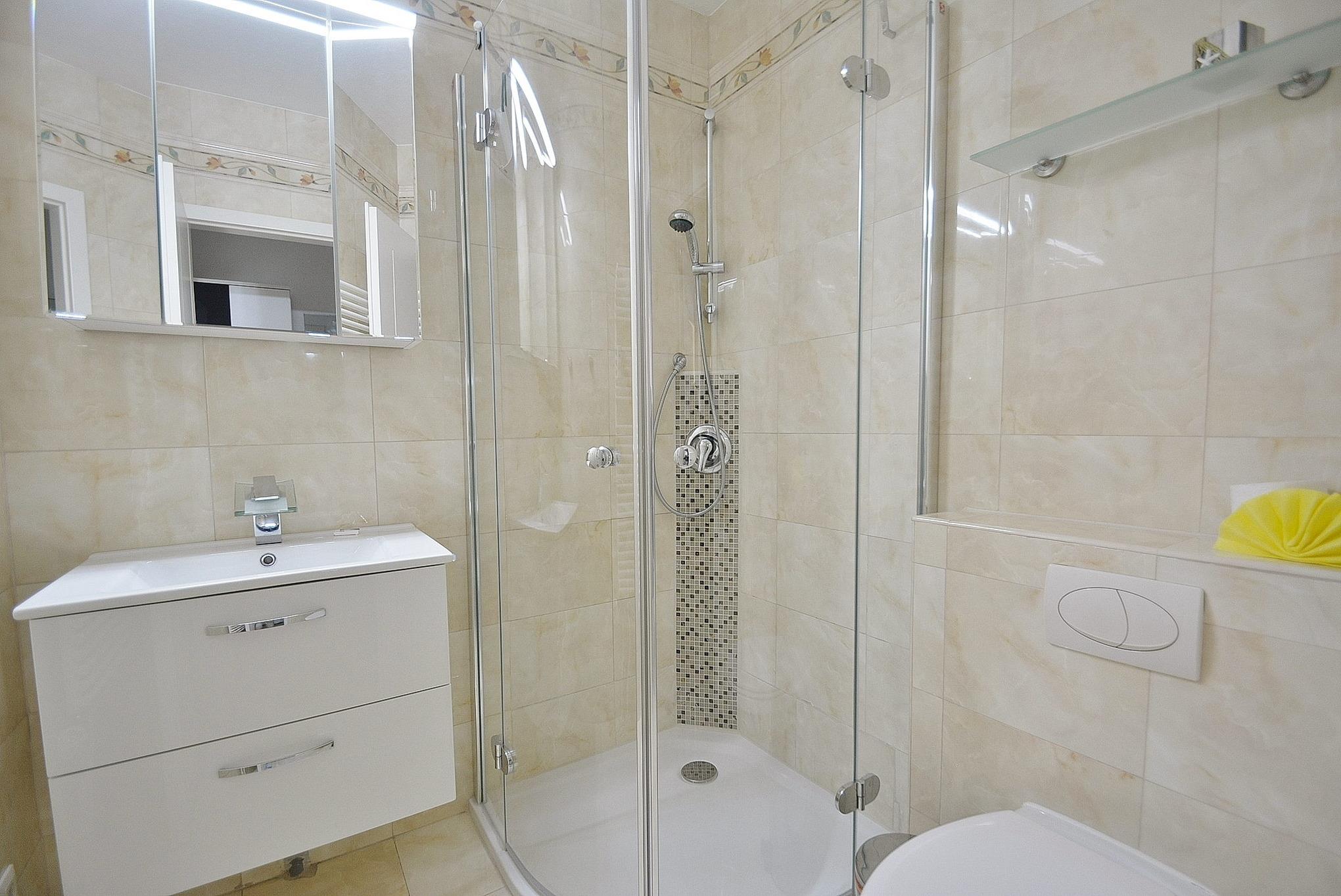 Modernes, hell gefliestes Badezimmer mit Dusche, WC und Waschbecken.