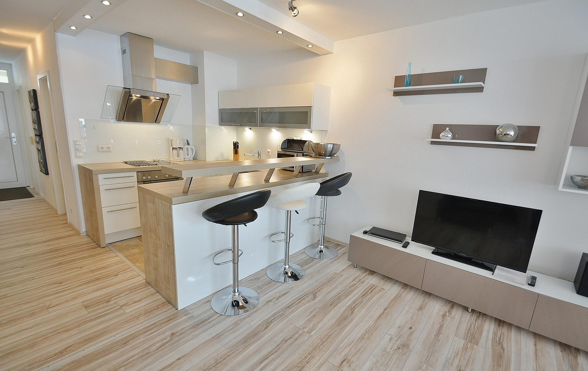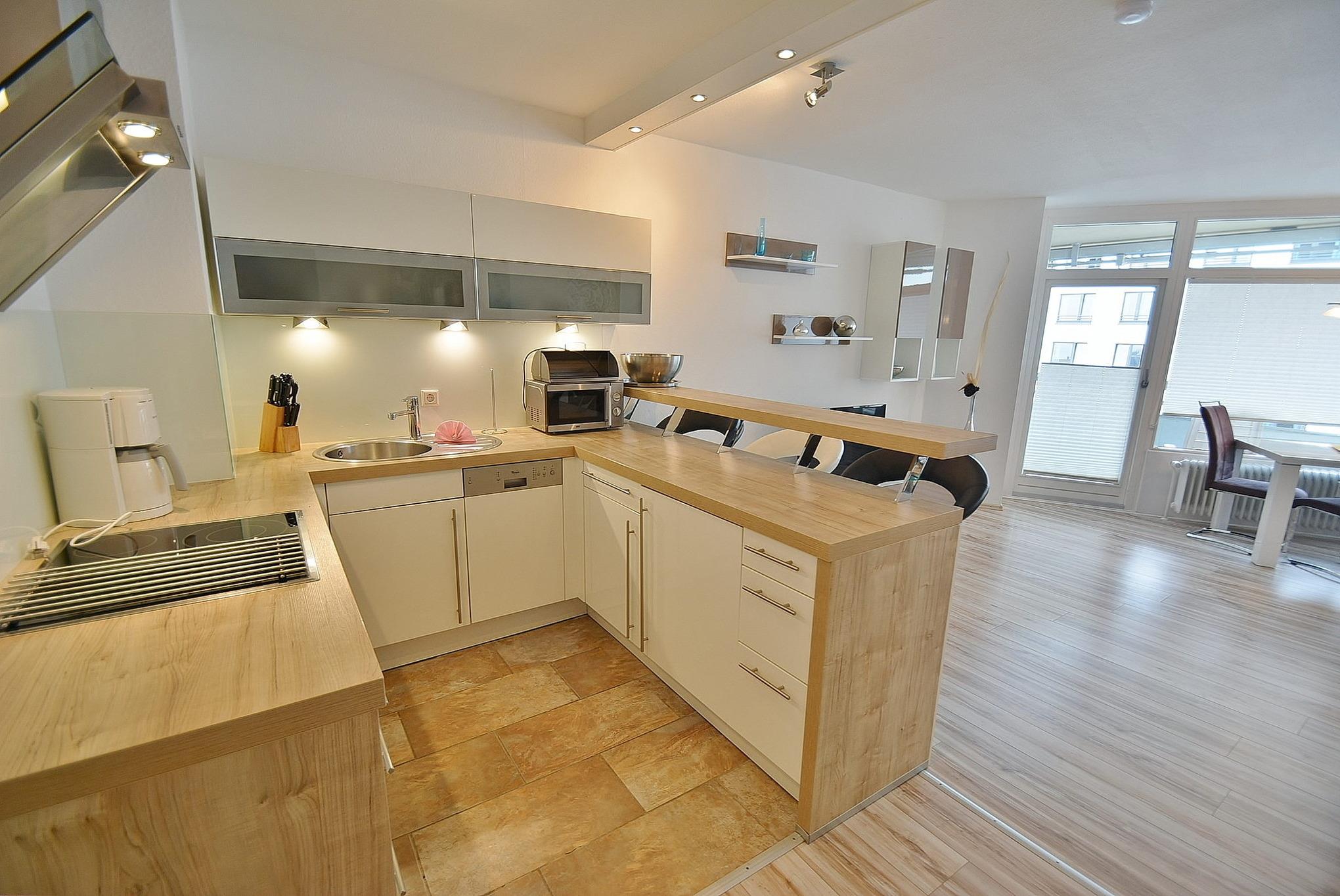 Moderne, komplett ausgestattete, zum Wohn- und Esszimmer offene Küche mit 4 Platten E-Herd, Backofen, Spülmaschine, Kühlschrank mit kleinem 3-Sterne Gefrierfach, Mikrowelle, Kaffeemaschine, Toaster, Wasserkocher und Handmixer.