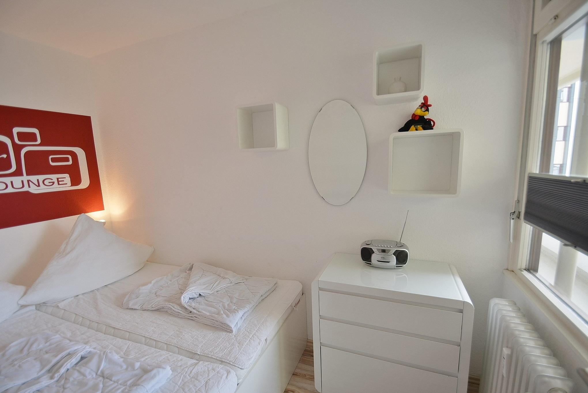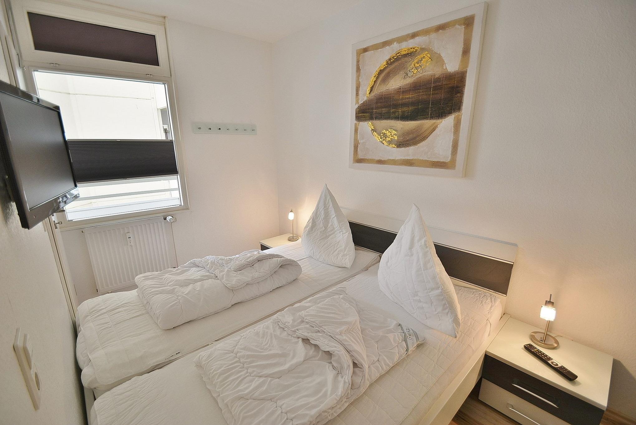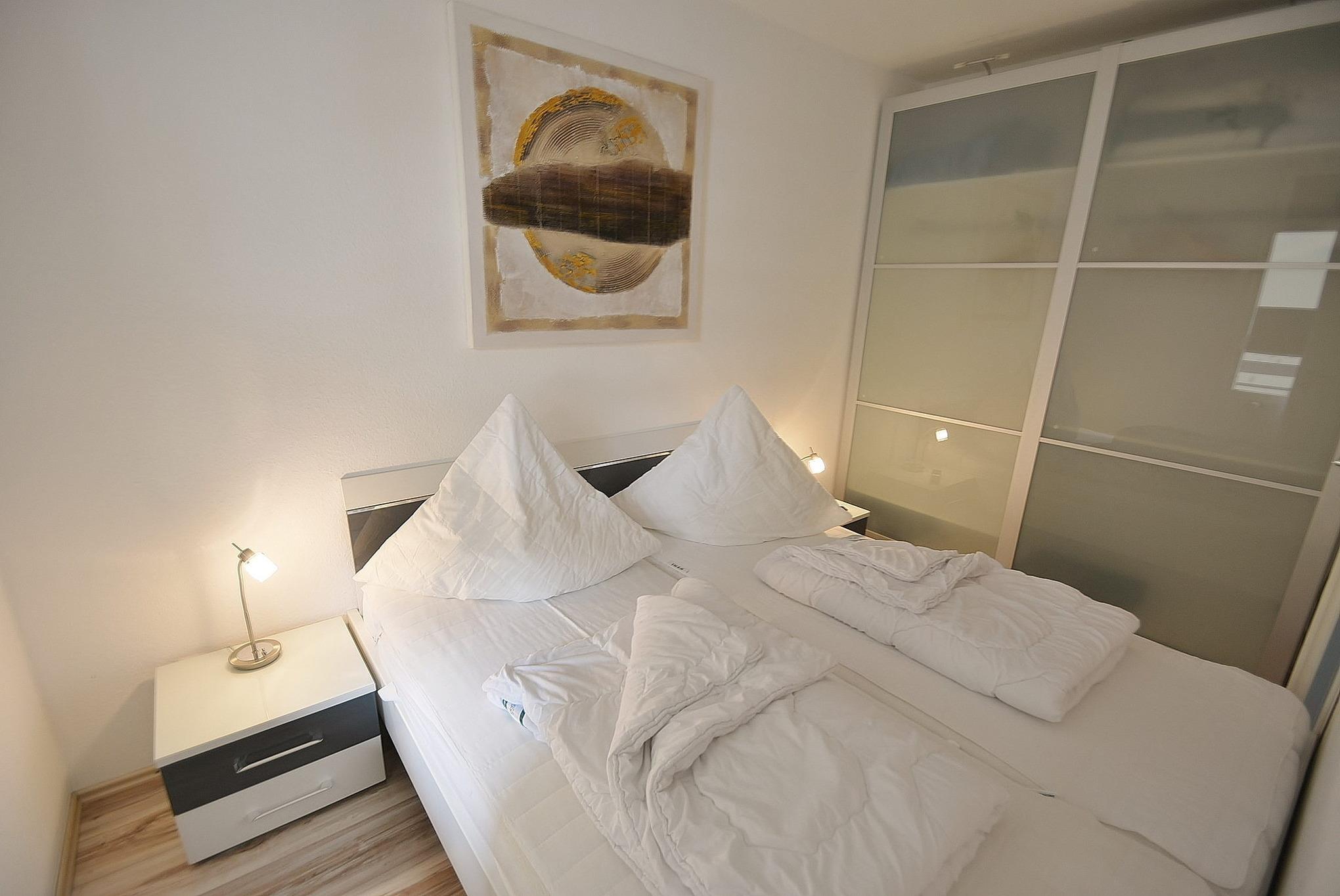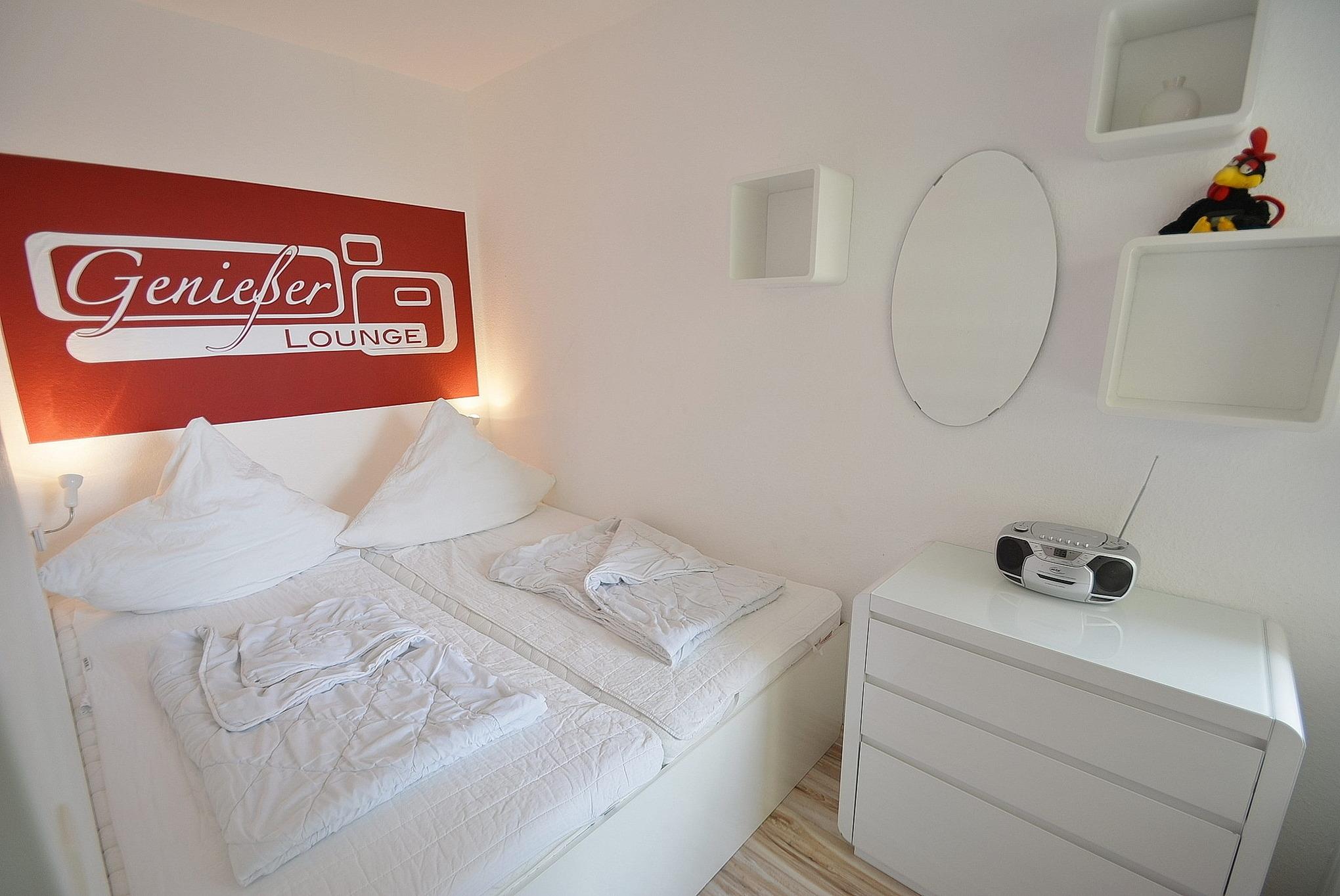 Modernes, separates Schlafzimmer mit einem Doppelbett (2x 90x200cm), 2 Nachttischen und einem Kleiderschrank. Das Schlafzimmer ist mit Laminatboden ausgelegt. Das Fenster zum Laubengang lässt sich durch ein Innenrollo blickdicht verdunkeln. Zur Unterhaltung steht ein Flachbildschirm mit DVD-Player zur Verfügung.