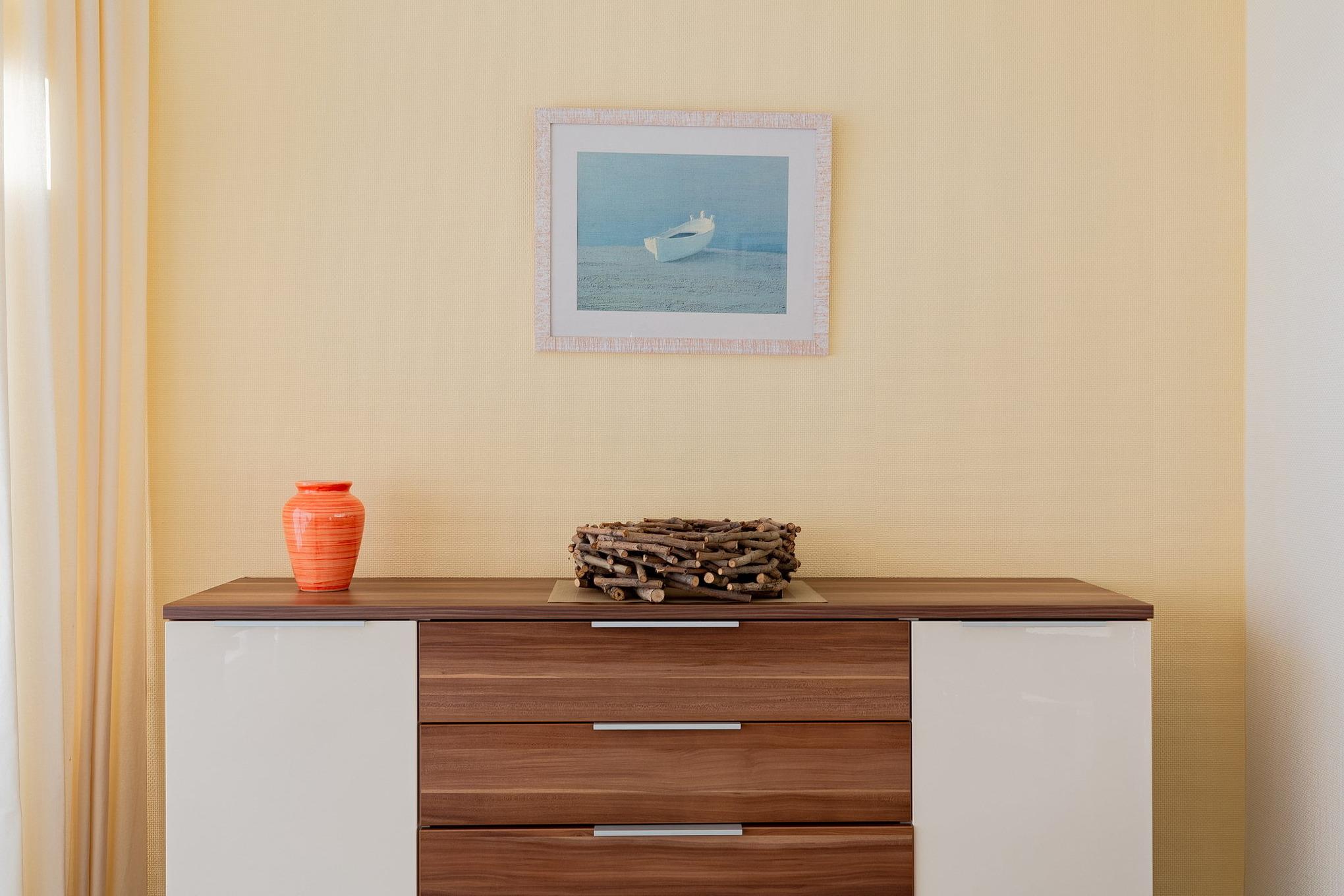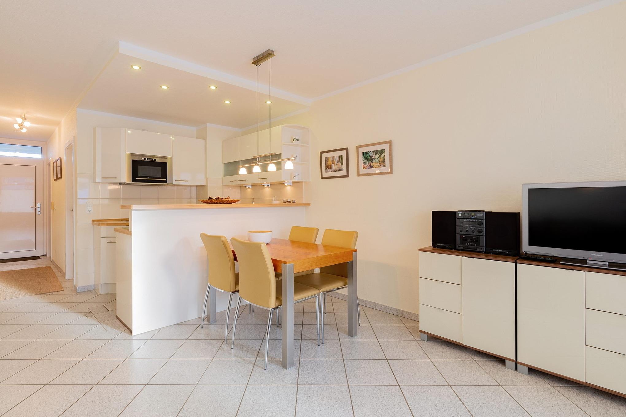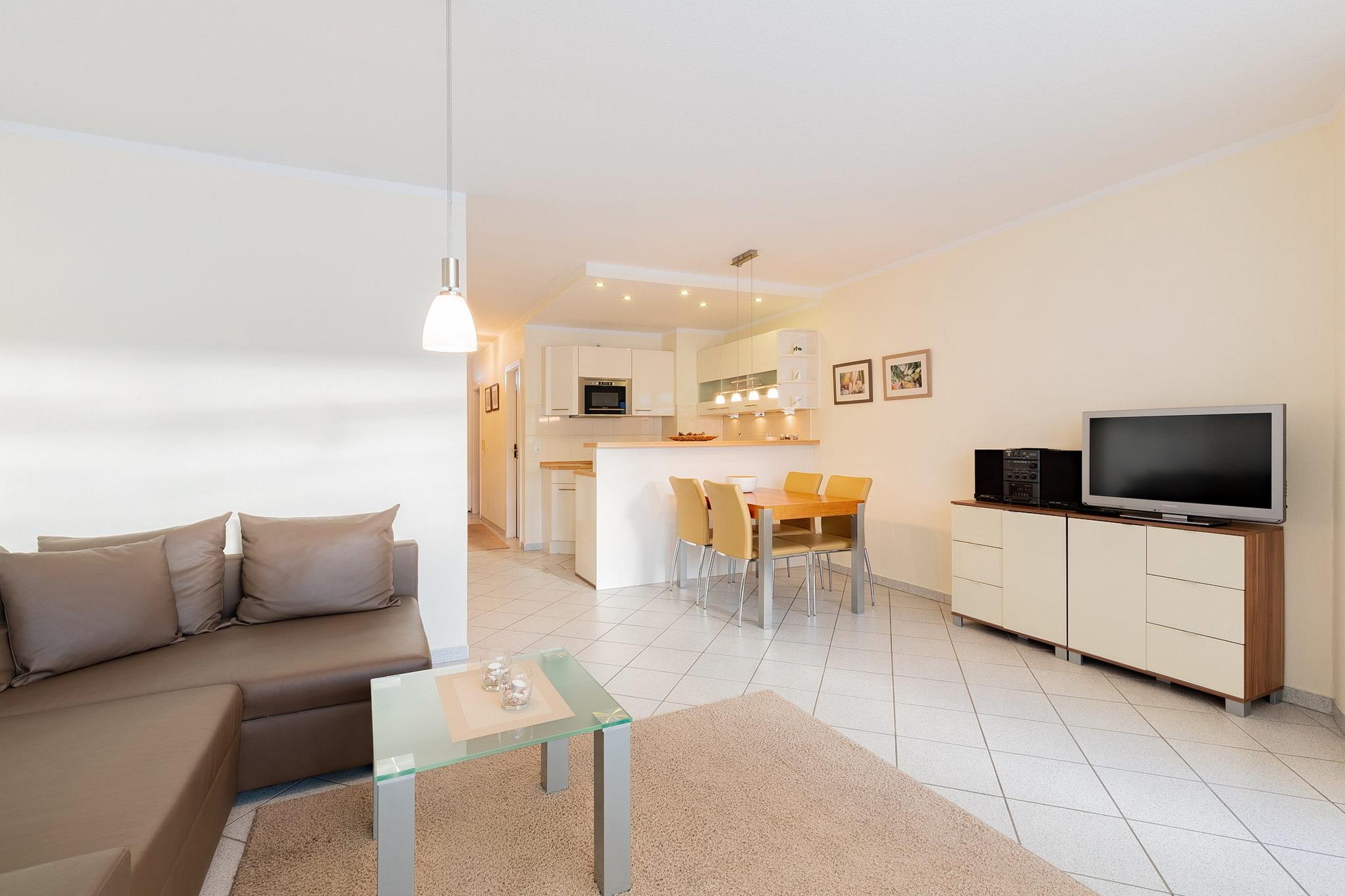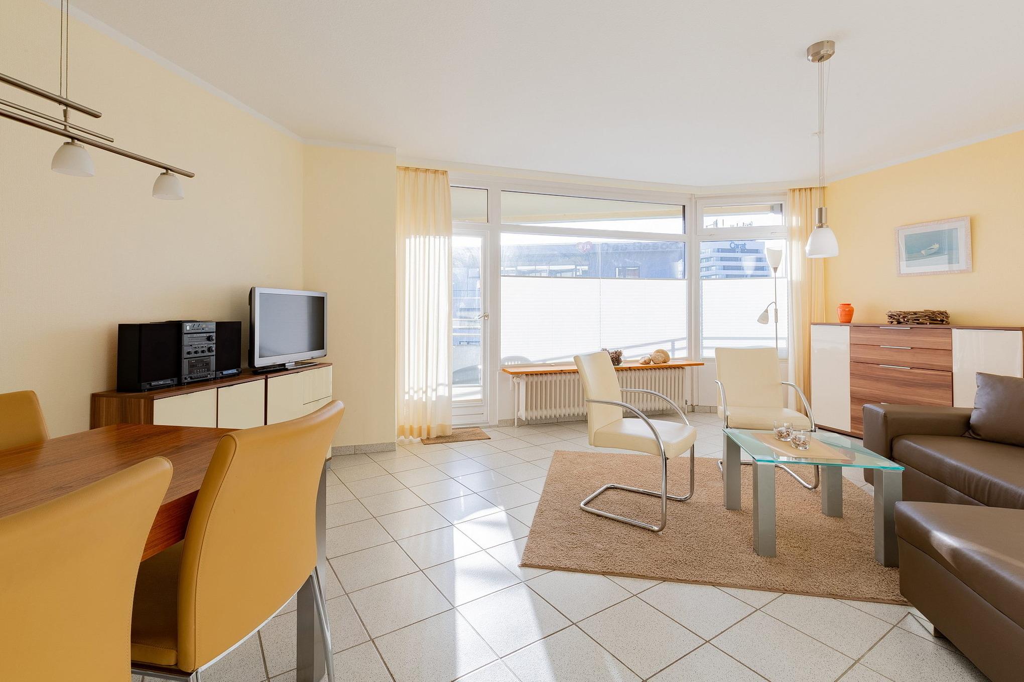 Modernes, helles, freundliches Wohn- und Esszimmer mit direktem Zugang zum Balkon. Das Wohn- und Esszimmer ist mit einem Essplatz für 4 Personen, einer Eckcouch, einem Couchtisch, einem Sessel und einer Kommode ausgestattet. Zur Unterhaltung steht ein Flachbildschirm mit Kartenleser und eine Mini-Stereoanlage zur Verfügung. Das Zimmer ist gefliest.