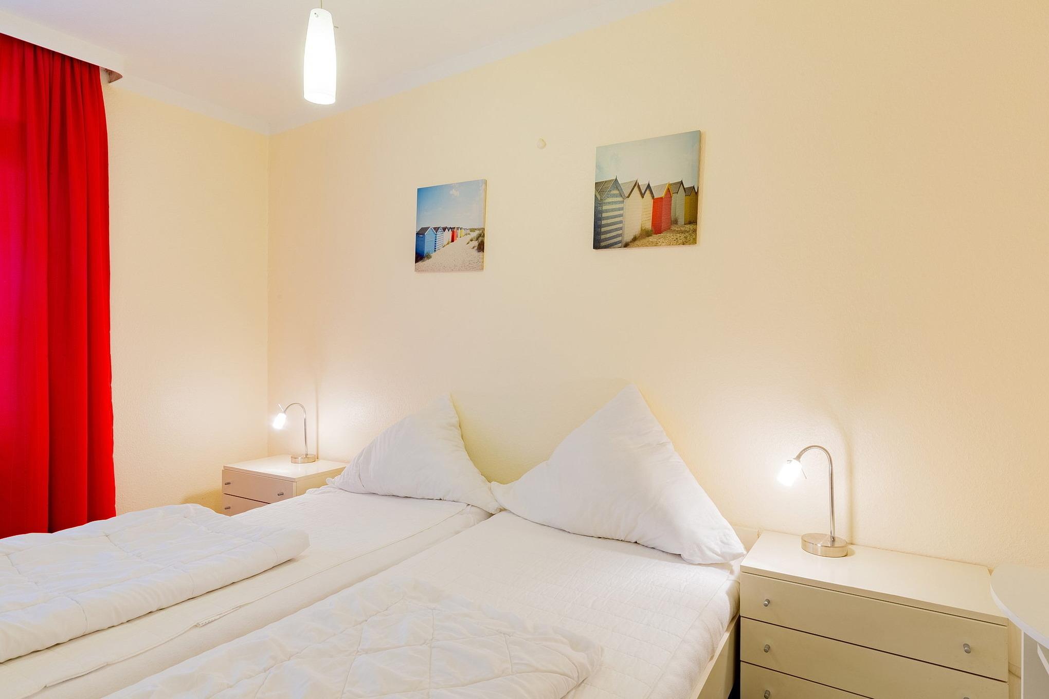 Freundliches, hell gefliestes Schlafzimmer mit einem Doppelbett (2x 90x200cm) und 2 Nachttischen. Ein Kleiderschrank befindet sich im Vorraum zum Bad. Das Fenster lässt sich durch einen Vorhang etwas verdunkeln.