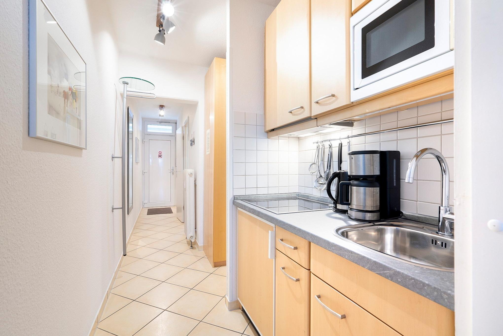 Moderne, hochwertige, komplett eingerichtete Pantry-Küche im Flur mit 4 Flammen Herd, Kühlschrank mit kleinem 3 Sterne Gefrierfach, Mikrowelle, Wasserkocher, Toaster und Kaffeemaschine.