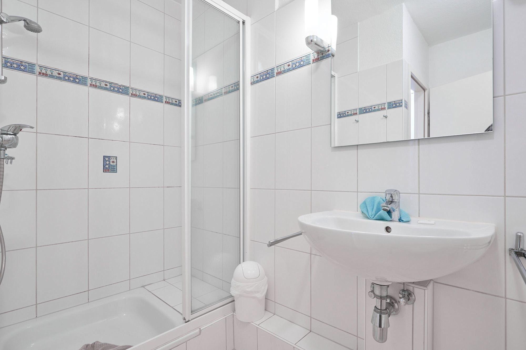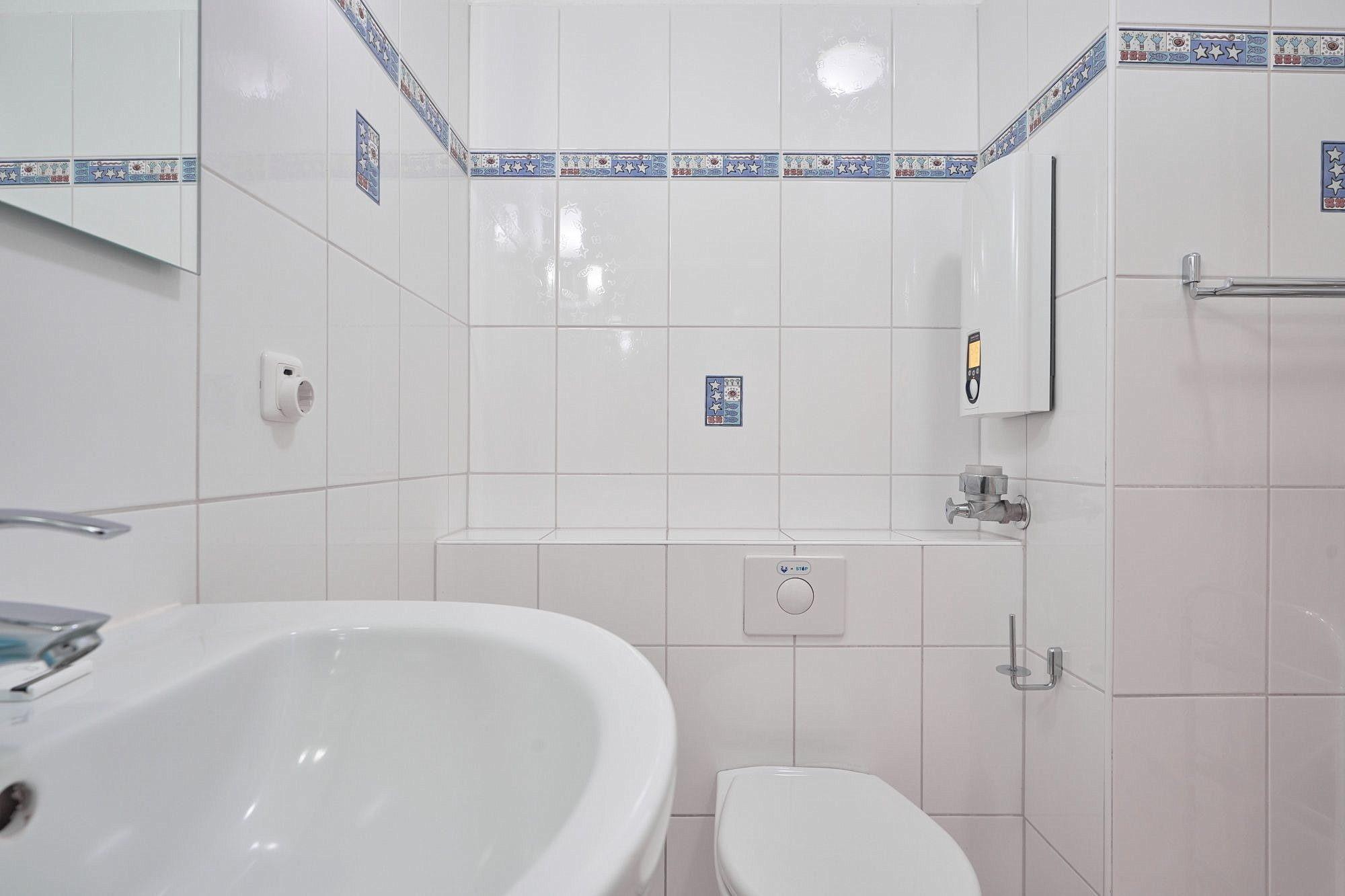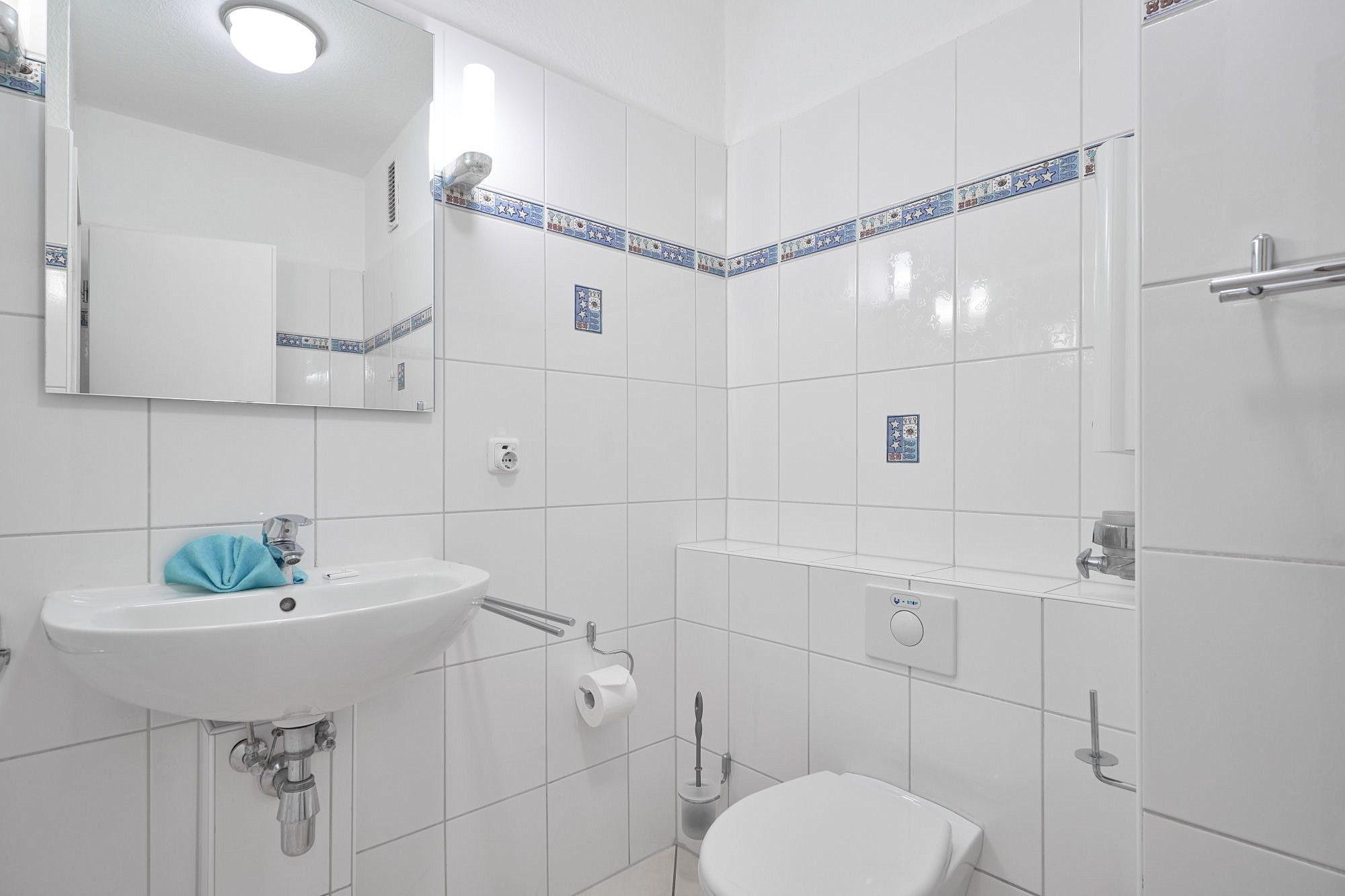 Modernes, freundliches, hell gefliestes Bad mit Dusche, Toilette und Waschbecken.