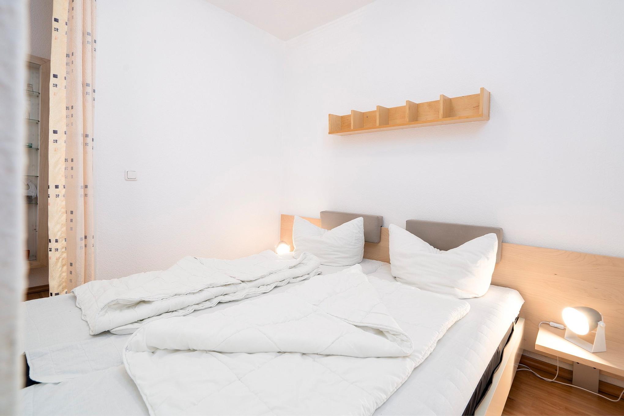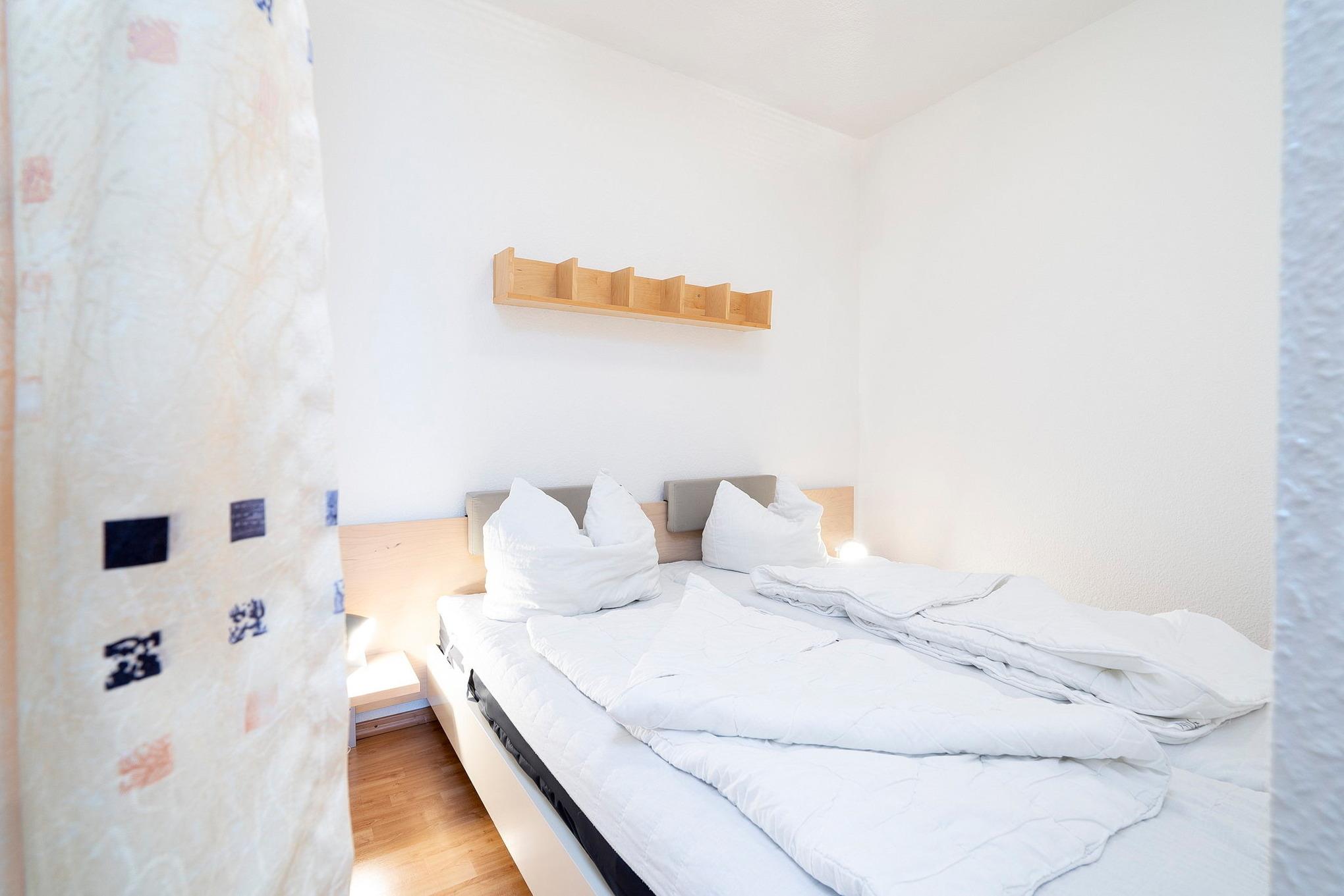 Vom Wohn- und Esszimmer durch eine Wand abgetrennter, moderner Schlafbereich mit einem Doppelbett (2x 80x200cm). Der Schlafbereich ist mit Laminatboden ausgelegt. Vorhänge an den Durchgängen dunkeln den Raum ab. Ein Kleiderschrank befindet sich im Flur.