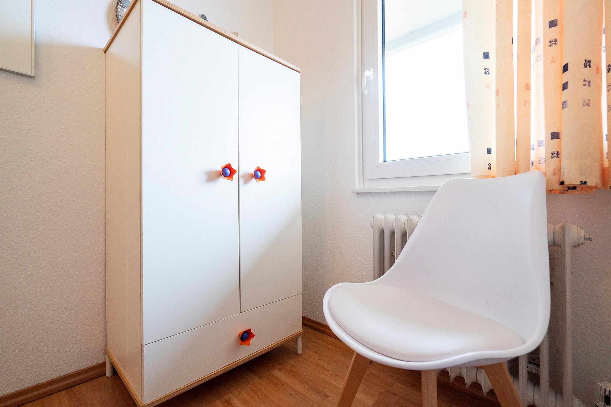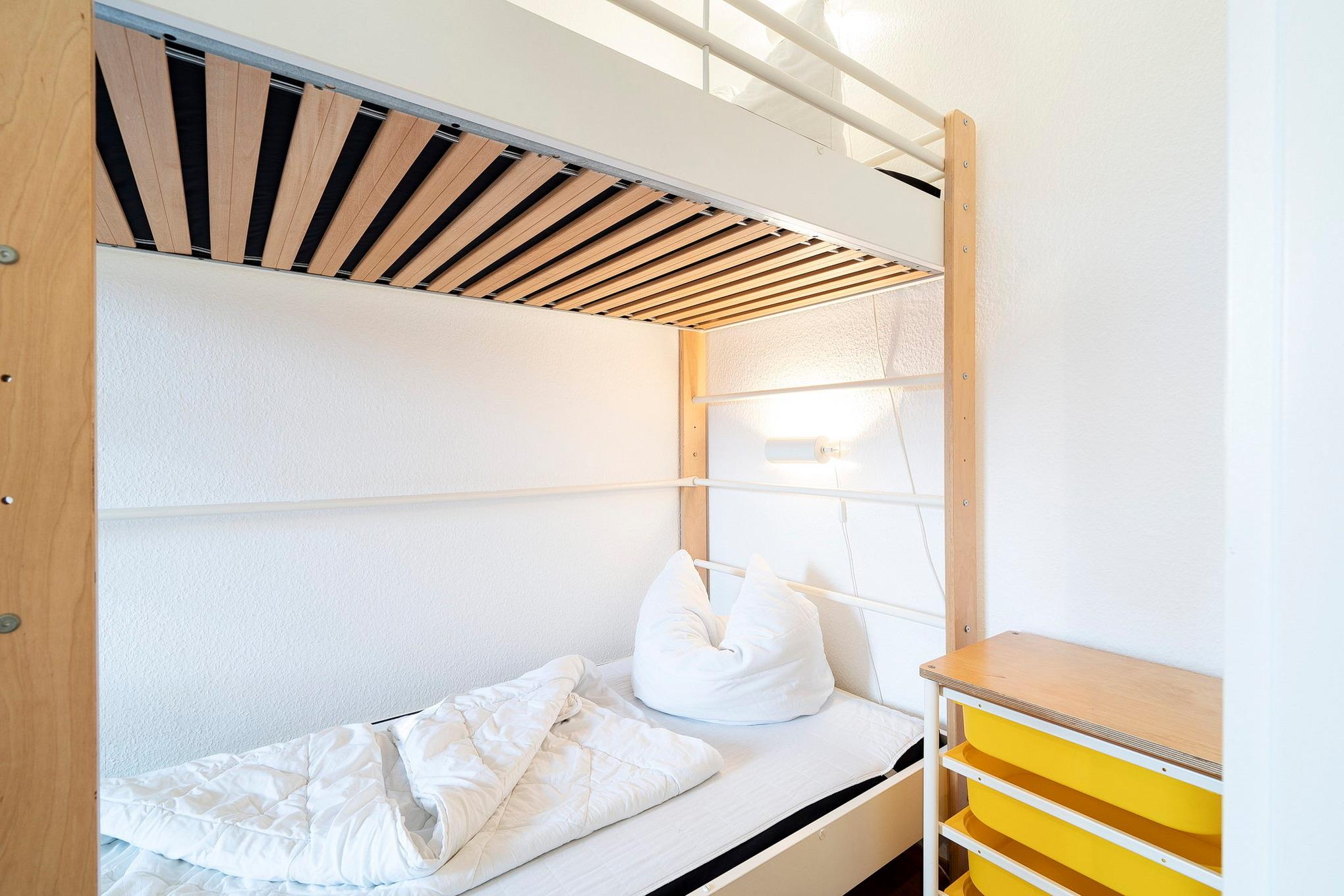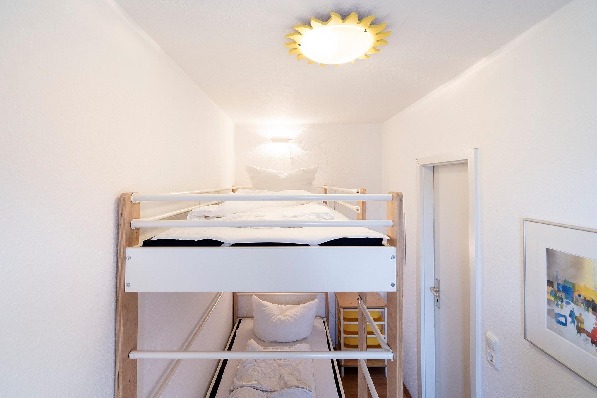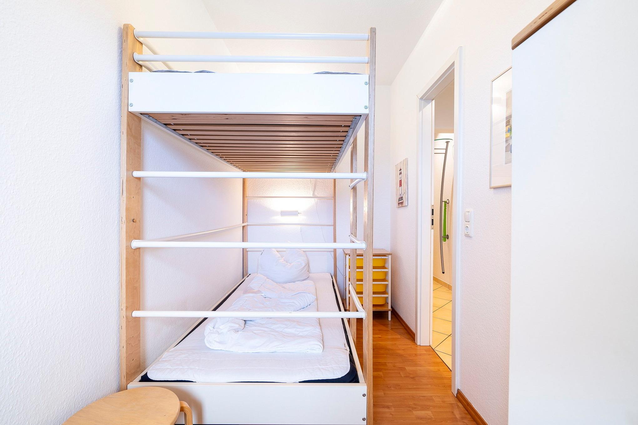 Kleines separates Zimmer mit einem Etagenbett für 2 Kinder (90 x 200 cm), kleiner Schrank, Laminatfußboden und Fenster zum Laubengang. Das Fenster lässt sich durch elektrische Rollladen verdunkeln.