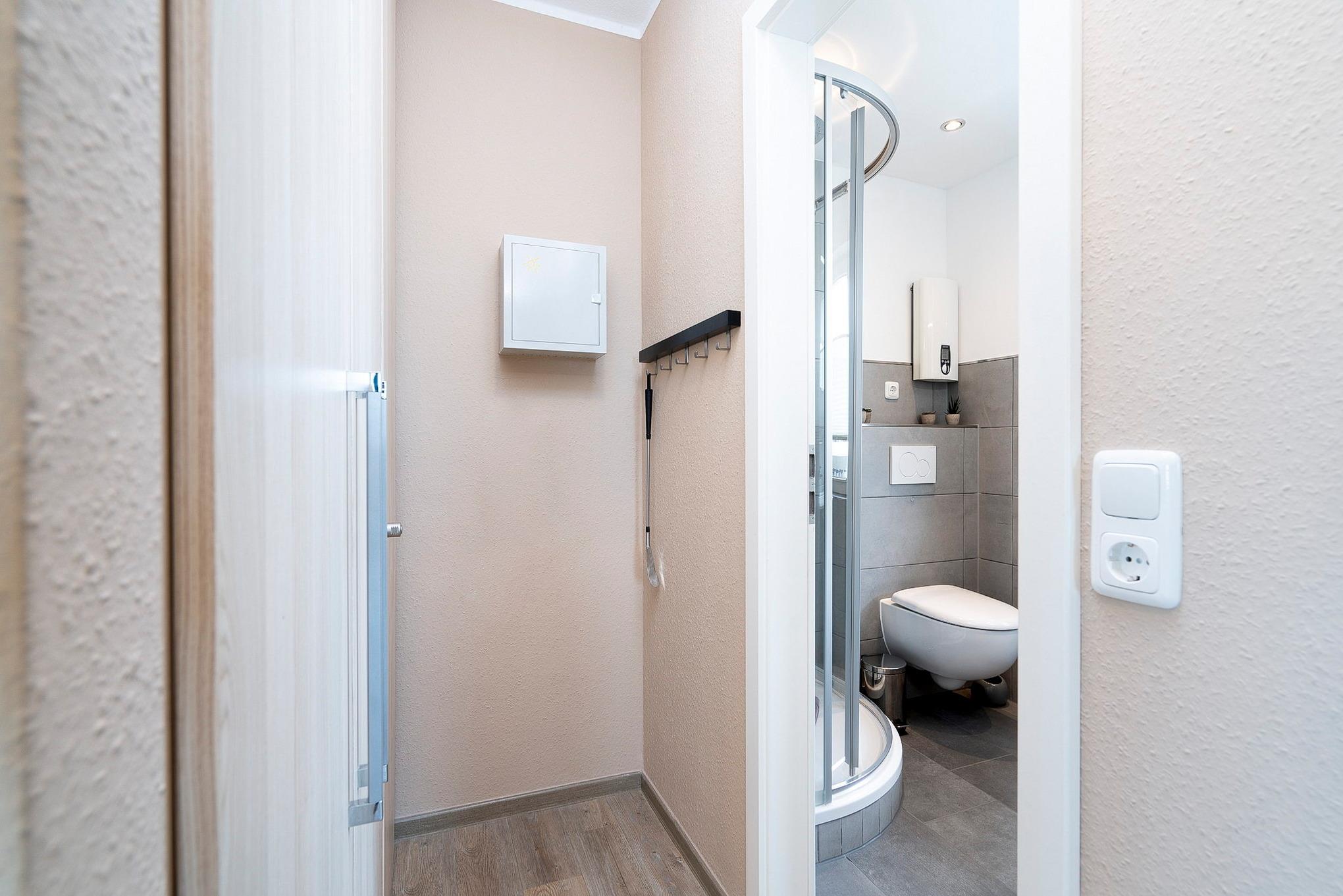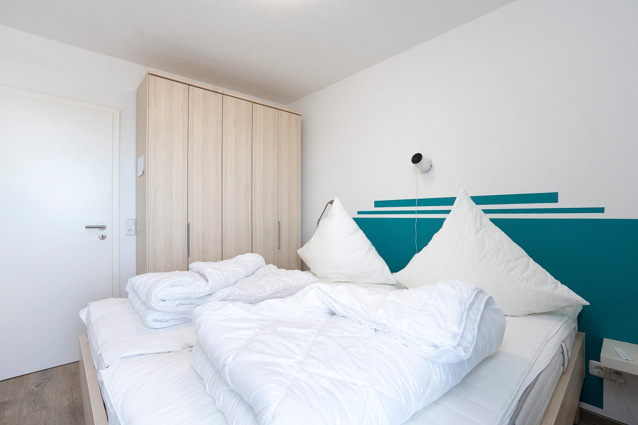 Das modern ausgestattete Schlafzimmer ist mit einem Doppelbett (2x 90x200cm) und einem Kleiderschrank ausgestattet. Das Schlafzimmer ist mit Designer-Planken ausgelegt und verfügt über einen direkten Zugang zum Balkon. Das Fenster lässt sich durch einen dichten Vorhang verdunkeln.[nbsp] Außerdem gibt es einen Smart-TV-Beamer, mit dem Sie die Möglichkeit haben neben dem normalen TV-Programm, sich in Ihre Apps (Netflix und Co.) einzuloggen.