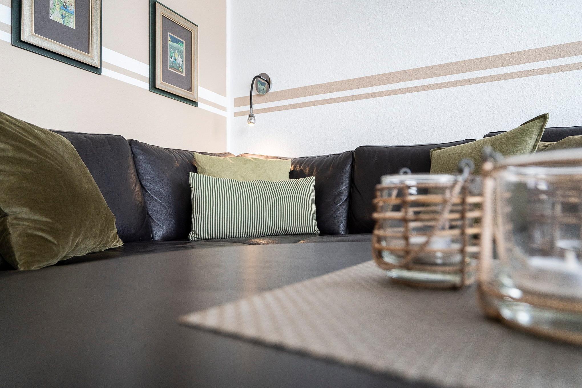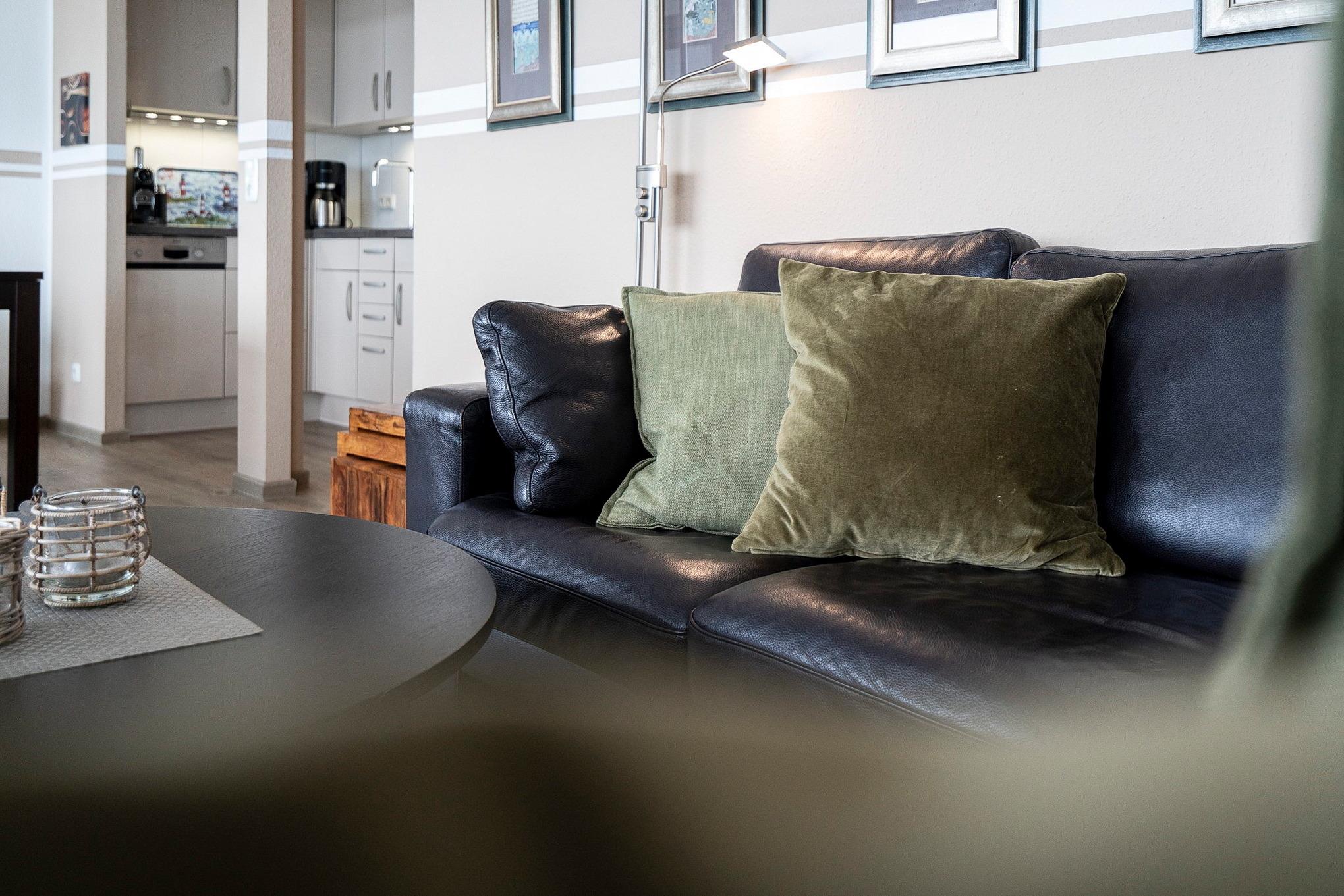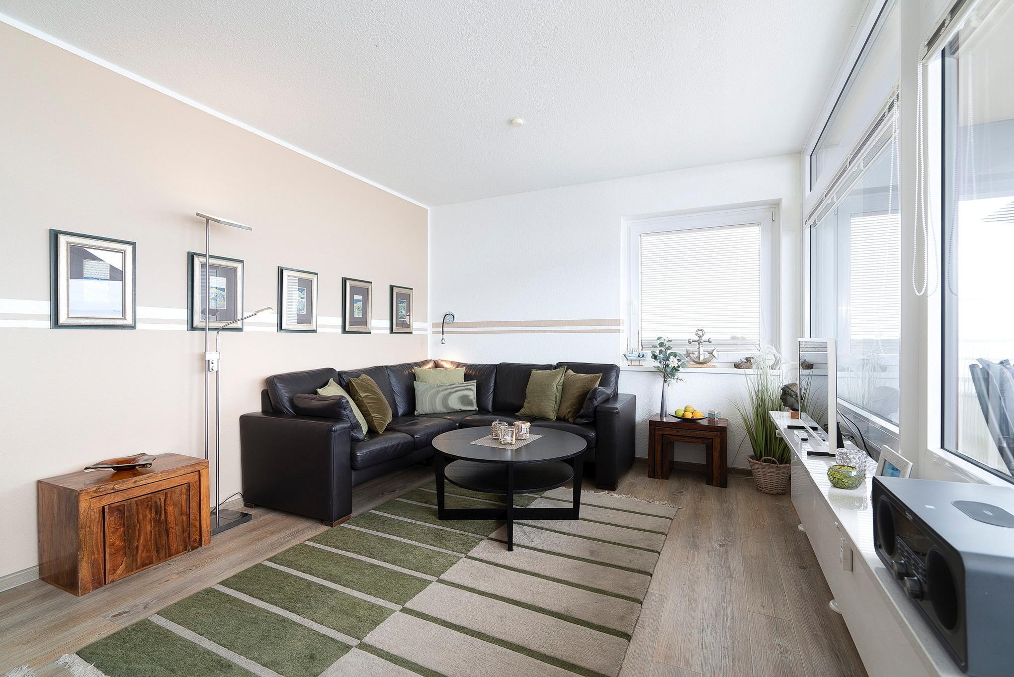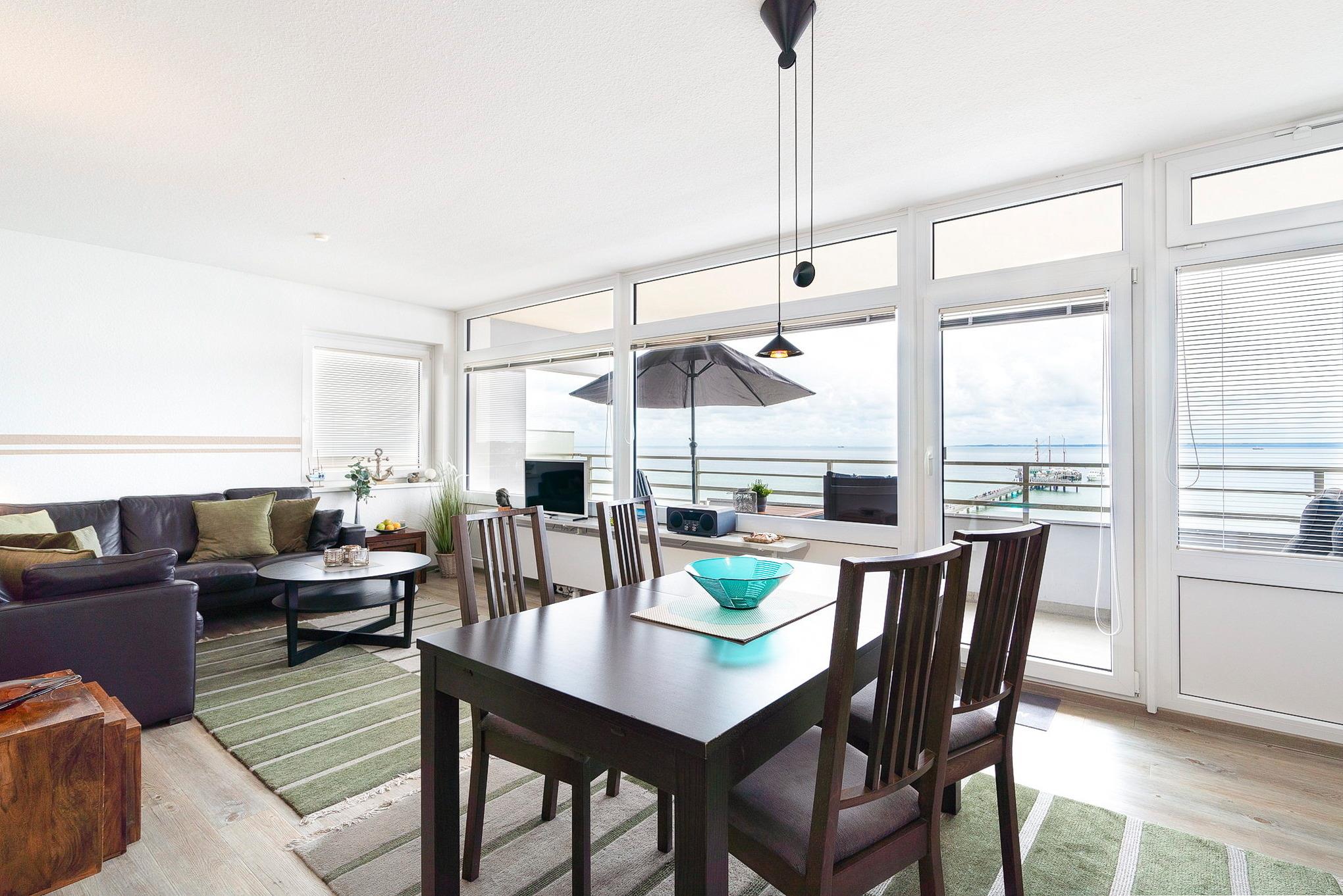 Modern ausgestattetes Wohn- und Esszimmer mit schönem Ausblick auf das Meer und zum Deich. Das Wohn- und Esszimmer ist mit einem Essplatz für 4 Personen, einer Eckcouch und einem Sideboard ausgestattet. Zur Unterhaltung steht ein Smart TV/HD TV, Internetradio/DAB Radio, Bluetooth/USB, QI-Ladegäret, zur Verfügung. Das Wohn- und Esszimmer ist mit Designerplanken ausgelegt. Direkter Zugang zum Balkon.