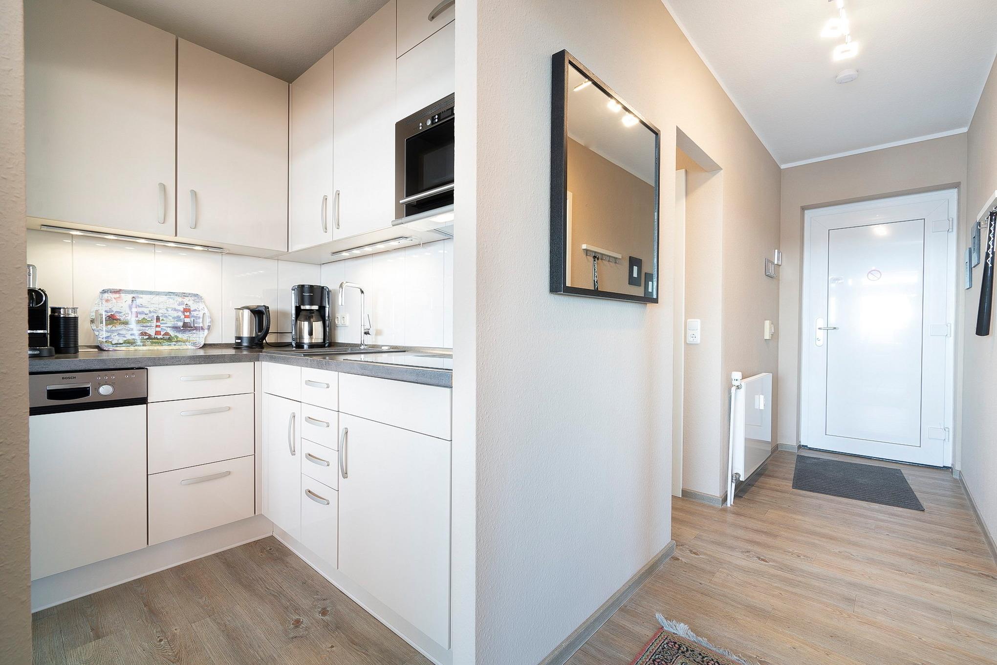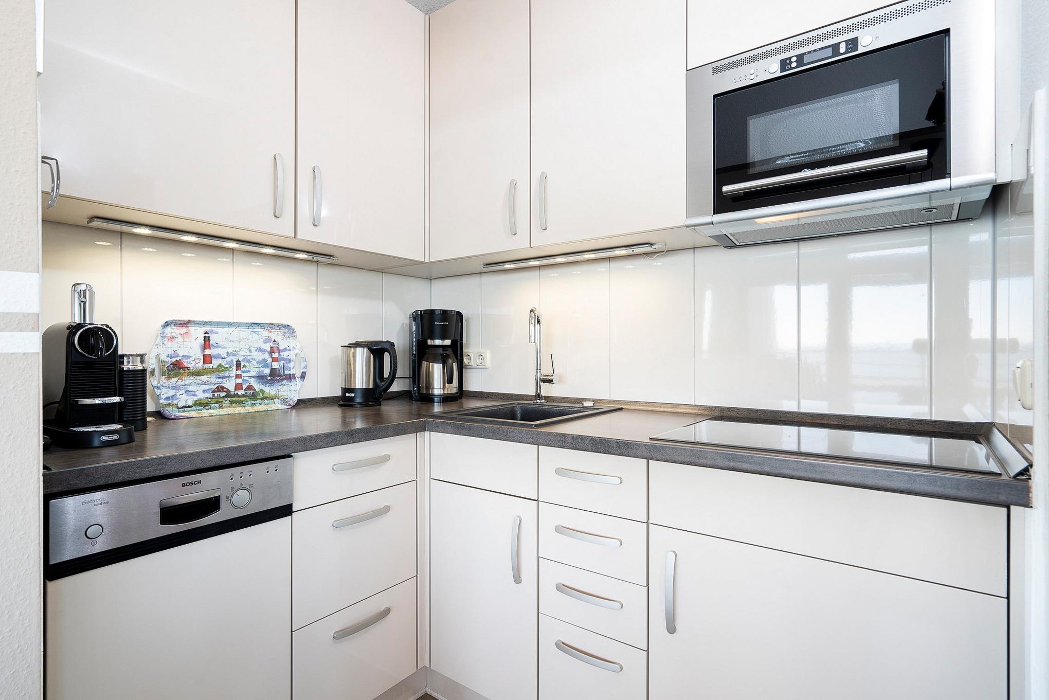Moderne, komplett eingerichtete, zum Wohn- und Esszimmer offene Küche mit 4 Platten Cerankochherd, Kühlschrank mit kleinem 3-Sterne Gefrierfach, Spülmaschine, Mikrowelle, Kaffeemaschine und Wasserkocher.