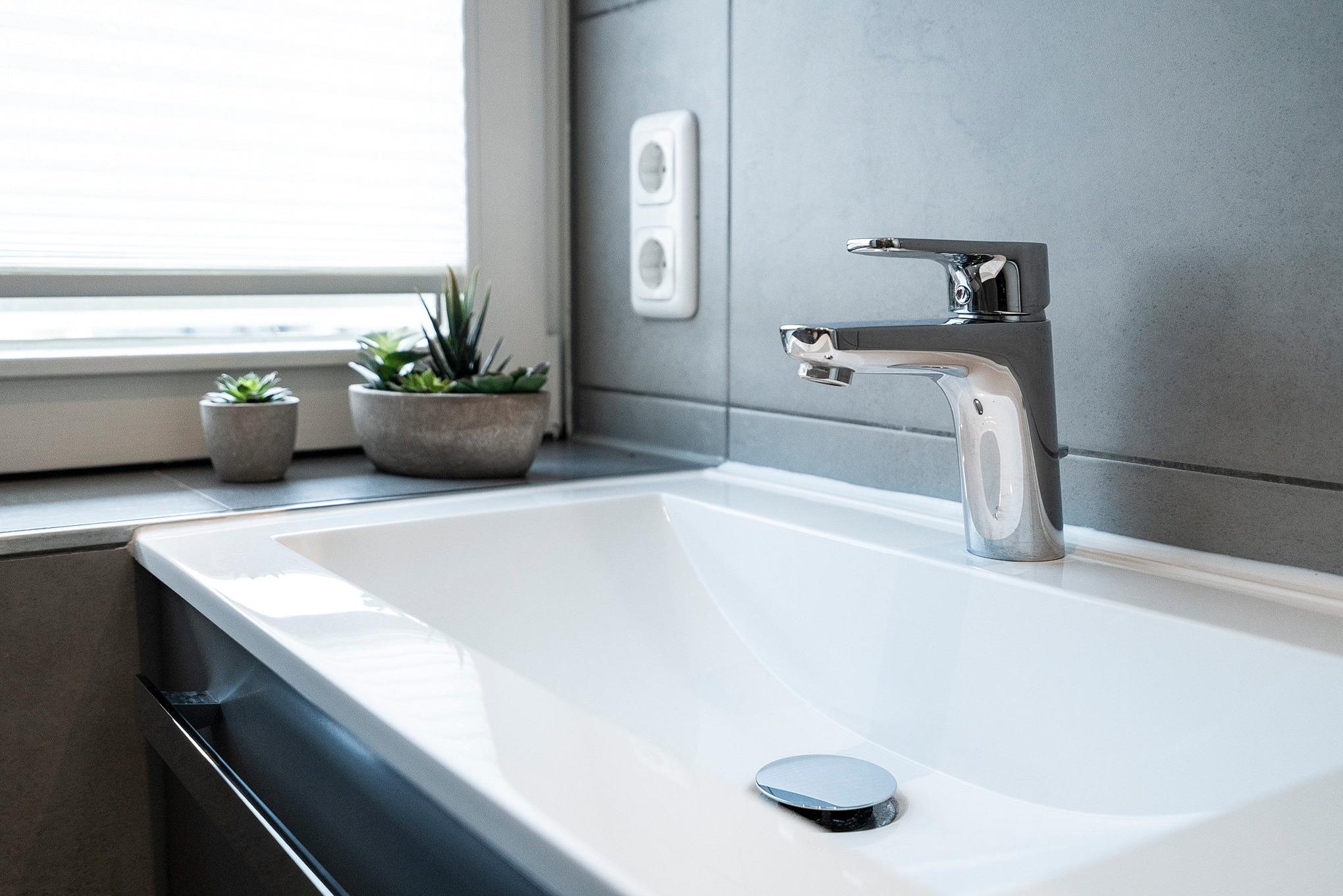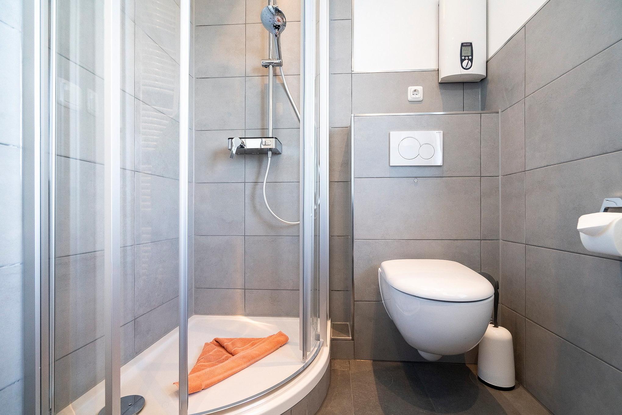 Freundliches, modernes, frisch saniertes Tageslichtbad mit Dusche, WC, Waschbecken und Haartrockner.