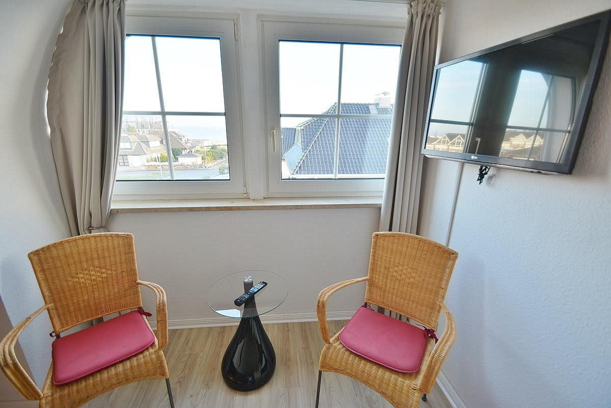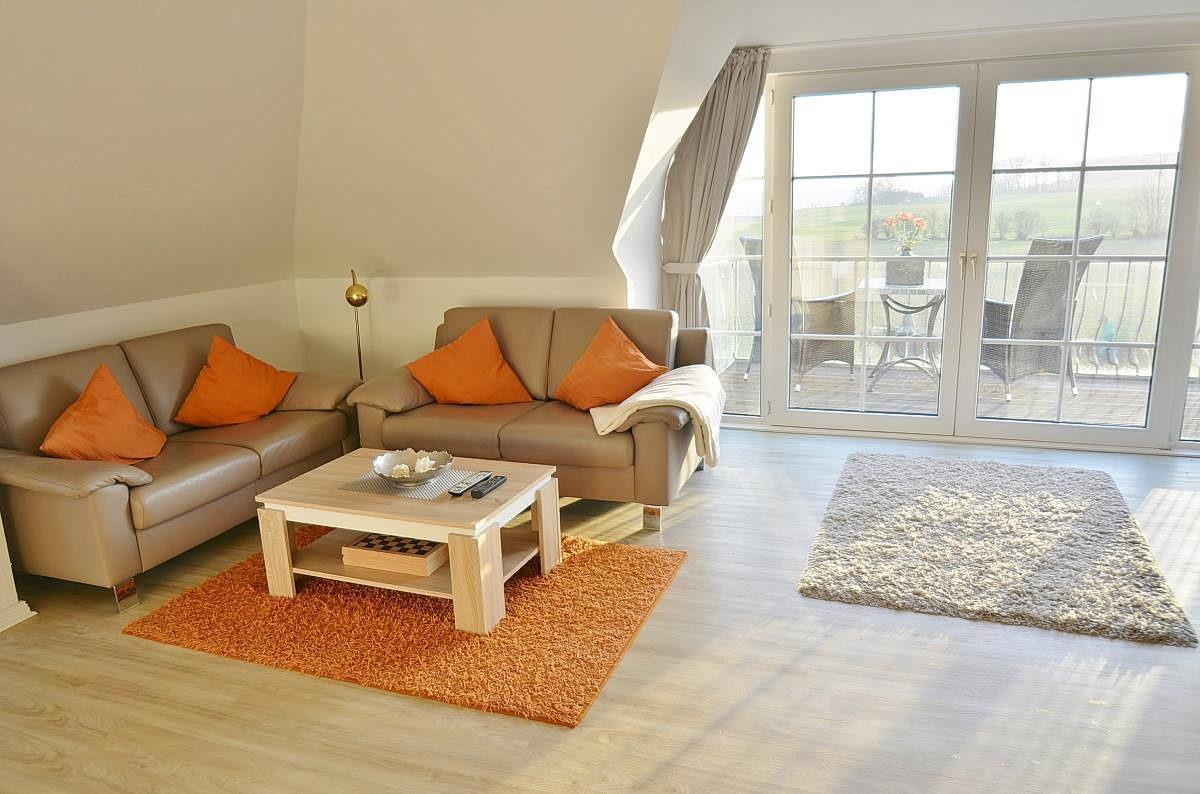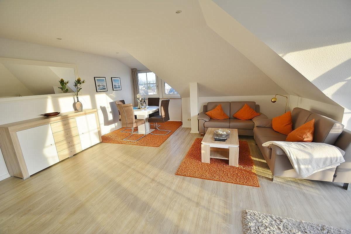 Der lichtdurchflutete großzügige Wohnbereich verfügt über einen direkten Zugang zum Balkon, von dem aus man einen herrlichen Seeblick genießen kann. Das Wohnzimmer ist ausgestattet mit 2 hochwertigen Ledersofas, einer Lederliege sowie einem gemütlichen Essplatz für 4 Personen. Zur Unterhaltung stehen ein Flachbildfernseher und eine Stereoanlage zur Verfügung. Der Raum ist mit Laminatboden ausgelegt.