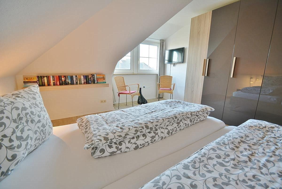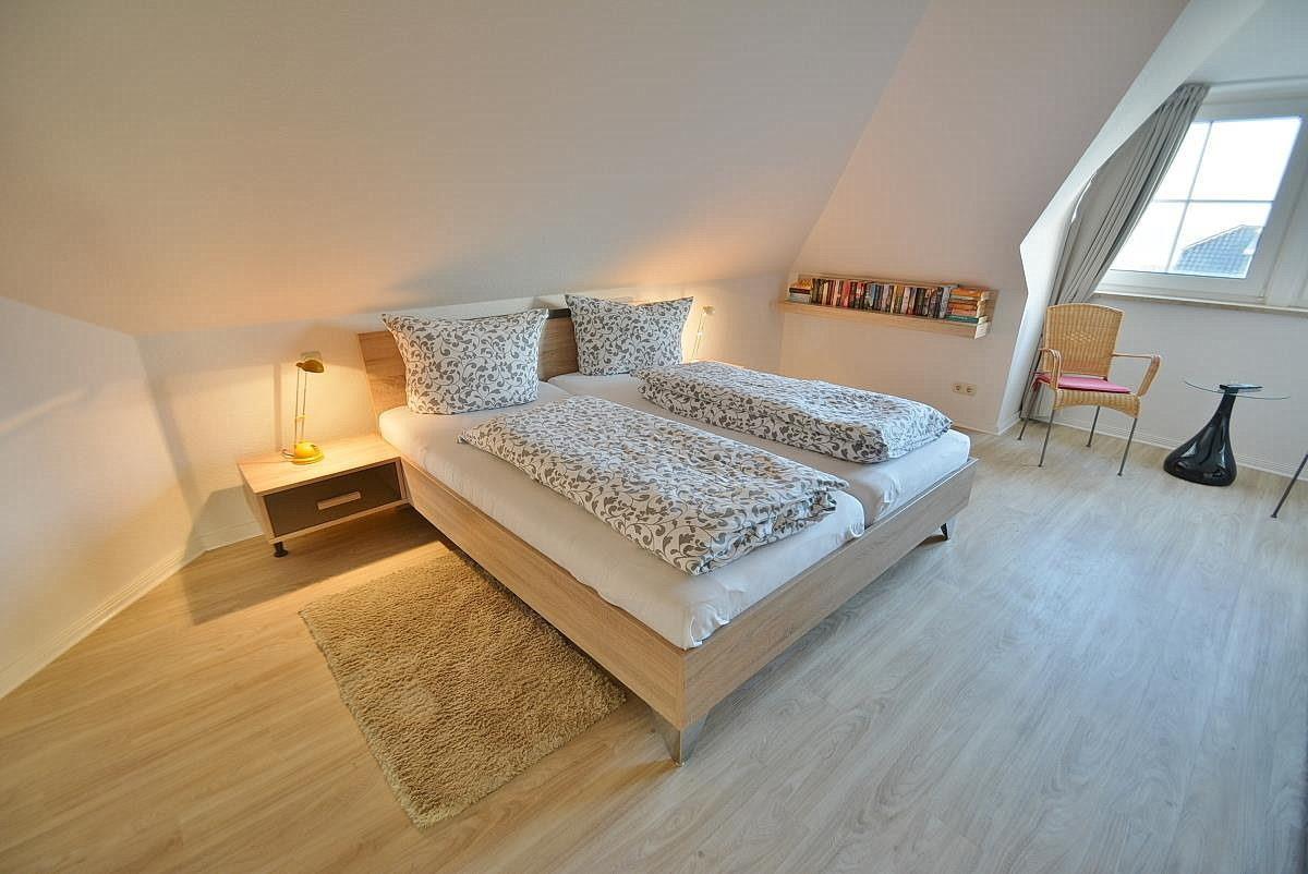 Das helle freundliche Schlafzimmer verfügt über ein Doppelbett (2x90x200cm), einen vier-türigen Kleiderschrank sowie einen kleinen Flachbildfernseher. Der Raum ist mit Laminatboden ausgelegt. Die Fenster lassen sich durch einen Vorhang verdunkeln.