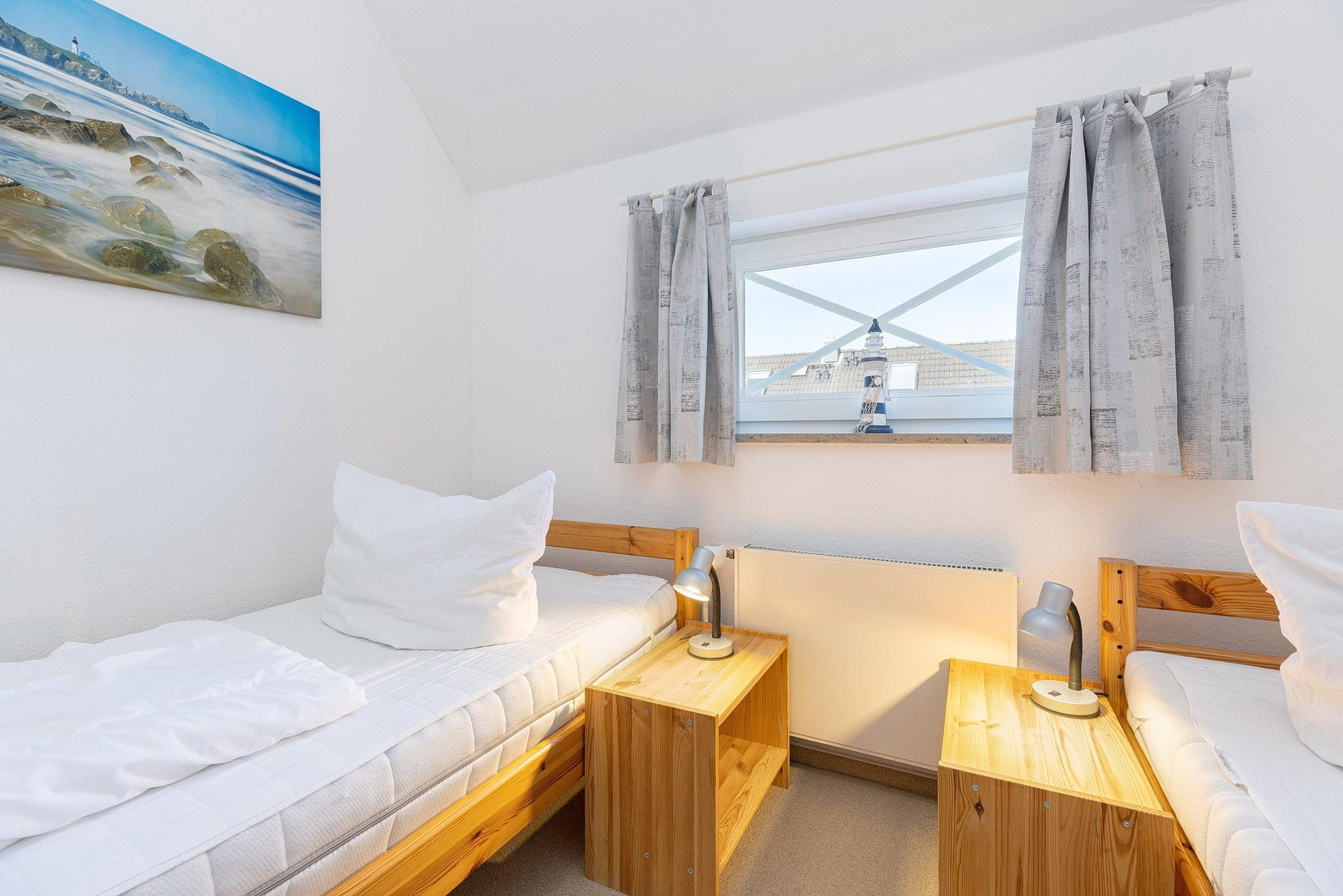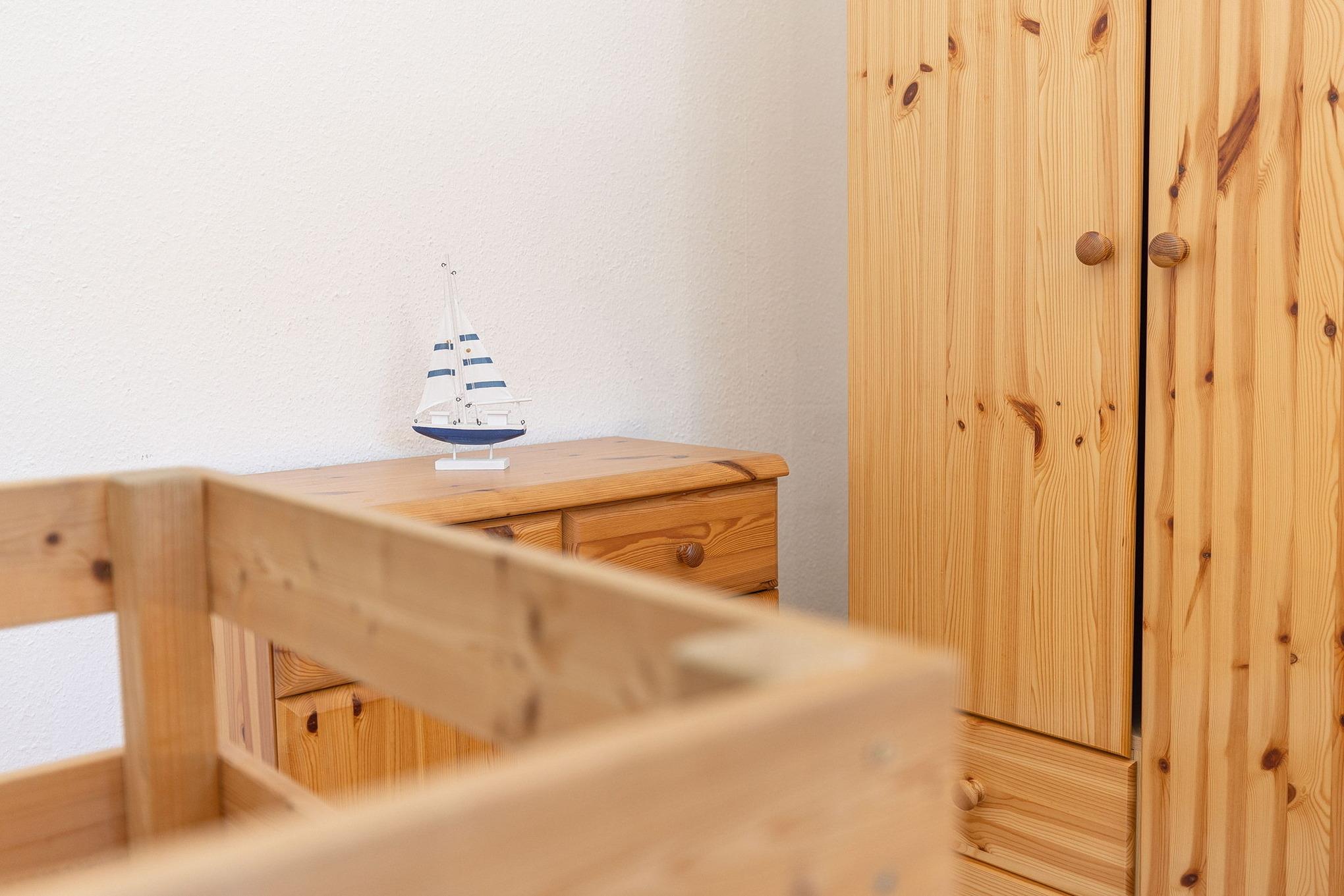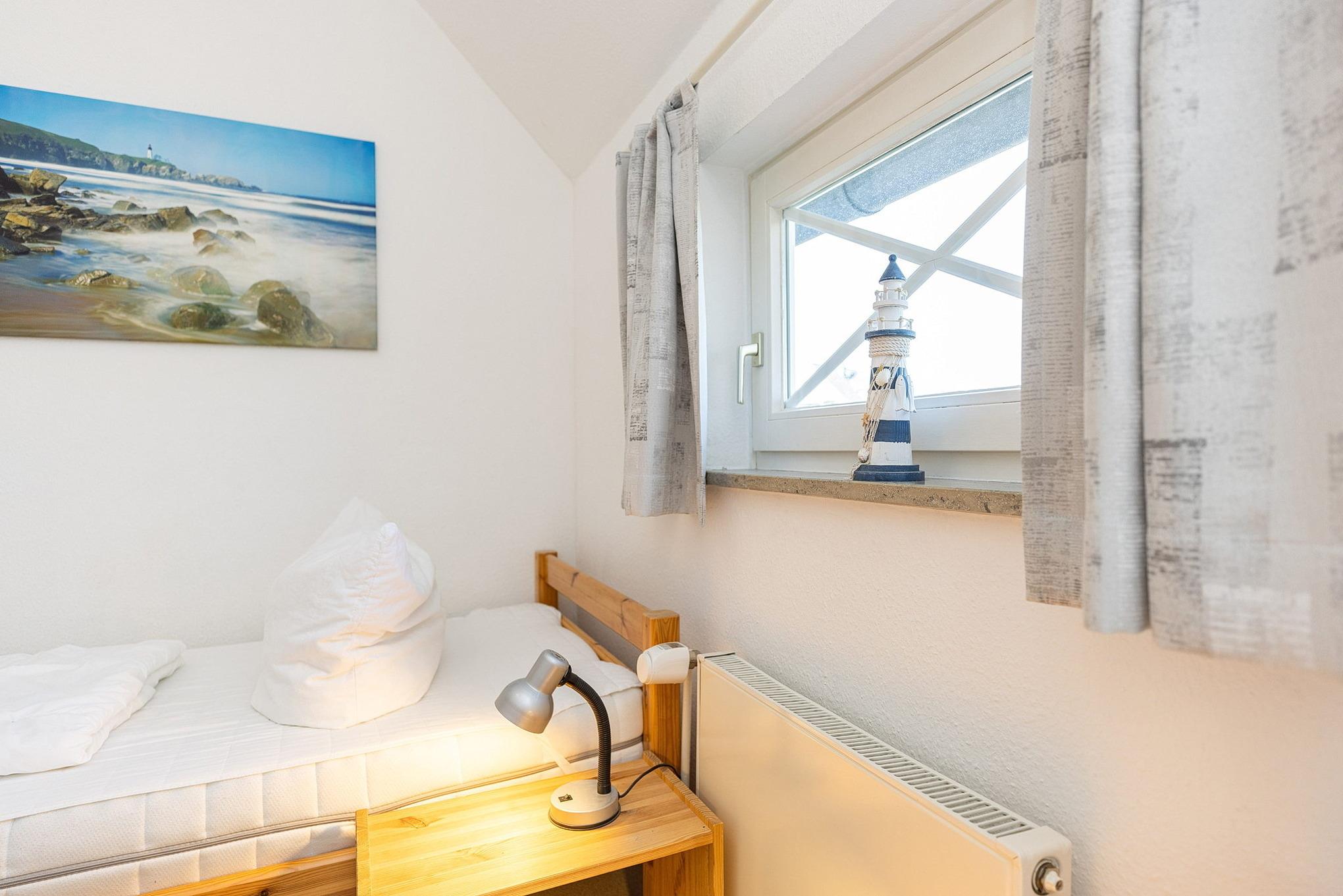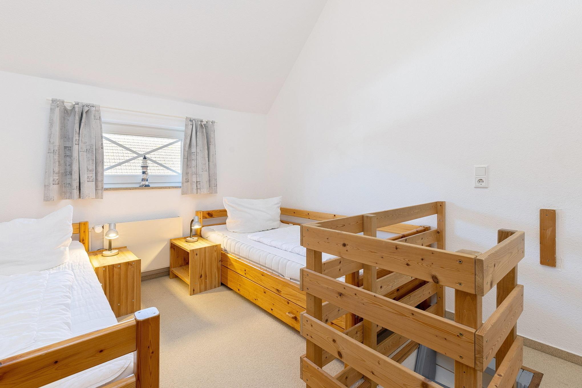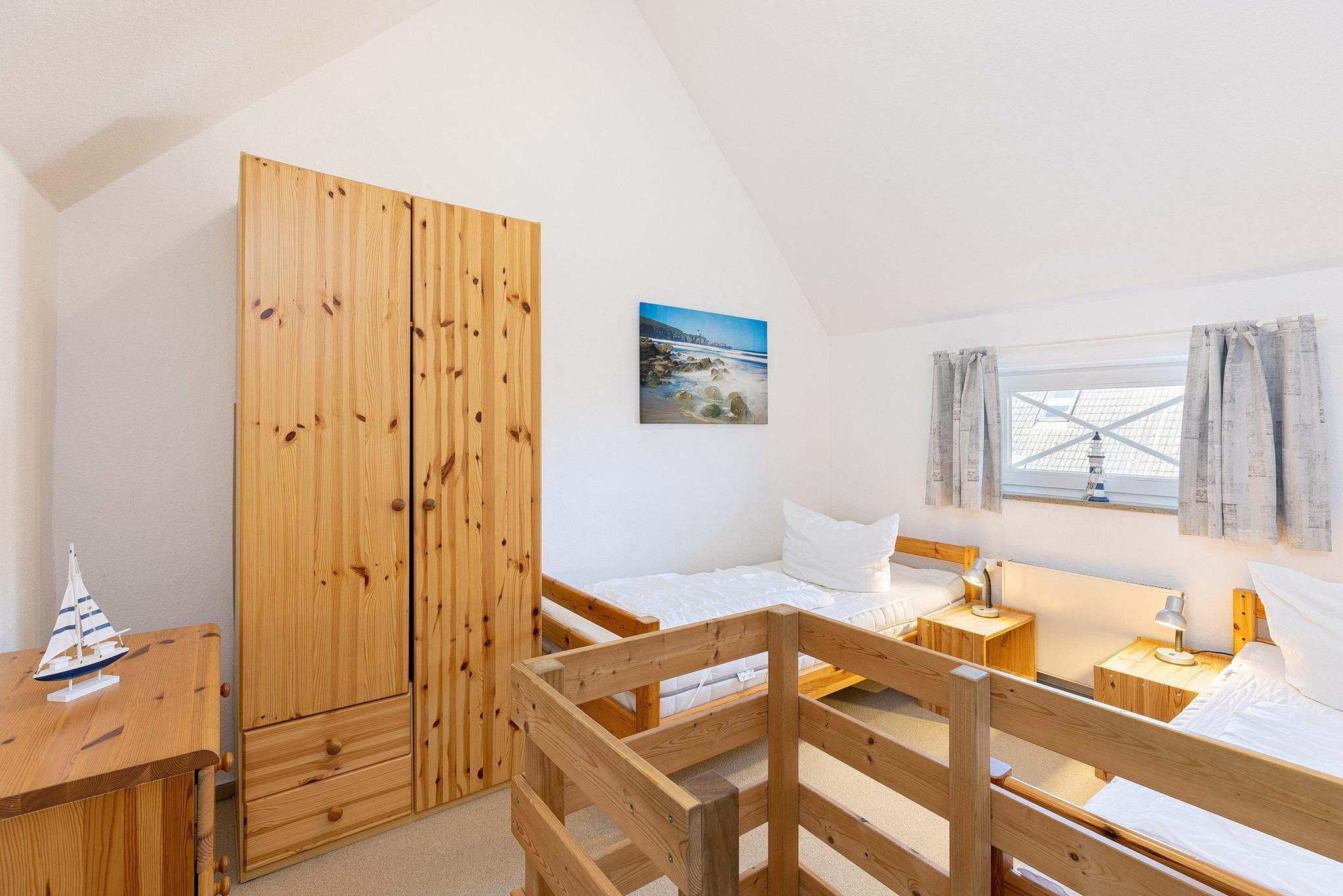 Das Schlafzimmer im 2. OG ist über eine steile und sehr geräuscharme Raumspartreppe erreichbar. Das Schlafzimmer ist mit 2 getrennten Betten (90x200cm), zwei Nachttischen, einem Kleiderschrank und einer Kommode ausgestattet. Das Zimmer ist mit Teppichboden ausgelegt. Das Fenster lässt sich durch einen blickdichten Vorhang verdunkeln.