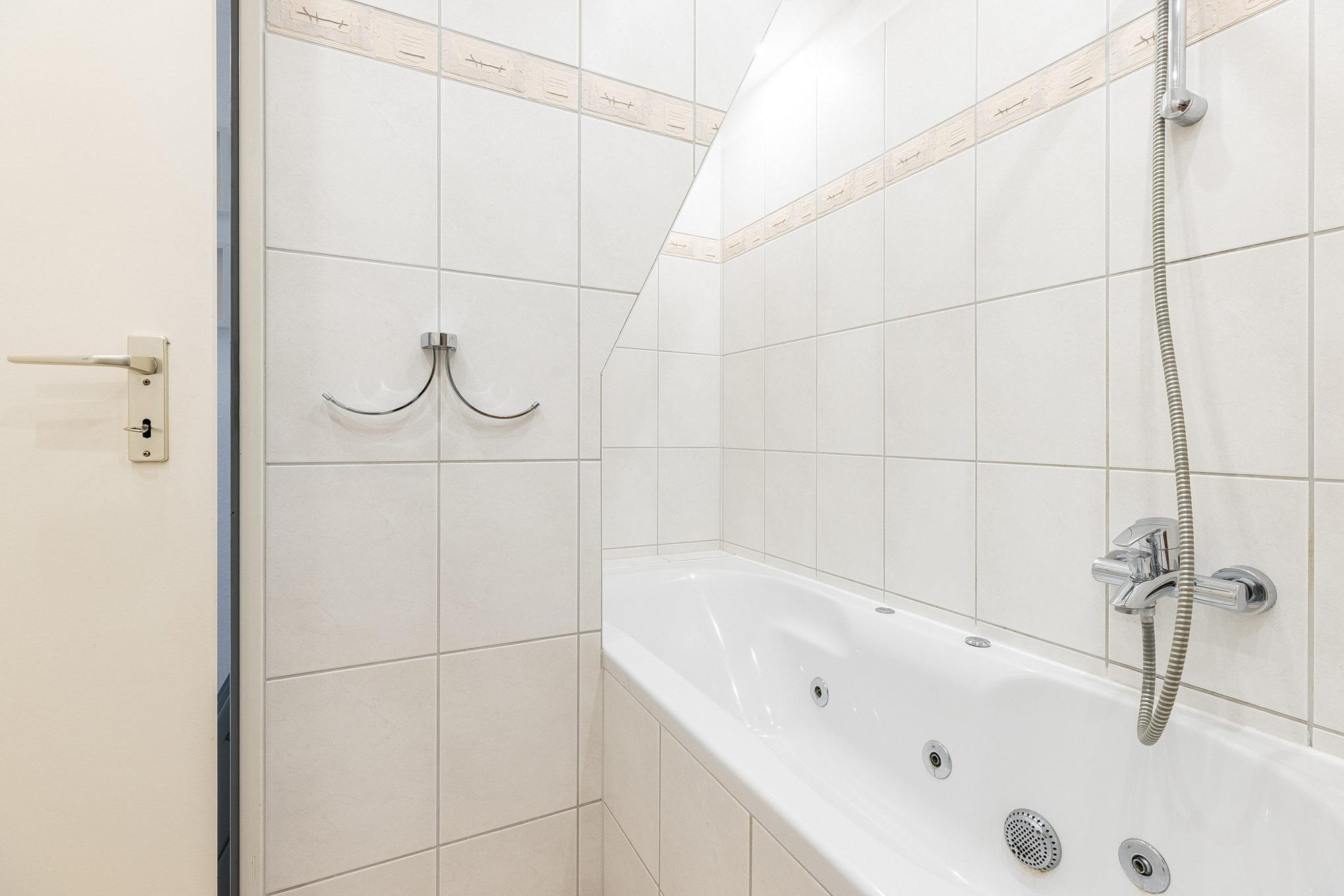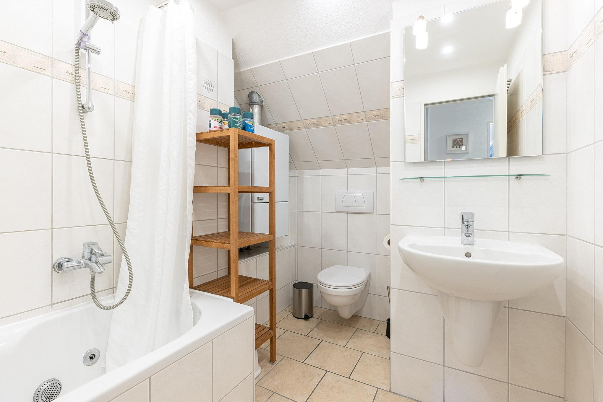 Modernes, hell gefliestes Bad im 1.OG. Das Bad ist mit einer Whirlpool-Badewanne, einem Waschbecken und einem WC ausgestattet. Die Fußbodenheizung sorgt für angenehm warme Füße.
