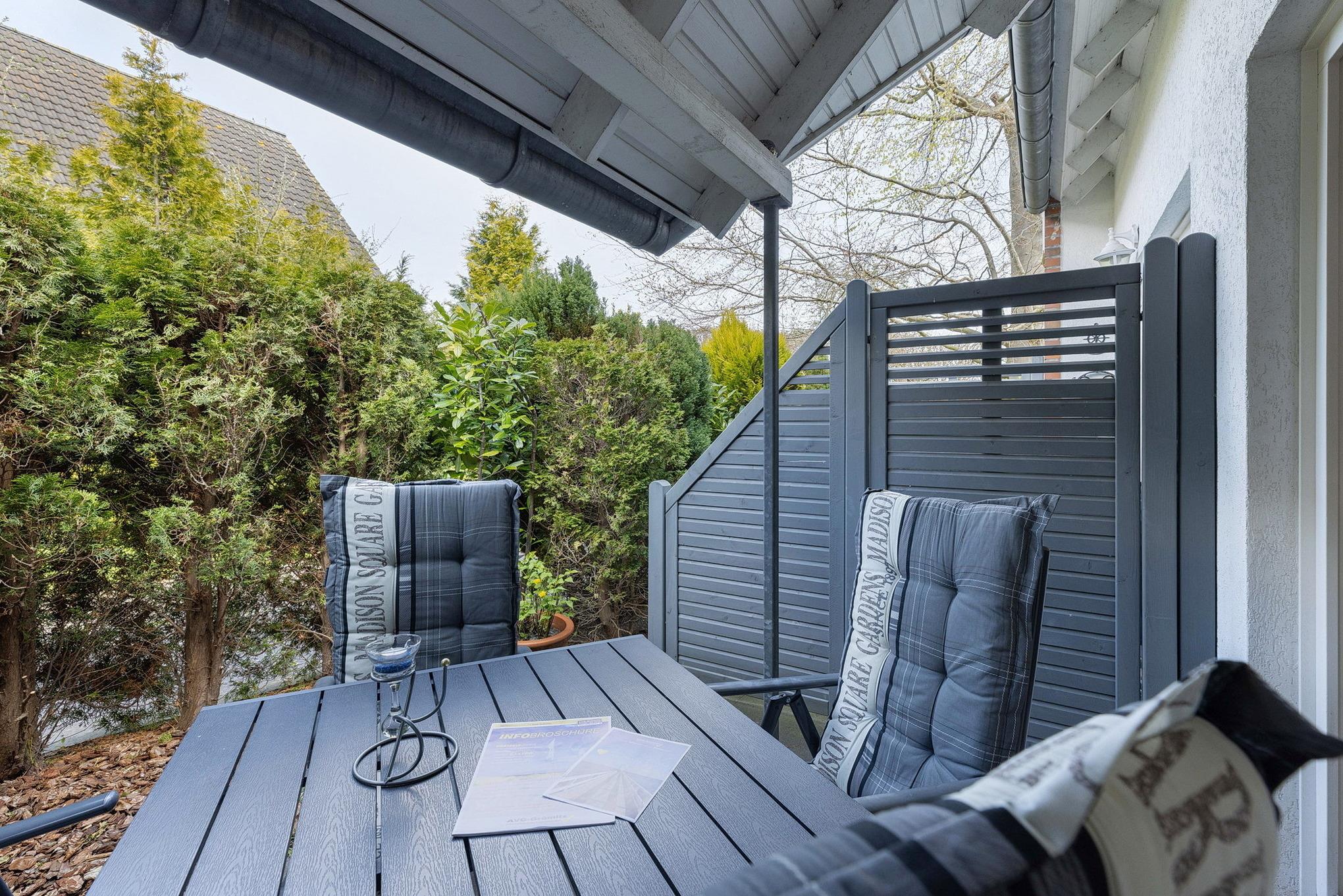 Terrasse in nord-westliche Richtung, Fahrrad-Abstellfläche im Freien hinter dem Gebäude. Kostenloser Strandkorb am Strand Nähe Seebrücke Richtung Grömitzer Welle im Zeitraum vom 15. April bis 20. September, unbegrenzte W-Lan Nutzung inklusive.