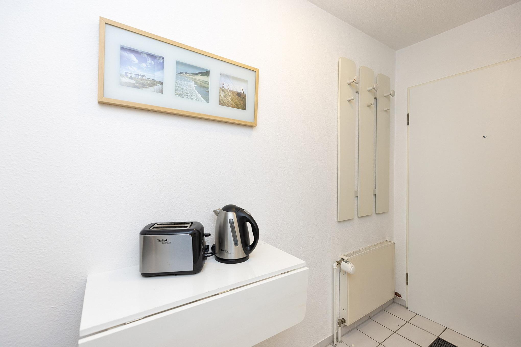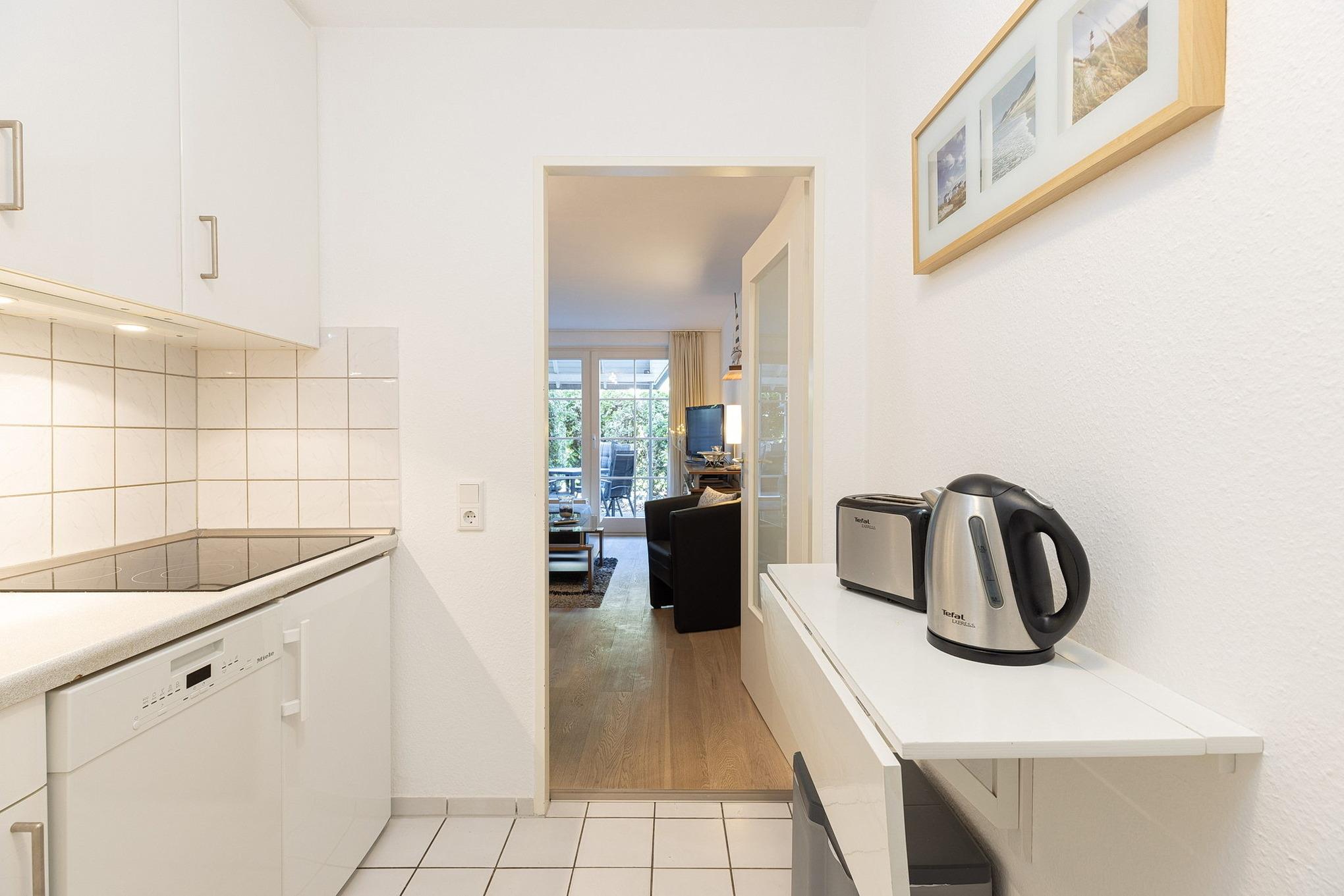 Moderne, komplett ausgestattete Pantry-Küche im EG. Die Pantry-Küche ist mit einem 4-Platten Cerankochfeld, einer Spülmaschine, einem Kühlschrank mit kleinem 3-Sterne Gefrierfach, einer Mikrowelle, einem Wasserkocher, einem Toaster und einer Kaffeemaschine ausgestattet.
