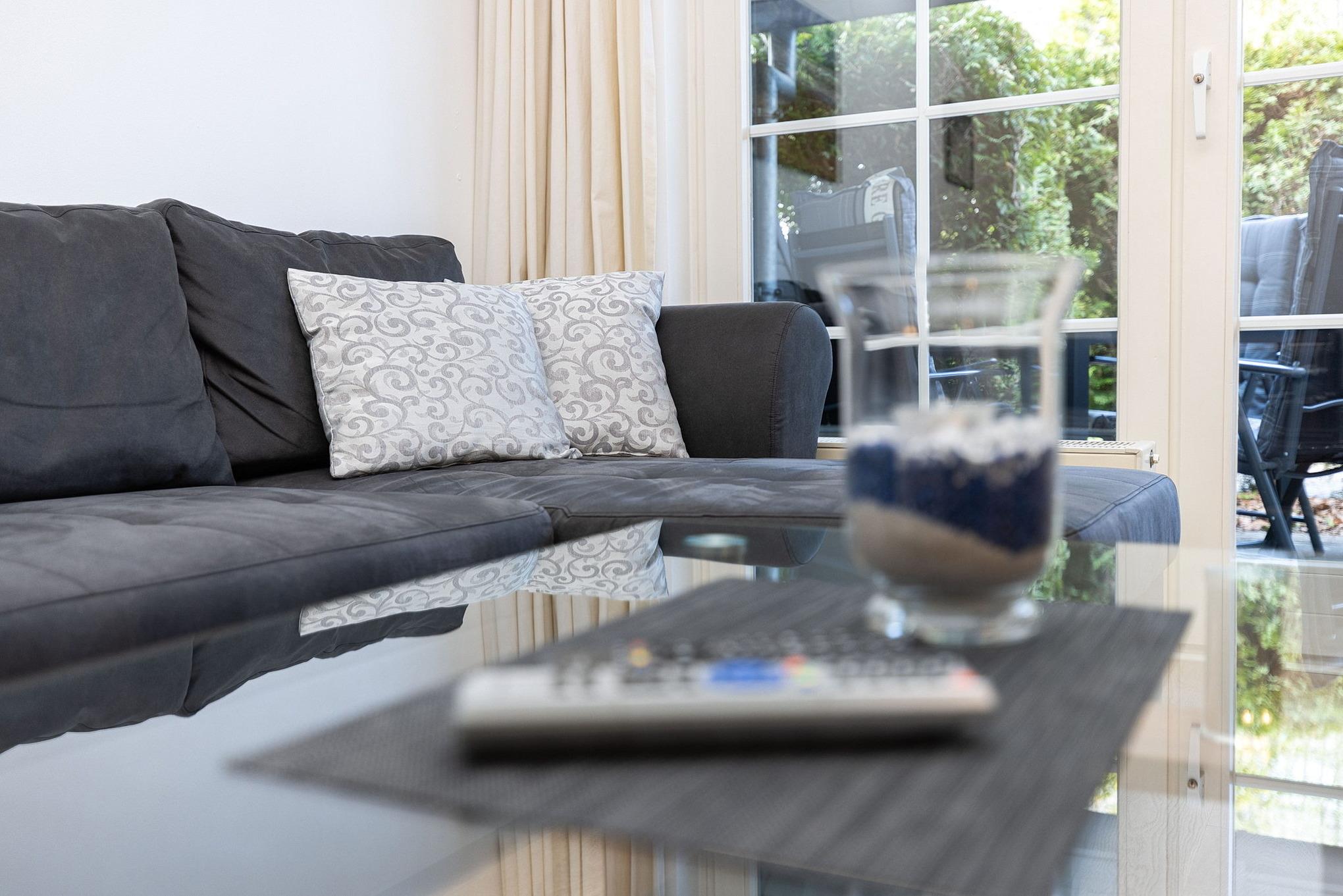 Modernes und Ende 2021 renoviertes Wohn- und Esszimmer im EG mit direktem Zugang zur Terrasse. Das Wohn- und Esszimmer ist mit einem Essplatz für 4 Personen, einer Eck-Couch, 1 Sessel, einem Couchtisch und einer Kommode ausgestattet. Zur Unterhaltung steht ein Flachbildschirm (digitaler SAT-TV und Radioempfang) sowie ein DVD-Player zur Verfügung. Das Zimmer ist mit Laminatboden ausgelegt.