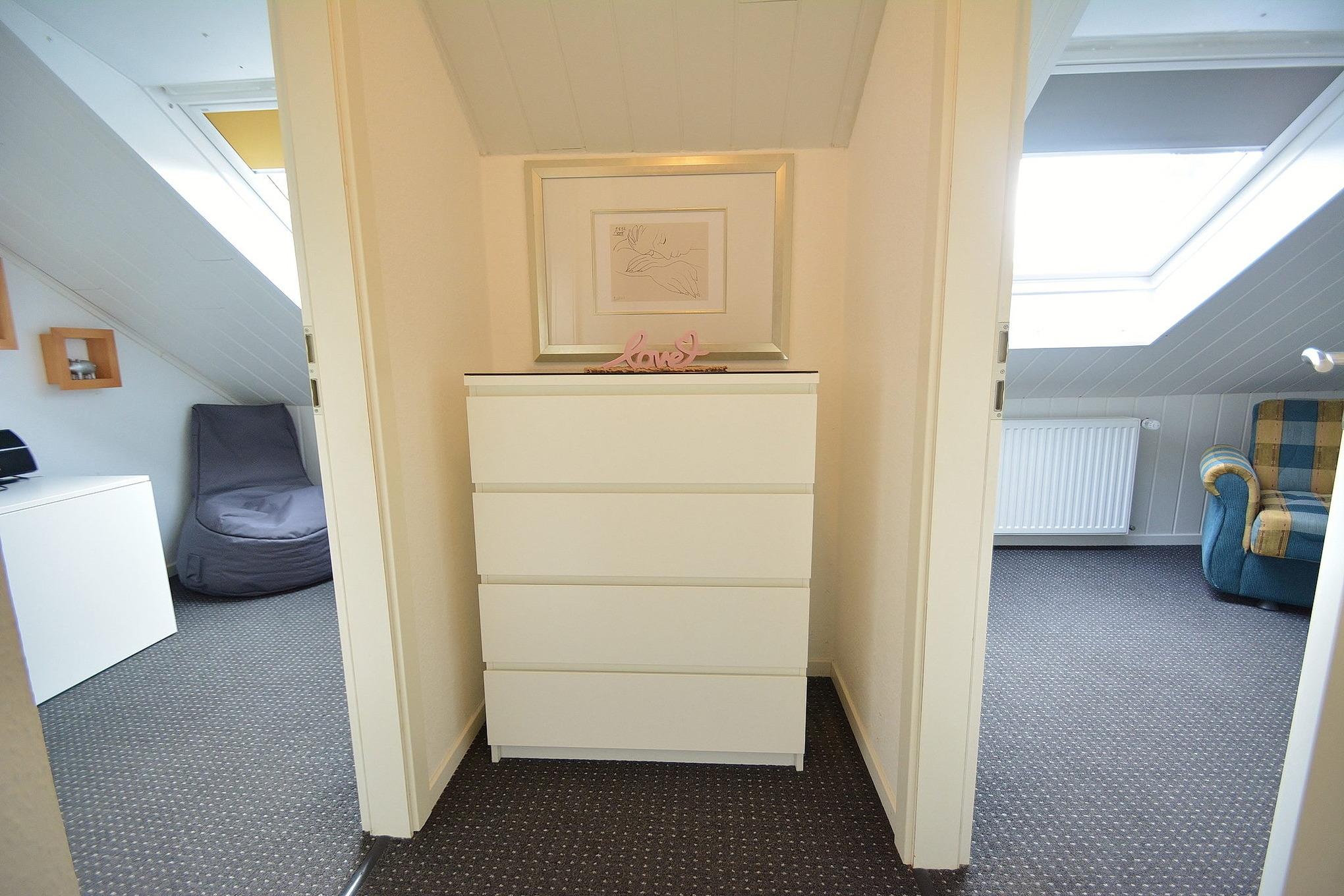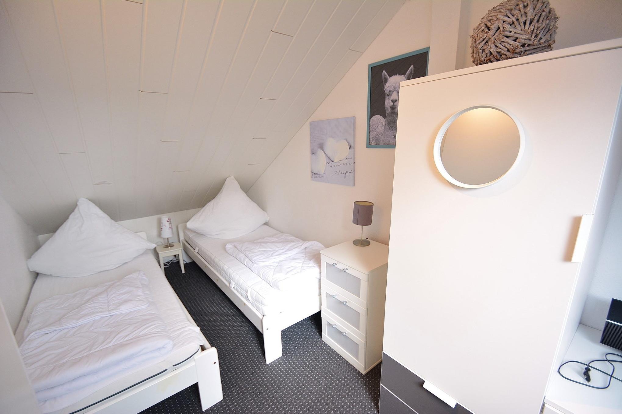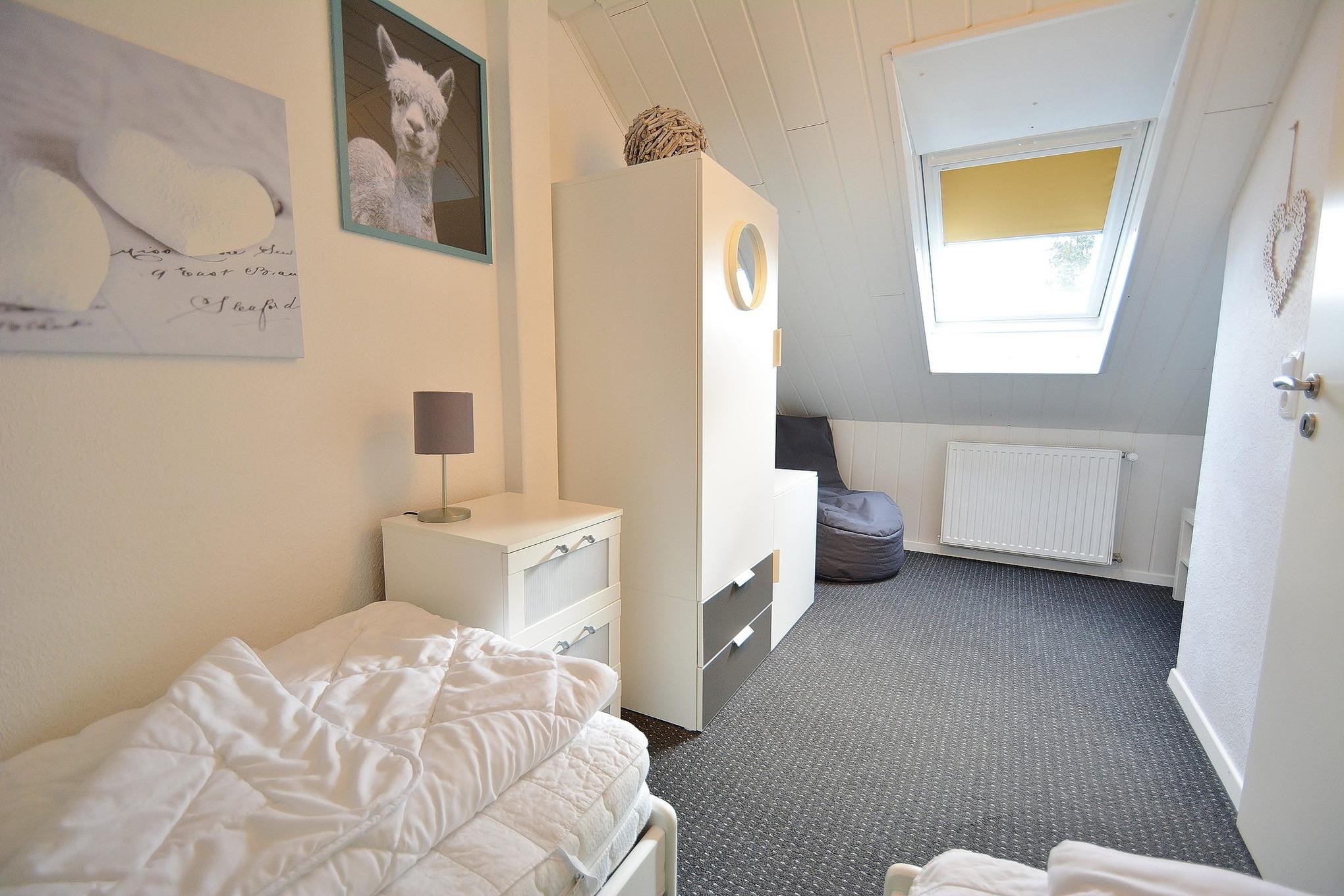 Das Kinderzimmer ist mit 2 Einzelbetten und einem Kleiderschrank ausgestattet und befindet sich im Obergeschoss (bitte beachten Sie, dass die Treppe steil ist). Das Zimmer ist mit Teppichboden ausgelegt, am Dachfenster befindet sich ein Verdunklungsrollo.