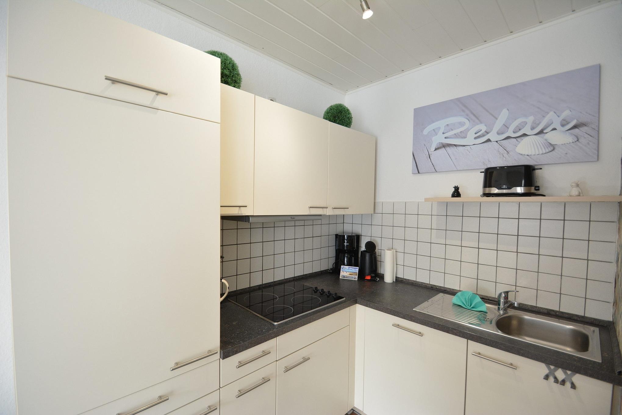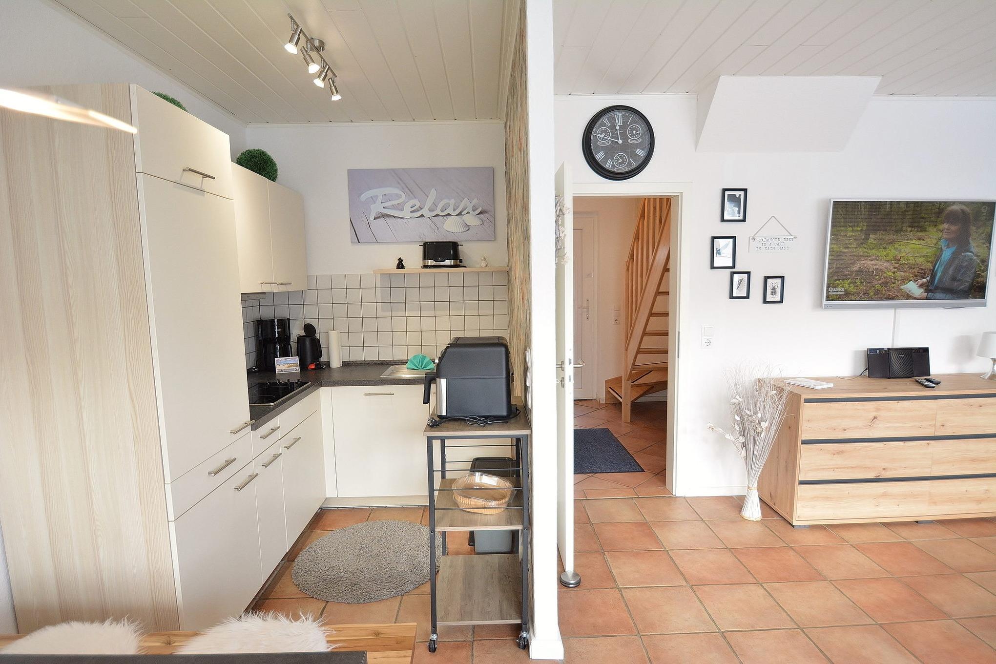 Eine abgeteilte, komplett ausgestattete moderne Küche mit Essgruppe ist im Wohn- und Esszimmer integriert. Es gibt eine Spülmaschine, 4 Platten Cerankochfeld, Kühlschrank mit kleinem 3-Sterne Gefrierfach, Wasserkocher, Toaster, Kaffeemaschine.