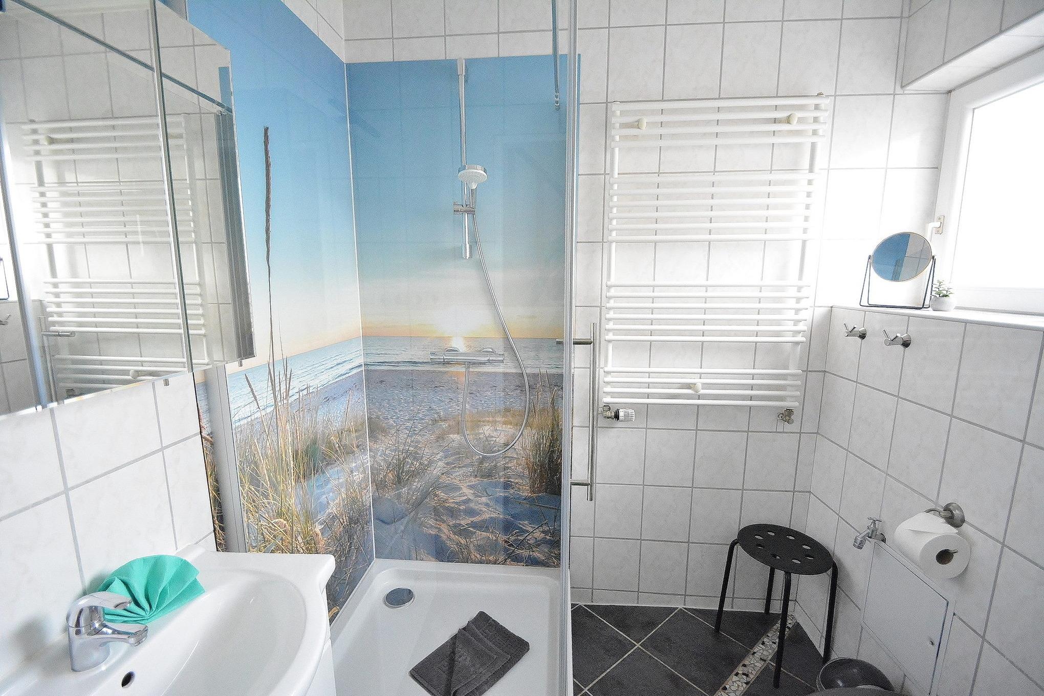 Modernes, gefliestes Tageslichtbad mit Duschkabine, Waschbecken und WC im Erdgeschoss.