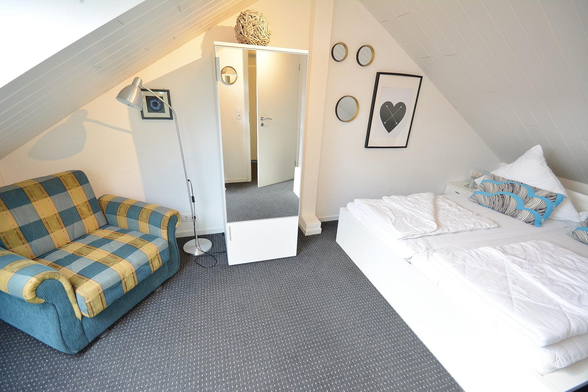Das moderne Schlafzimmer mit Doppelbett und Kleiderschrank befindet sich im Obergeschoss (bitte beachten Sie, dass die Treppe steil ist). Das Zimmer ist mit Teppichboden ausgelegt, am Dachfenster befindet sich ein Verdunklungsrollo.