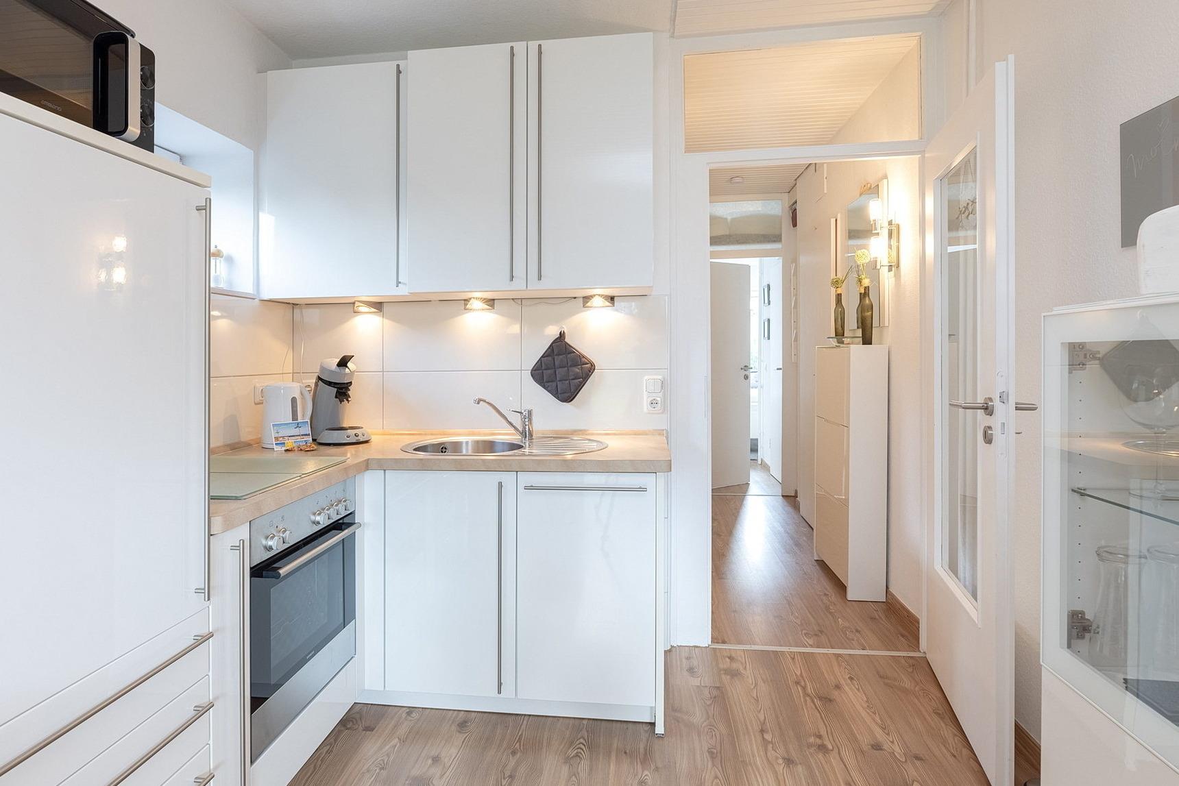 Moderne hochwertige zum Wohnbereich offene komplett ausgestattete Küche mit Kühlschrank mit 3-Sterne-Gefrierfach, Spülmaschine, Mikrowelle, Backofen und 4-Platten-Cerankochfeld. Außerdem stehen eine Kaffeemaschine, ein Wasserkocher und ein Toaster zur Nutzung bereit.
