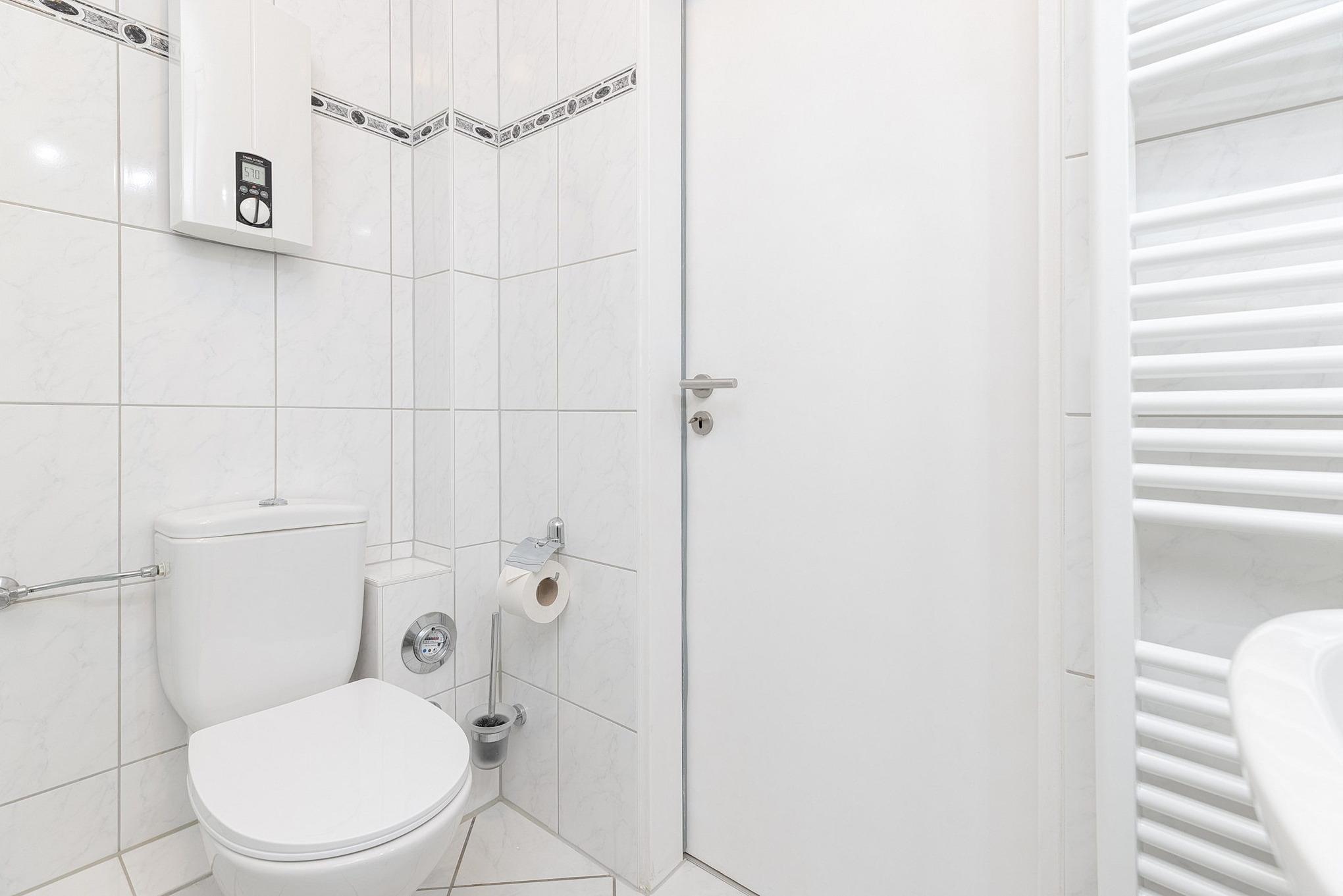 Hell gefliestes Bad mit Dusche, WC und Waschbecken.