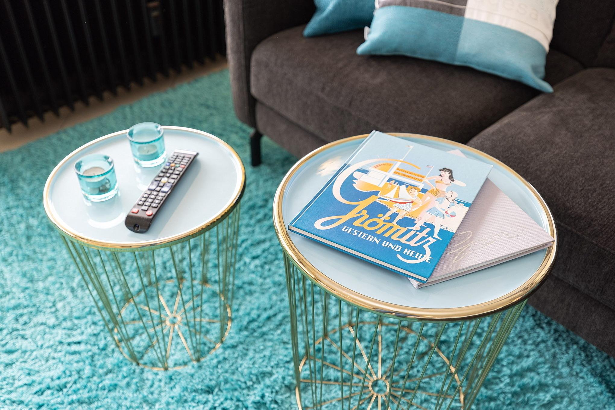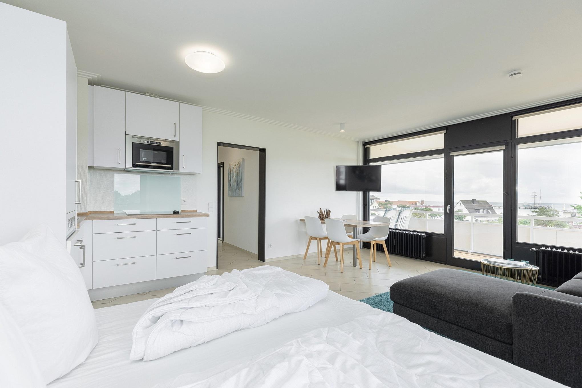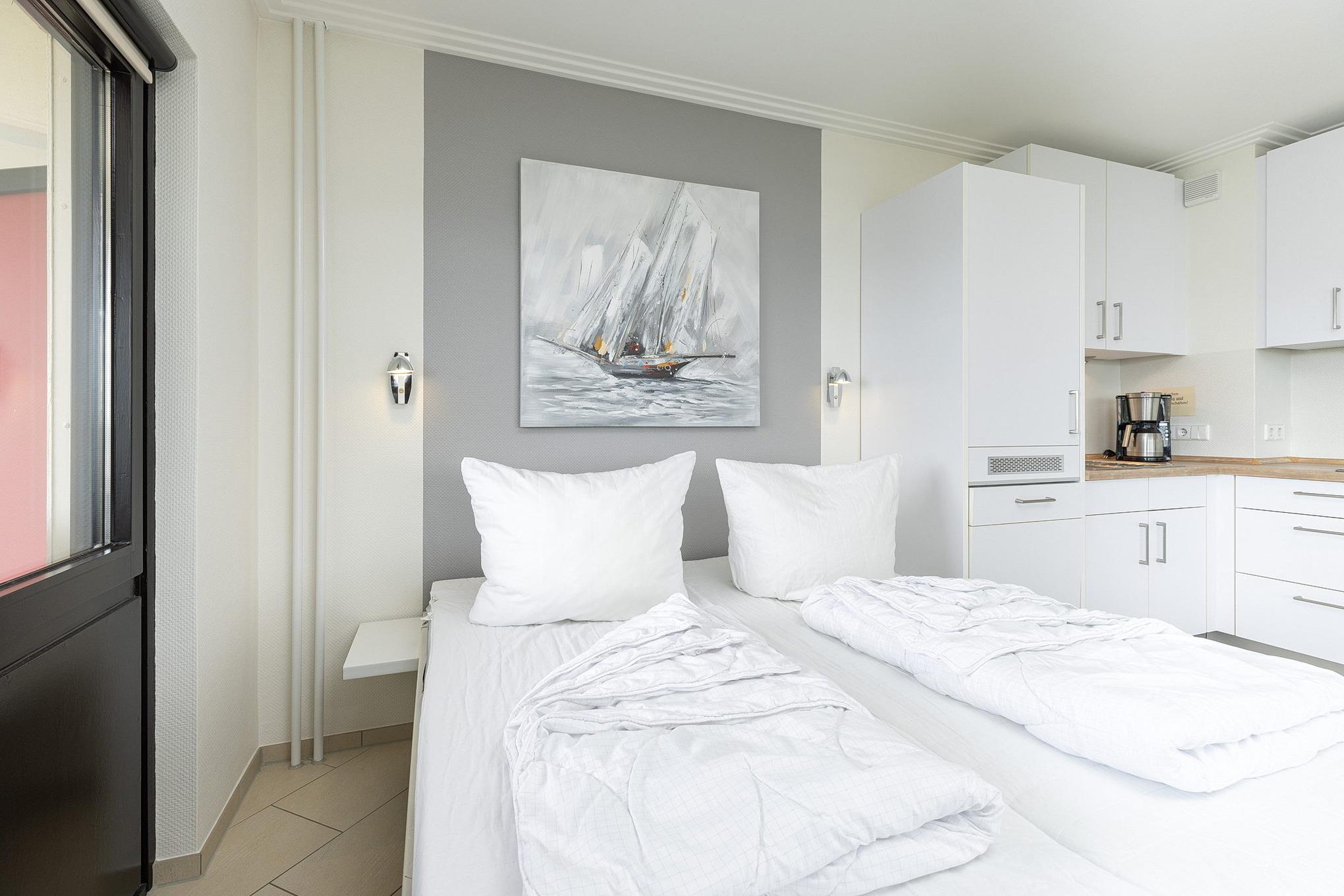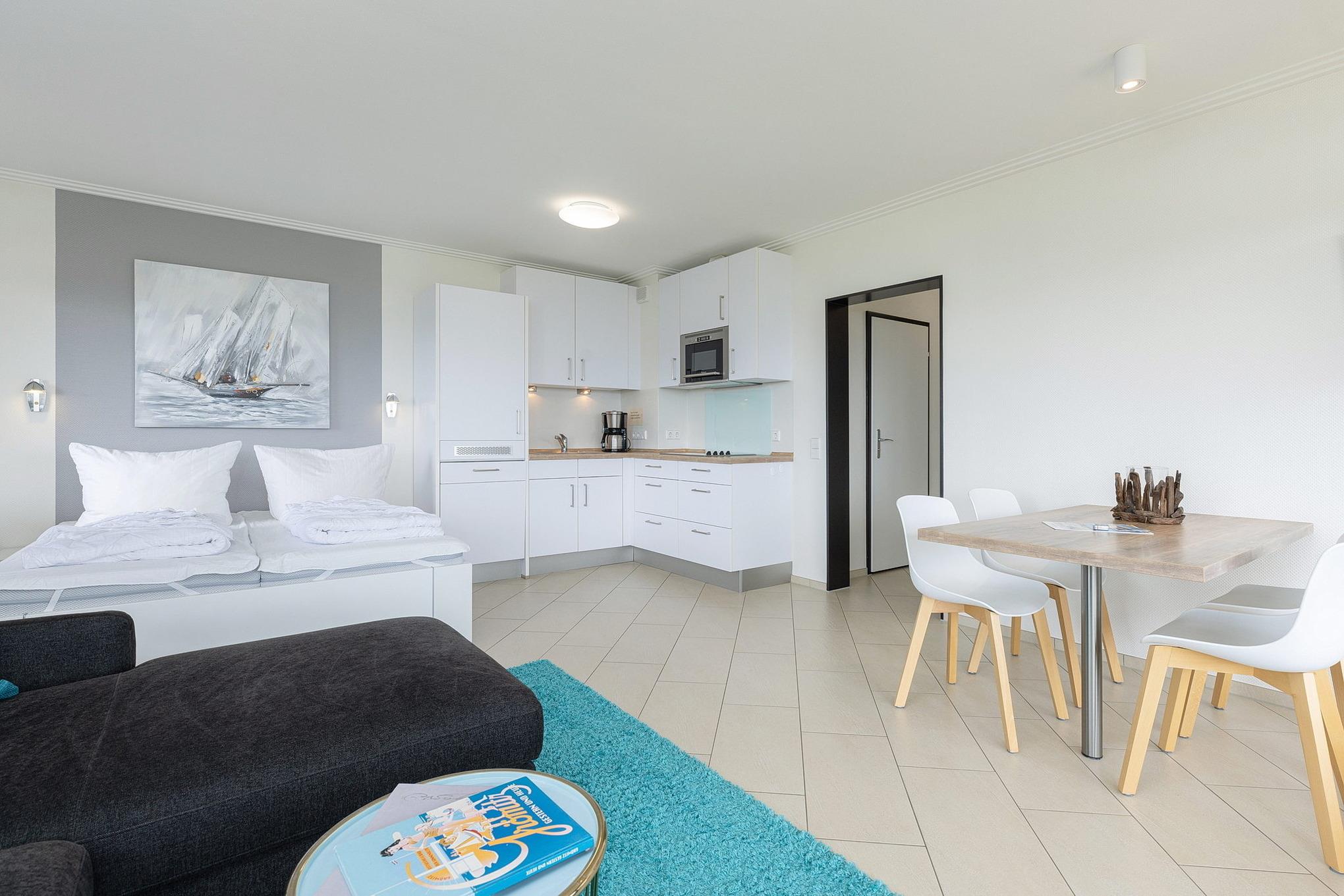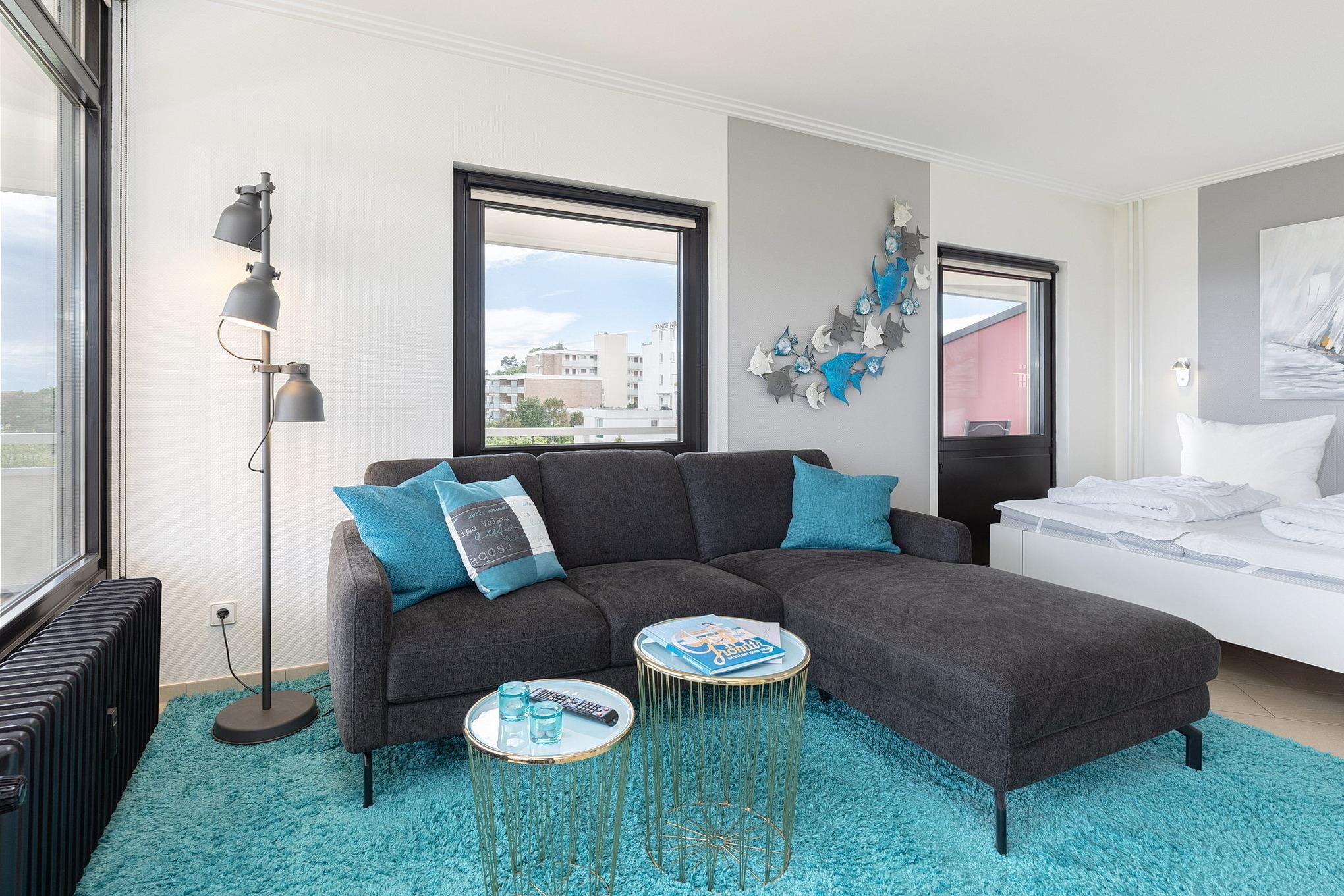 Modern ausgestattetes, helles und freundliches Wohn- und Schlafzimmer mit direktem Zugang zum großen Eckbalkon in südliche und südwestliche Richtung. Das Zimmer ist mit einem Essplatz für 4 Personen, einem Ecksofa, einem Couchtisch und einem Doppelbett (2x 80x190cm) ausgestattet. Zur Unterhaltung steht ein Radio mit CD-Player und ein Flachbildschirm zur Verfügung. Das Zimmer ist gefliest, die Fenster lassen sich durch Innenrollos etwas verdunkeln.