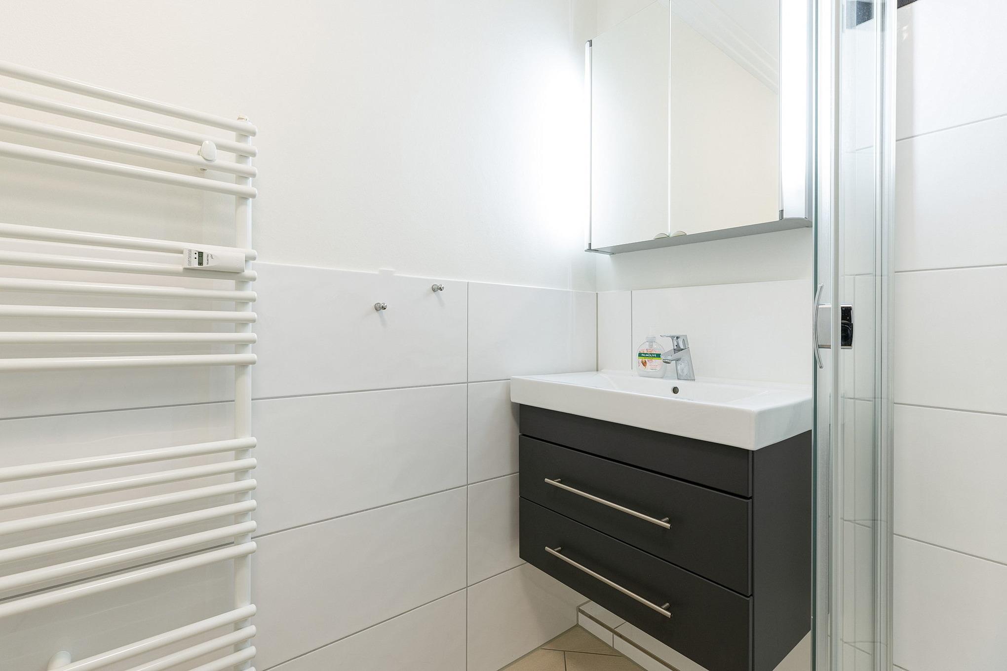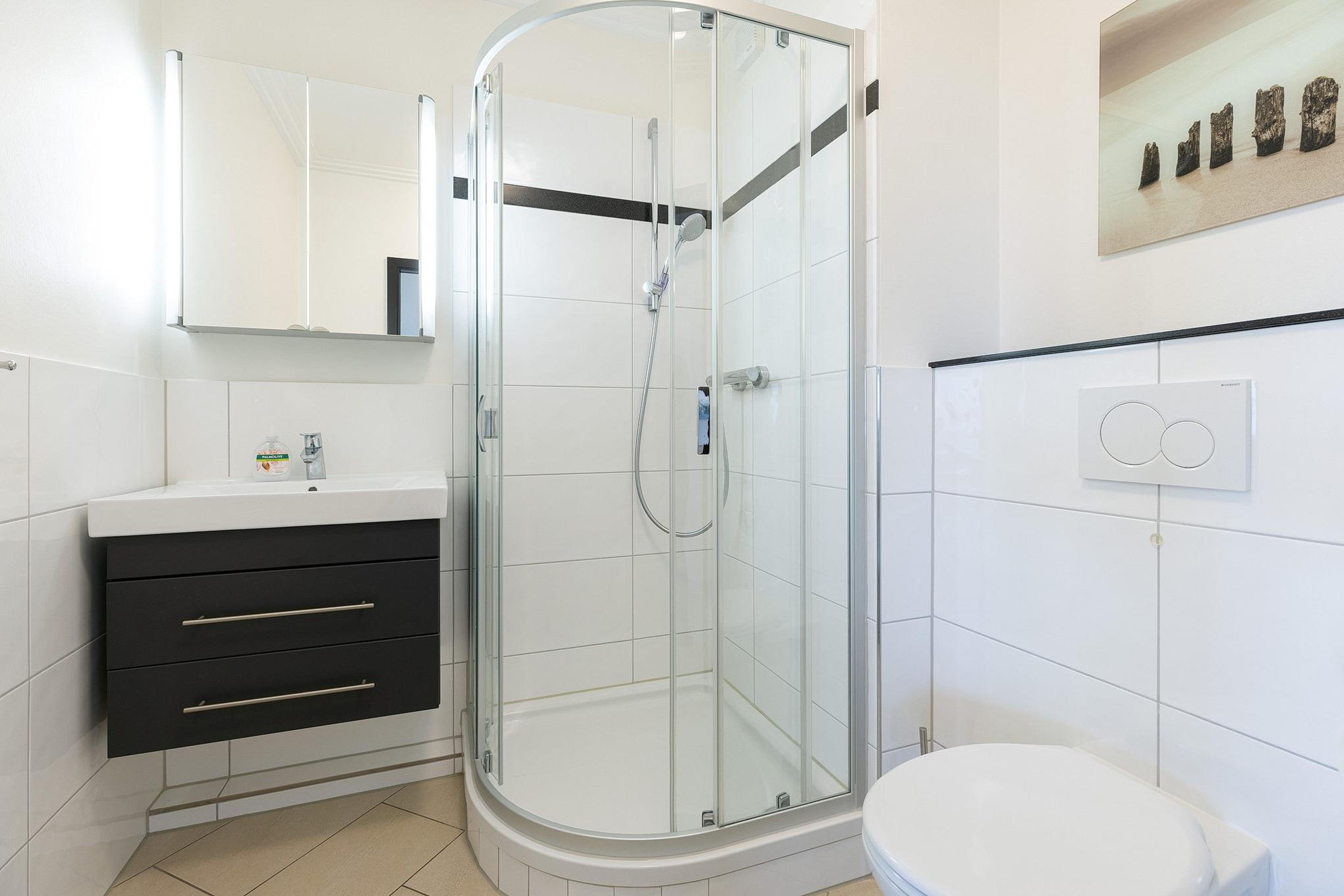 Modernes, hell gefliestes Bad mit Dusche, WC und Waschbecken.