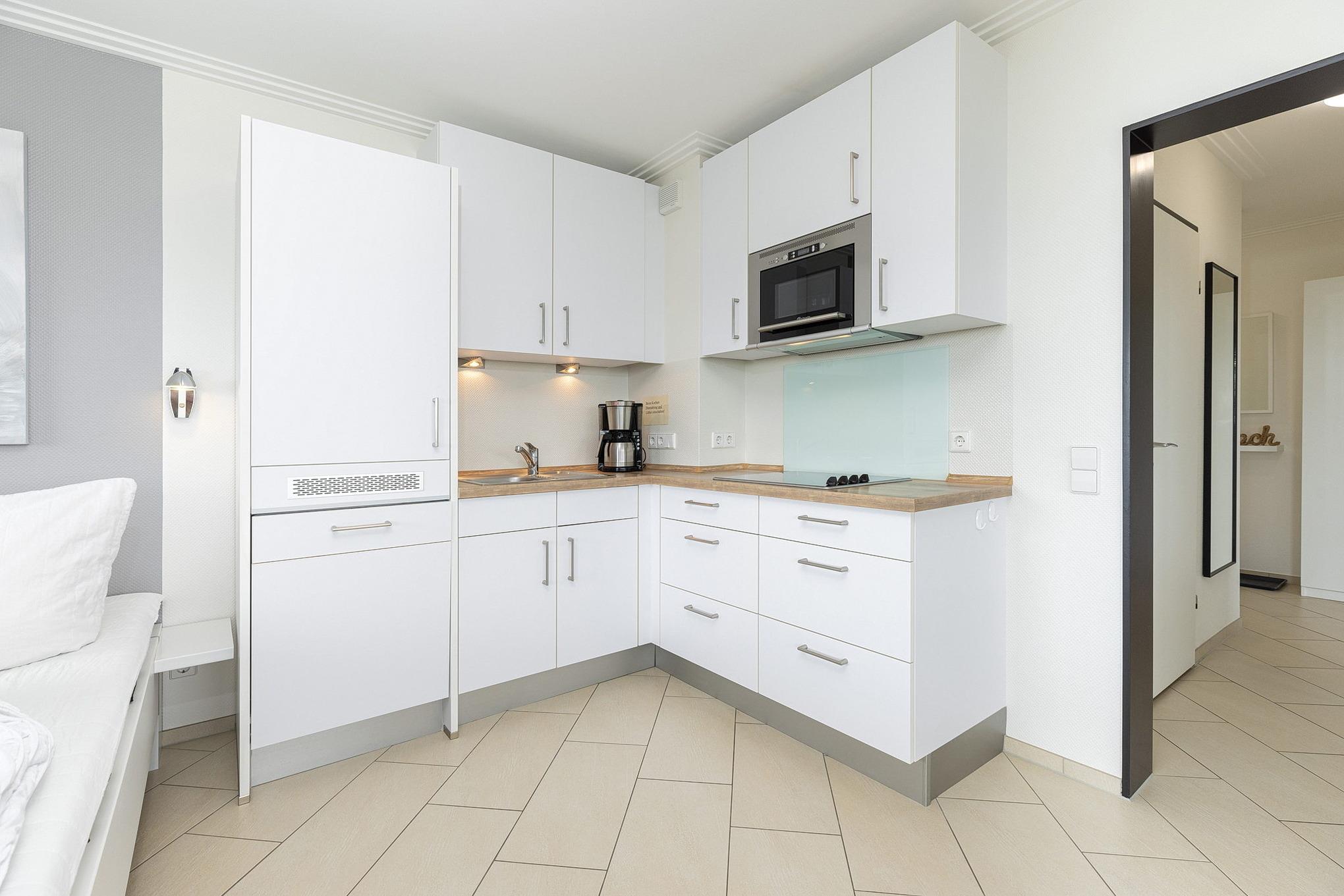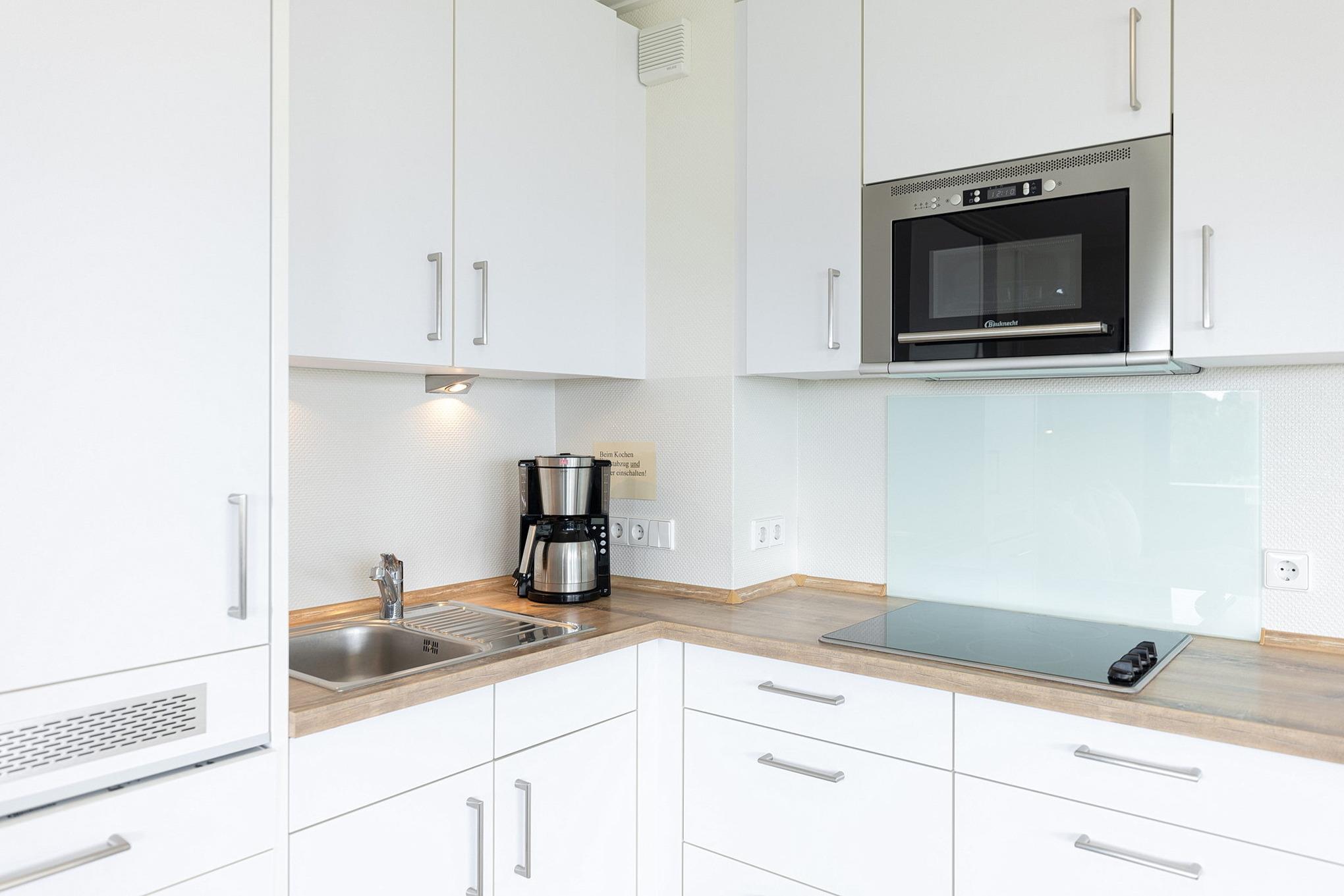 Moderne, zum Wohn- und Esszimmer offen Küche. Die komplett ausgestattete Küche verfügt über ein 4-Platten Cerankochfeld, eine Spülmaschine, einen Kühlschrank mit kleinem 3-Sterne Gefrierfach, eine Mikrowelle, einen Toaster, einen Wasserkocher und eine Kaffeemaschine.