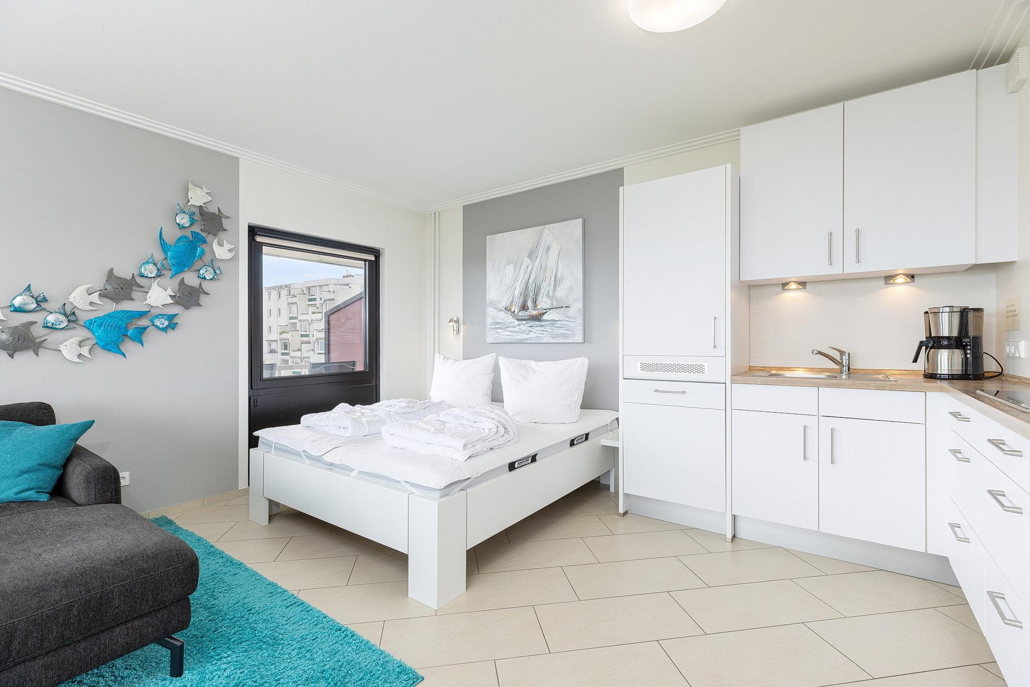 Eine begrenzte Parkmöglichkeit steht am Haus zur Verfügung, Münzwaschmaschinen, Trockner, Aufzug sowie ein Fahrradraum im Haus. Großer, sonniger Eckbalkon in südliche und westliche Richtung mit Blick auf die Ostsee. Kostenloses WLAN.
