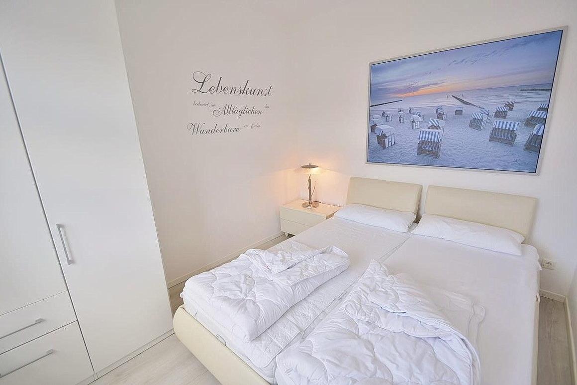 Das Schlafzimmer ist mit einem Doppelbett (2x80x200cm) und einem 2-türigen Kleiderschrank ausgestattet. Das Zimmer ist mit Designer-Planken ausgelegt und lässt sich durch ein Plissee blickdicht verdunkeln.