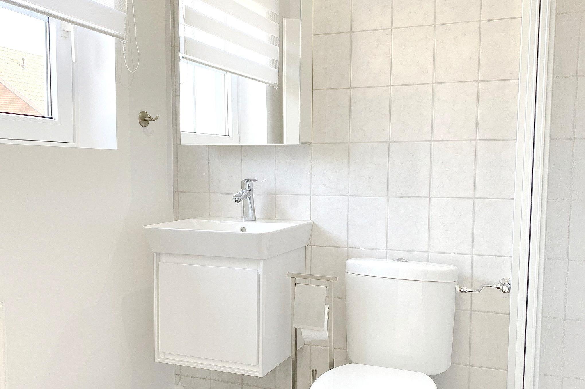 Helles, freundliches Tageslichtbad mit Dusche, WC und Waschbecken.