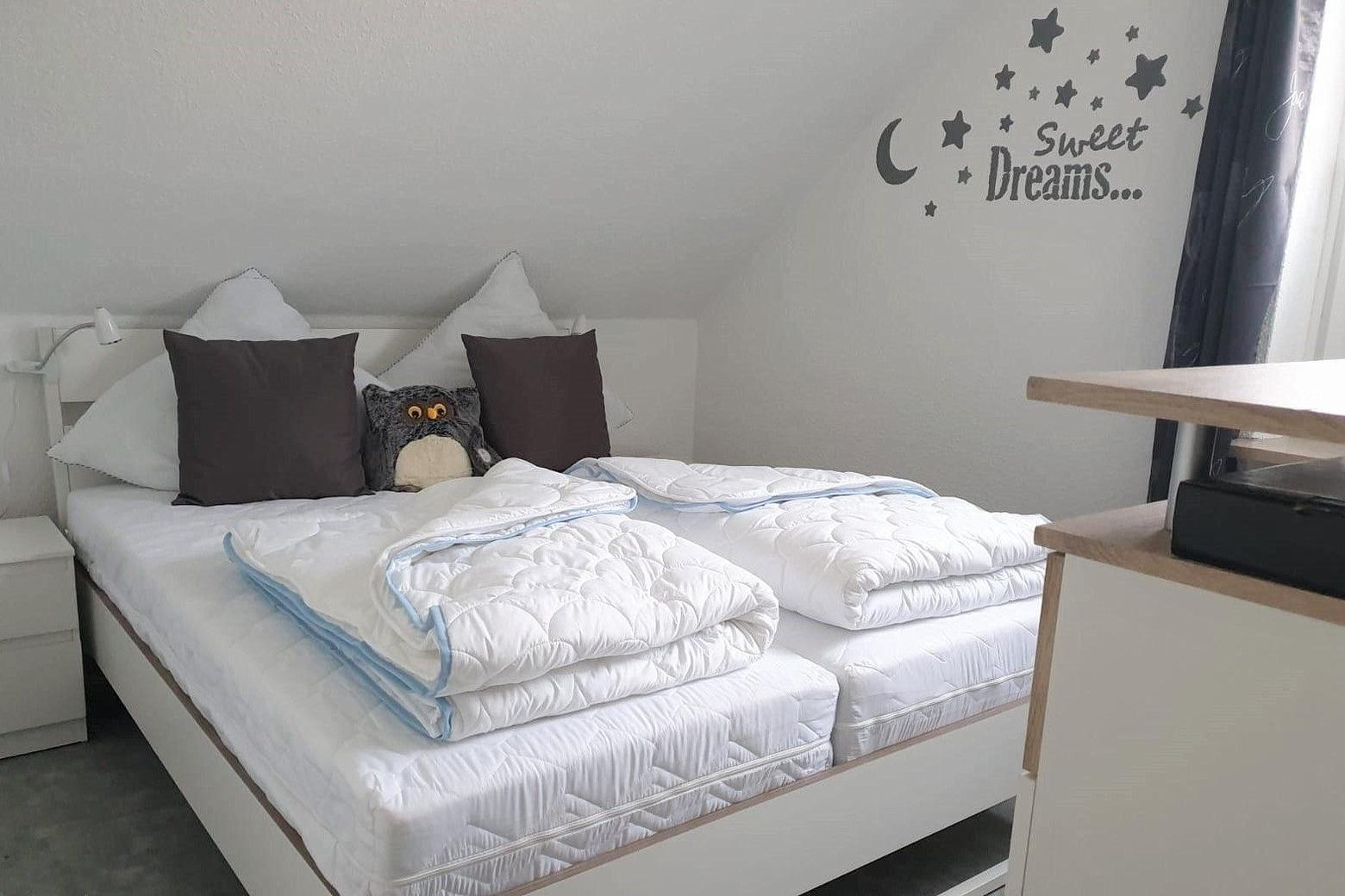 Gemütliches Schlafzimmer mit einem Doppelbett (2x80x200cm) und einem kleinen Kleiderschrank. Der Raum ist mit Vinylboden ausgelegt. Das Fenster lässt sich durch ein Plissee und eine Verdunklungsgardine abdunkeln.