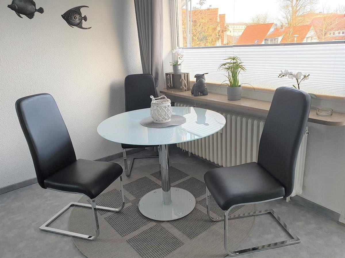 Lichtdurchflutetes Wohnzimmer mit sonnigem Süd-Balkon. Das Zimmer ist ausgestattet mit einer Schlafcouch, einem Couchtisch, einer Kommode und einem Esstisch mit 3 Stühlen. Zur Unterhaltung stehen ein Flachbild-TV (Kabelanschluss) und eine Stereoanlage zur Verfügung. Der Raum ist mit Vinylboden ausgelegt. Die Fenster lassen sich durch Vorhänge verdunkeln