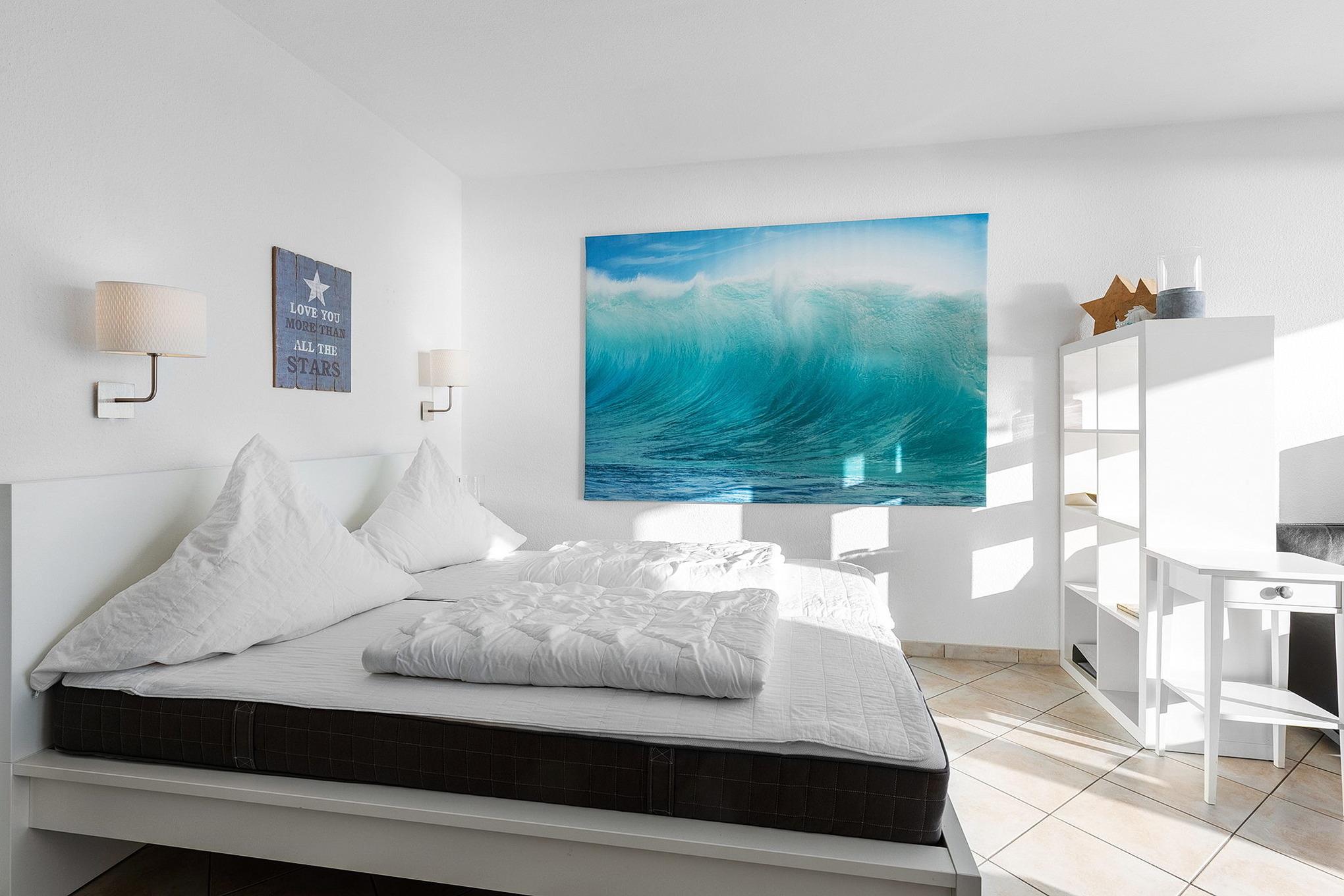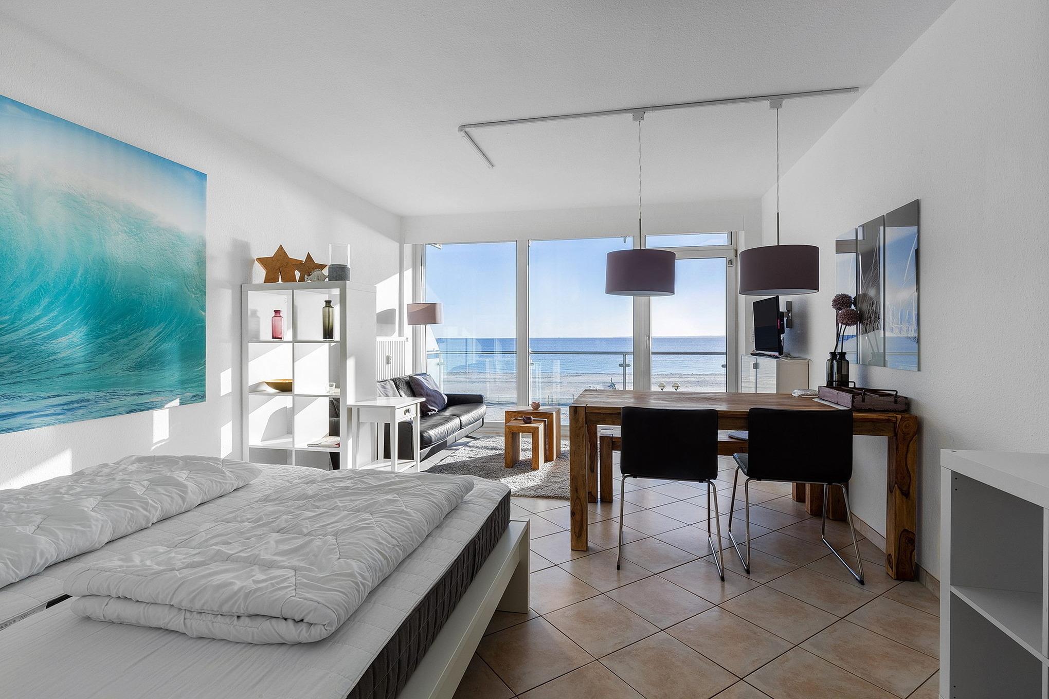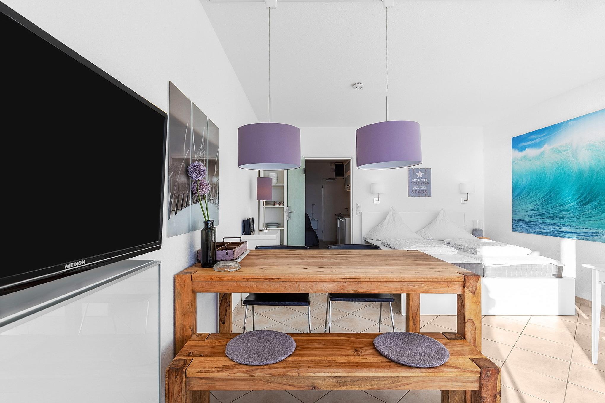 Modern eingerichtetes, helles, freundliches Wohn- und Schlafzimmer mit direktem Zugang zum Balkon. Das Wohn- und Schlafzimmer ist mit einem Essplatz für 4 Personen, einer Ledercouch, einem Couchtisch, einem Regal und einem Doppelbett (2x 80x200cm) ausgestattet. Ein Schlafsessel (80x200cm), sowie ein 4-türiger Kleiderschrank befinden sich im Vorraum der Wohnung. Zur Unterhaltung stehen ein Flachbildfernseher, ein DVD-Player und ein Radiorecorder mit CD-Player zur Verfügung. Das Wohn- und Schlafzimmer ist gefliest. Die Fenster lassen sich durch Vorhänge und Plissees vollständig verdunkeln.