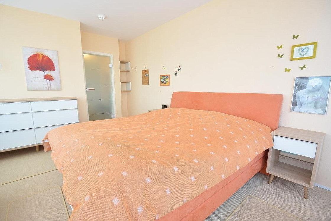 Helles, freundliches Schlafzimmer mit einem Doppelbett (180x200cm), einer großen Kommode und 2 Nachttischen ausgestattet. Das Schlafzimmer ist mit Teppichboden ausgelegt, die Fenster lassen sich durch Außenrollos vollständig verdunkeln. Vom Schlafzimmer direkten Zugang zum Balkon.