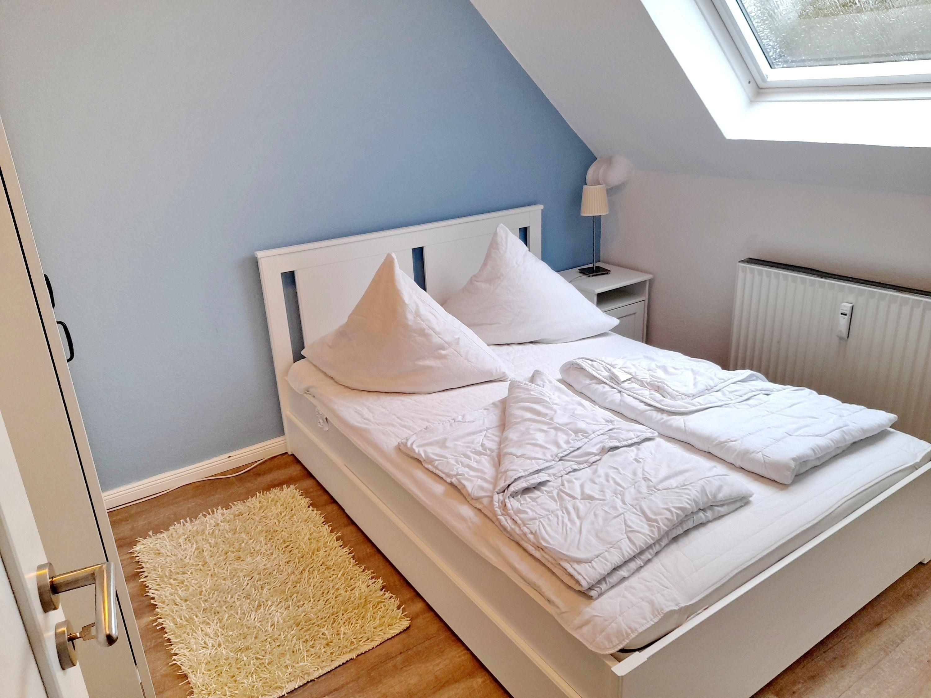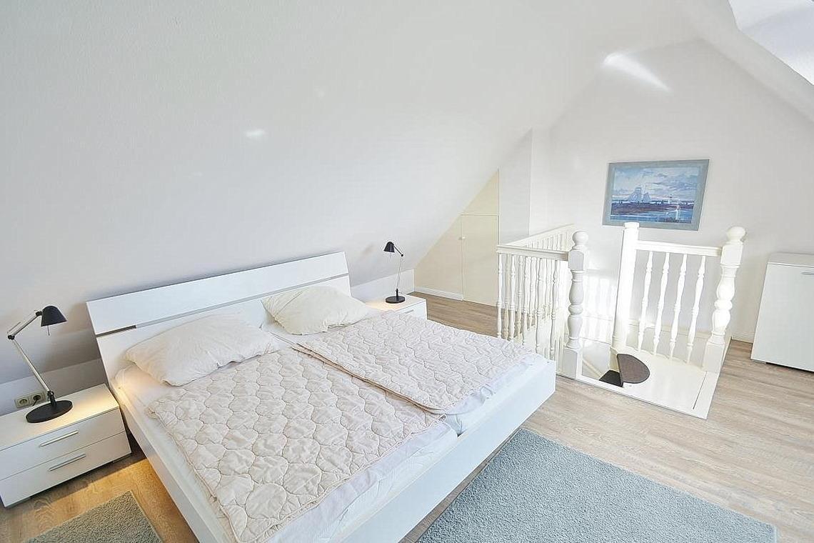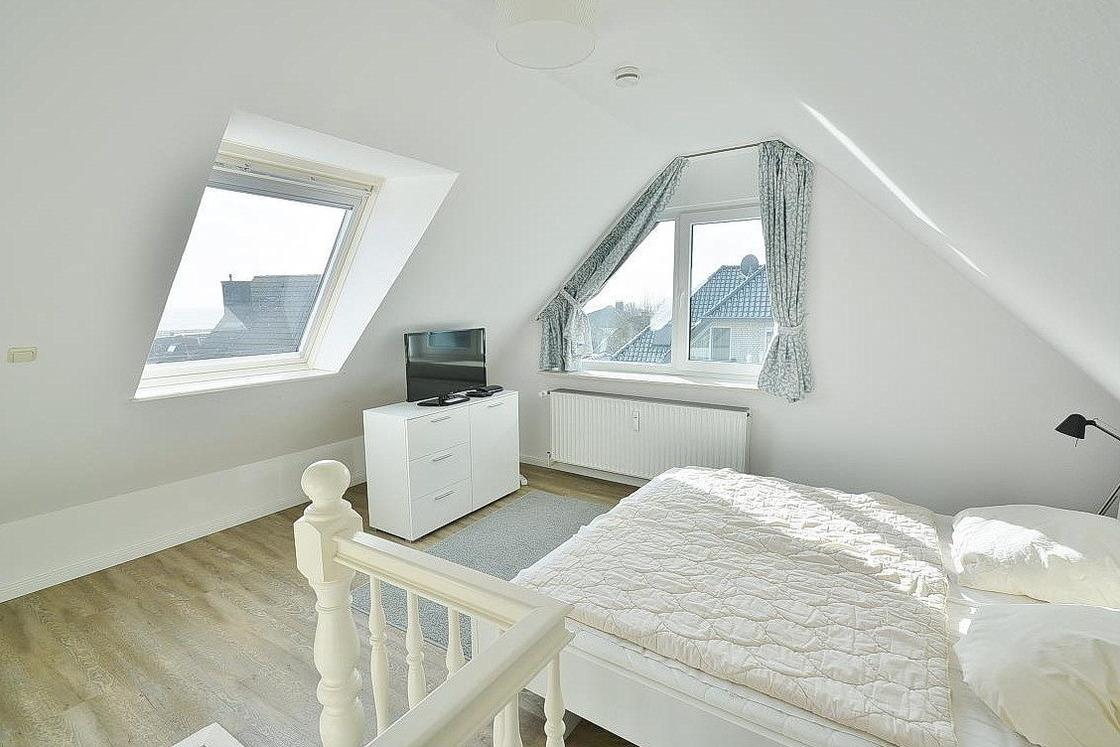 Das Schlafzimmer im 2. OG ist über eine Wendeltreppe erreichbar. Das Schlafzimmer ist mit einem Doppelbett (2x 90x200cm) und 2 Kommoden ausgestattet. Die Fenster lassen sich durch ein Innenrollo bzw. einem blickdichten Vorgang fast vollständig verdunkeln. Das Zimmer ist mit Vinylboden ausgelegt. Zur Unterhaltung steht ein Fernseher ( nur öffentlich rechtliche Sender) zur Verfügung.