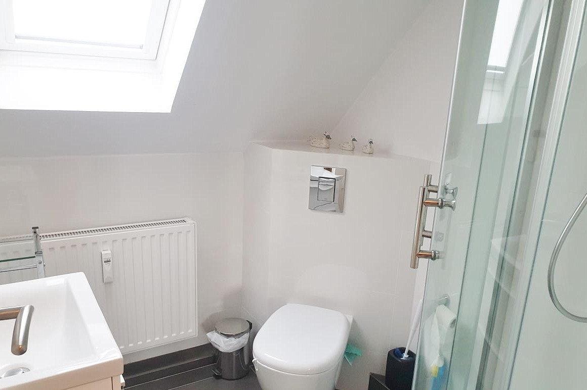 Baulich bedingt fällt das helle, freundliche Tageslichtbad eher klein und die Dusche schmal aus. Des Weiteren verfügt das Bad über ein WC und ein Waschbecken.