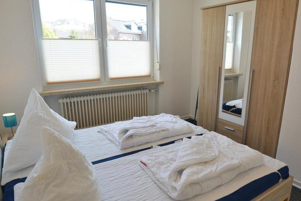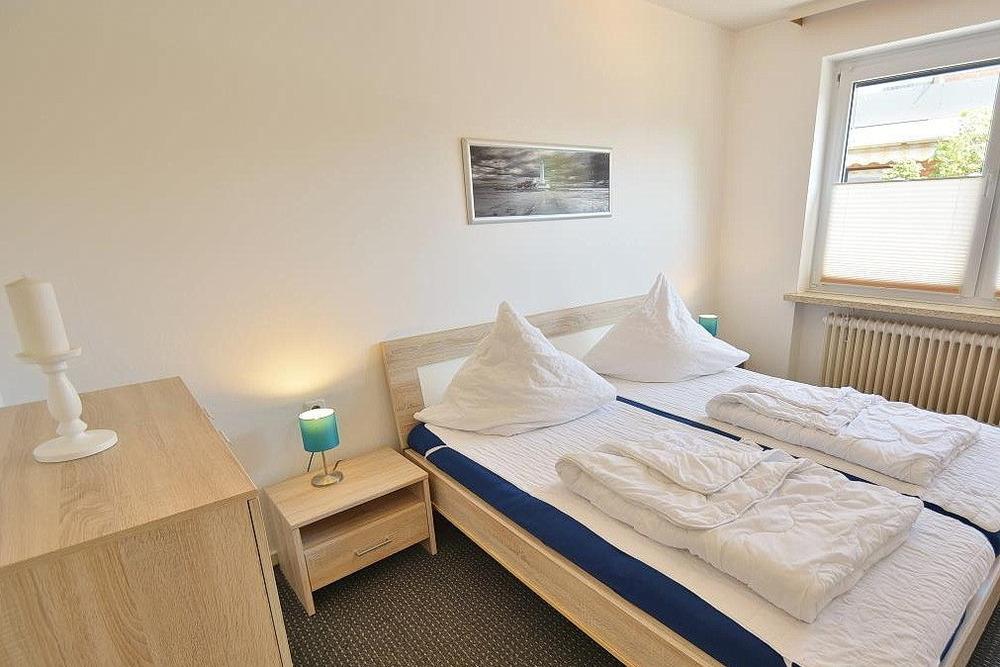 Das mit Teppichboden ausgelegte Schlafzimmer ist mit einem Doppelbett (2x90x 200cm) und einem großen Kleiderschrank ausgestattet. Das Fenster lässt sich durch ein Außenrollo verdunkeln.