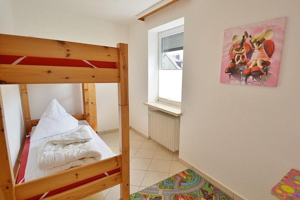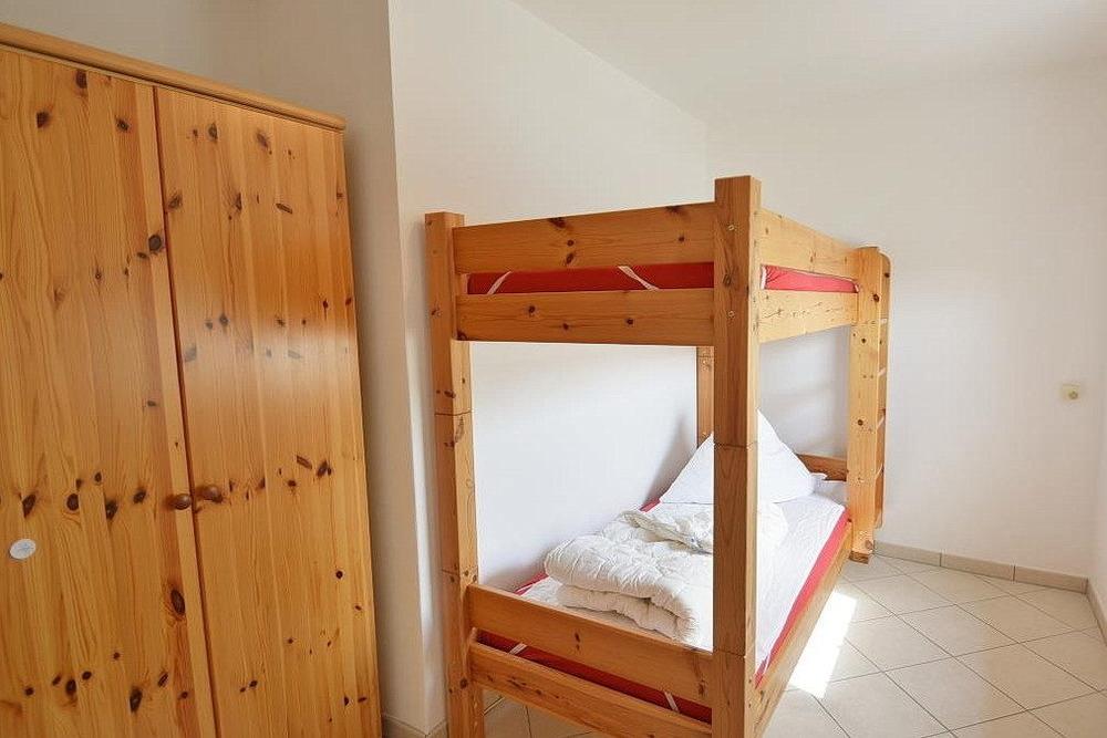 Gefliestes, freundliches Kinderzimmer mit Etagenbett (90 x 200cm) und Kleiderschrank. Das Fenster lässt sich durch ein Außenrollo verdunkeln.