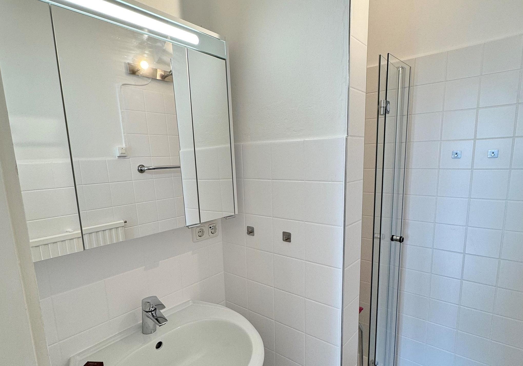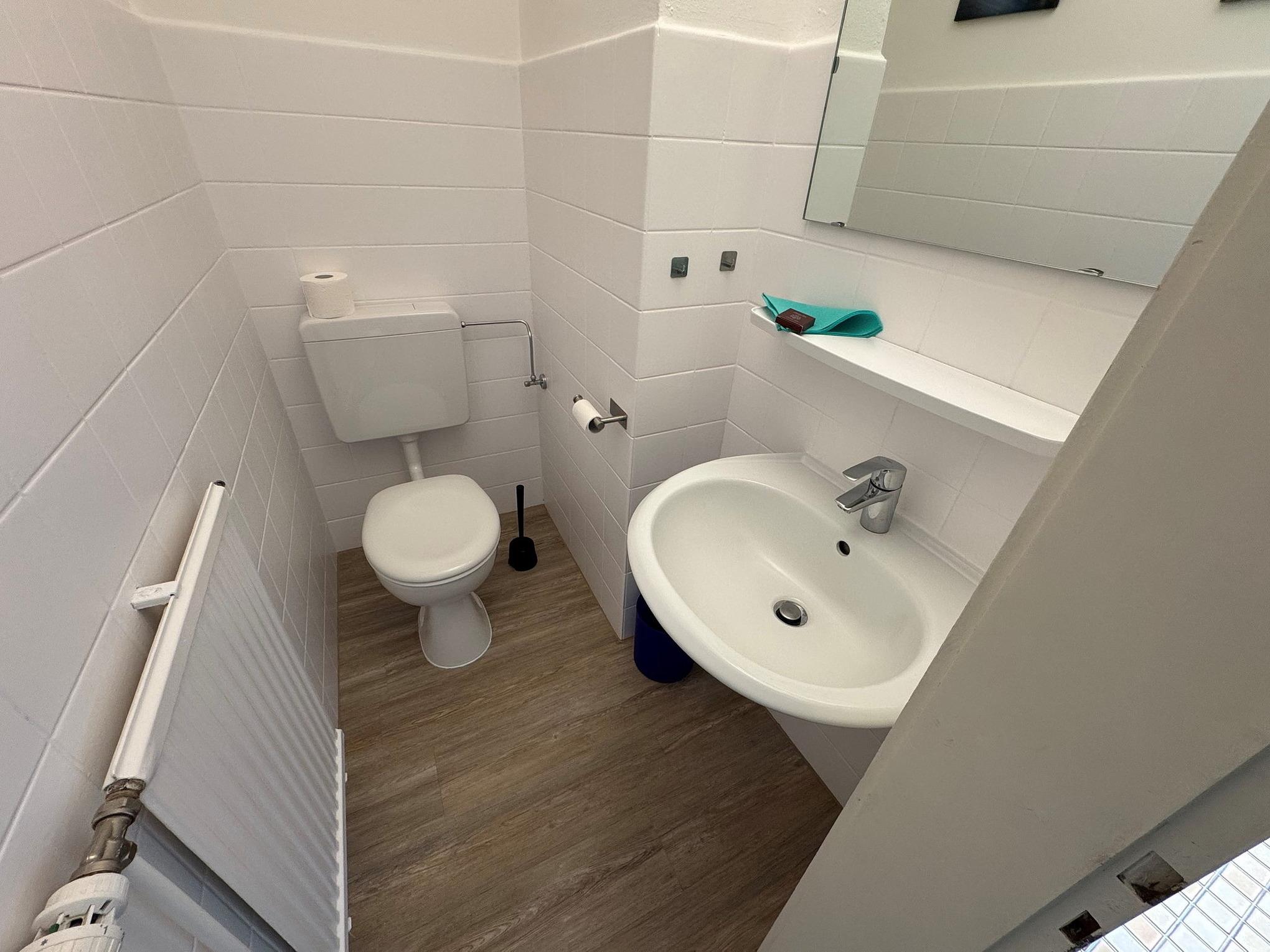Gefliestes Bad mit Dusche und Waschbecken. Separates WC mit Waschbecken.