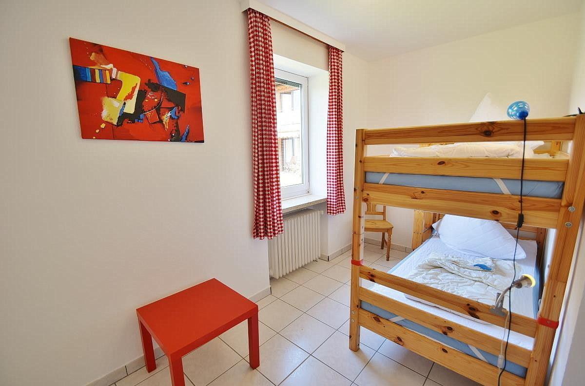 Gefliestes, freundliches Kinderzimmer mit Etagenbett (90 x 200cm) und Kleiderschrank. Das Fenster lässt sich durch ein Außenrollo verdunkeln.