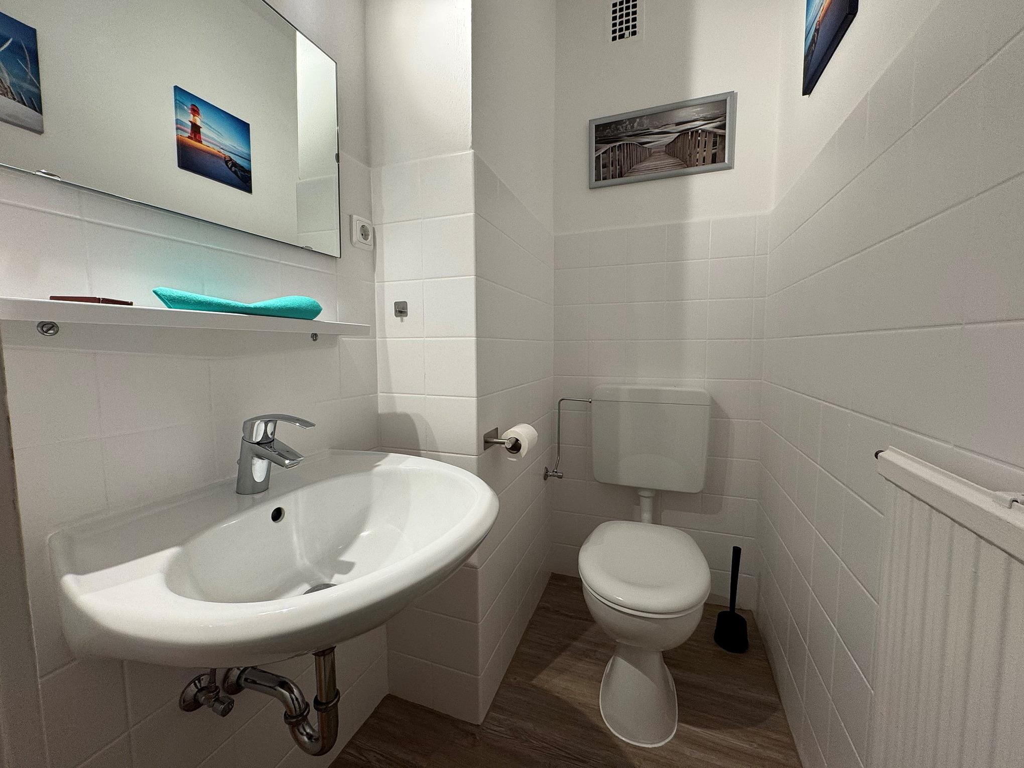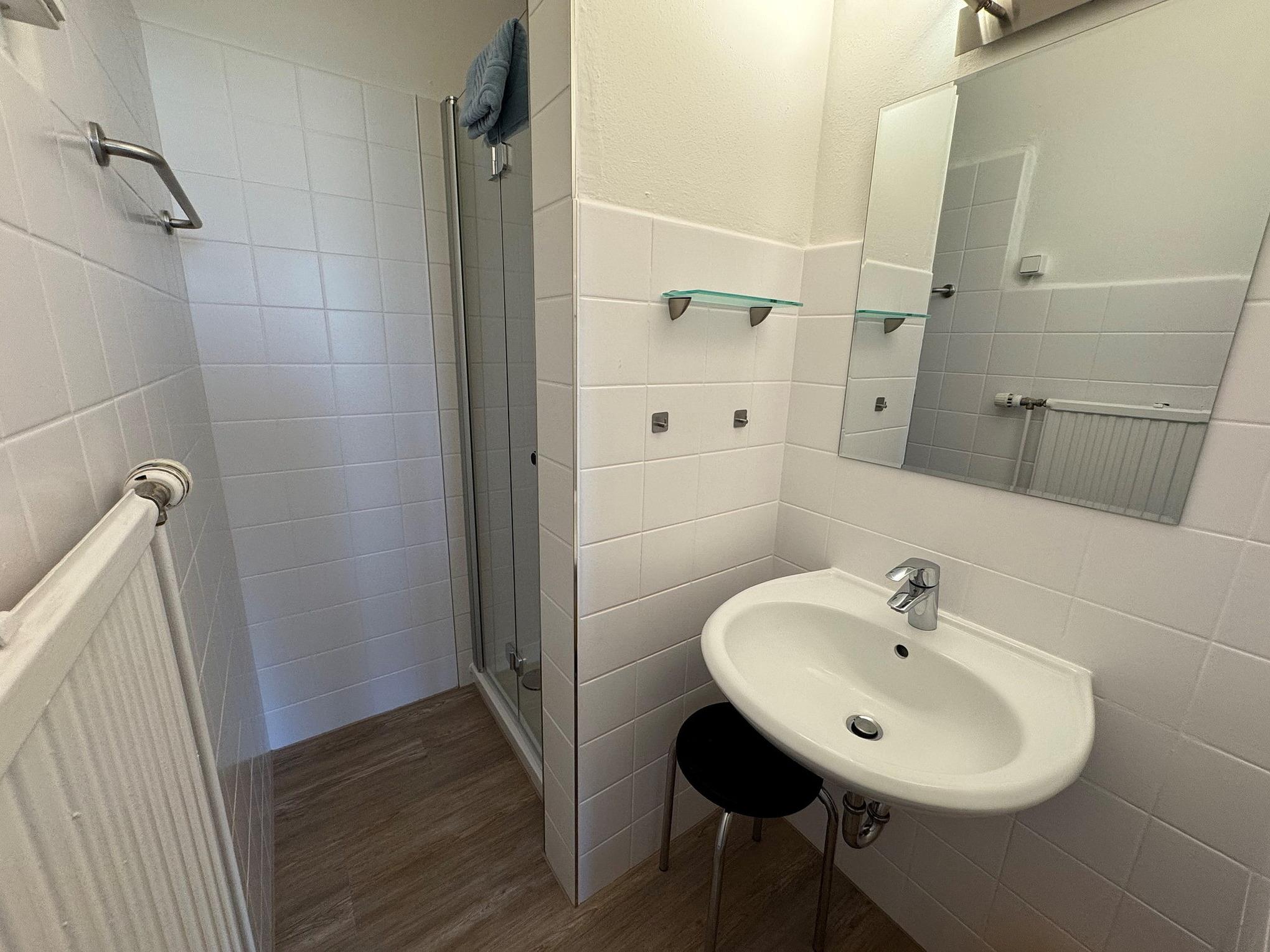 Gefliestes Bad mit Dusche und Waschbecken. Separates WC mit Waschbecken.