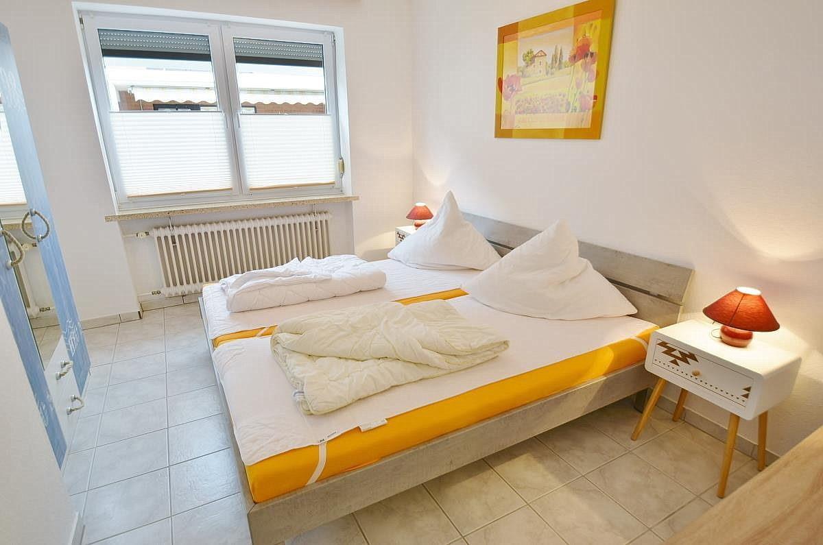 Gefliestes Schlafzimmer mit einem Doppelbett (2x 100 x 200cm) und einem großen Kleiderschrank ausgestattet. Das Fenster lässt sich durch ein Außenrollo verdunkeln.